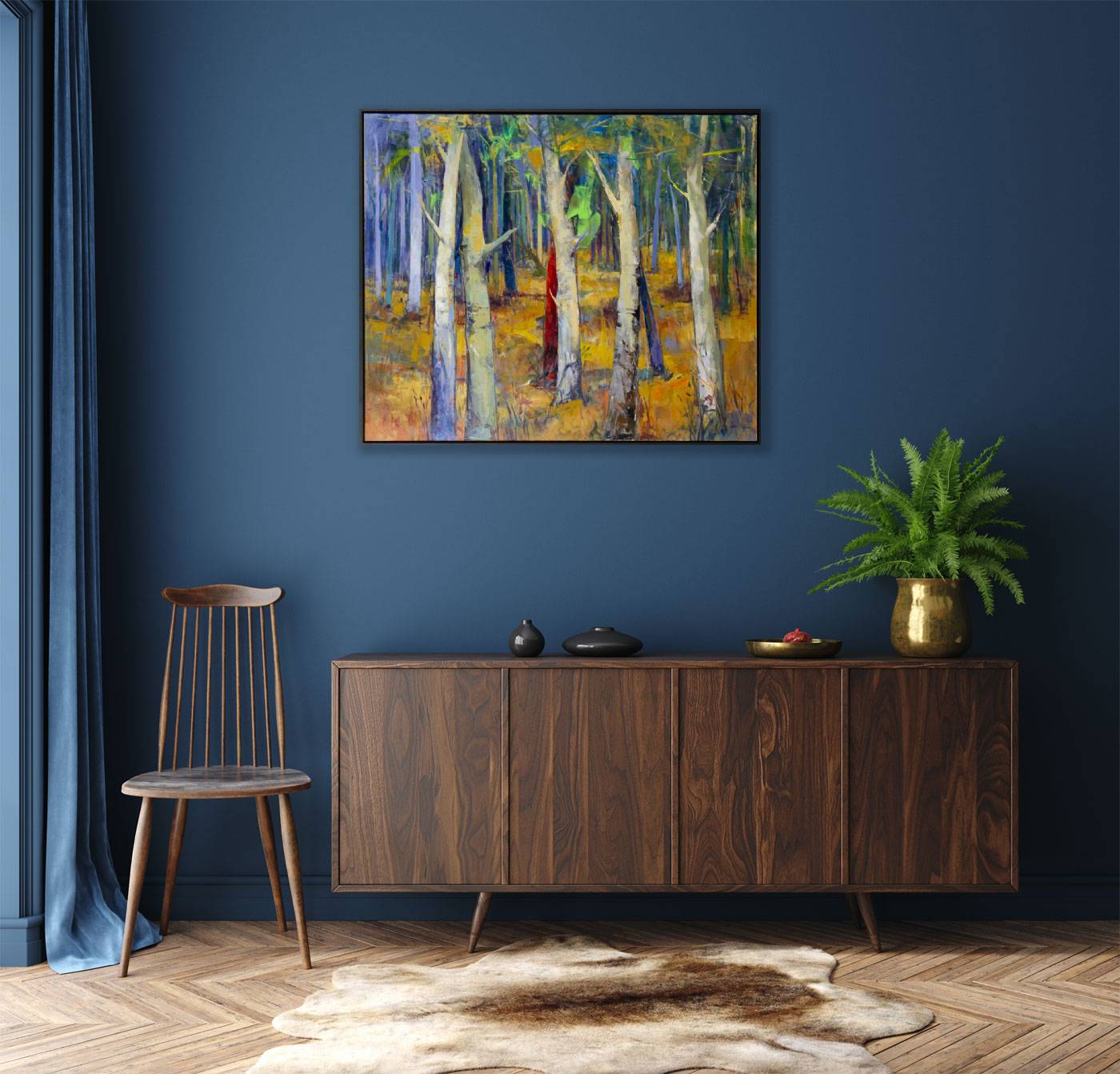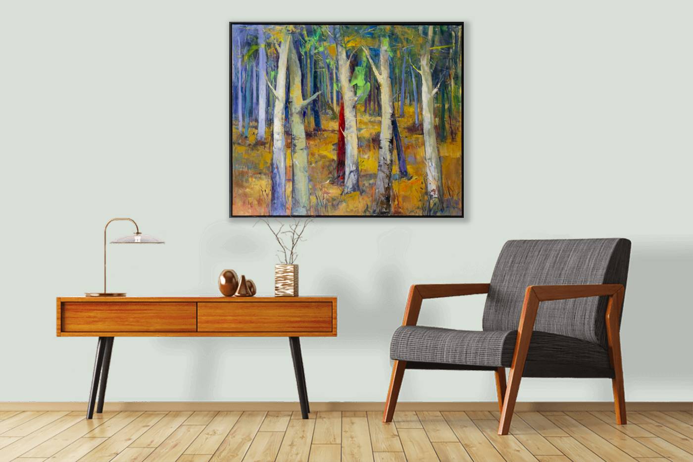 Beautiful woodland scene featuring silver birch trees and a wondrous blend of colours by Italian artist Sara Malfer. This original oil painting on canvas is presented in a contemporary style black floating frame and ready to hang. The perfect statement piece to introduce some colour to a room.
