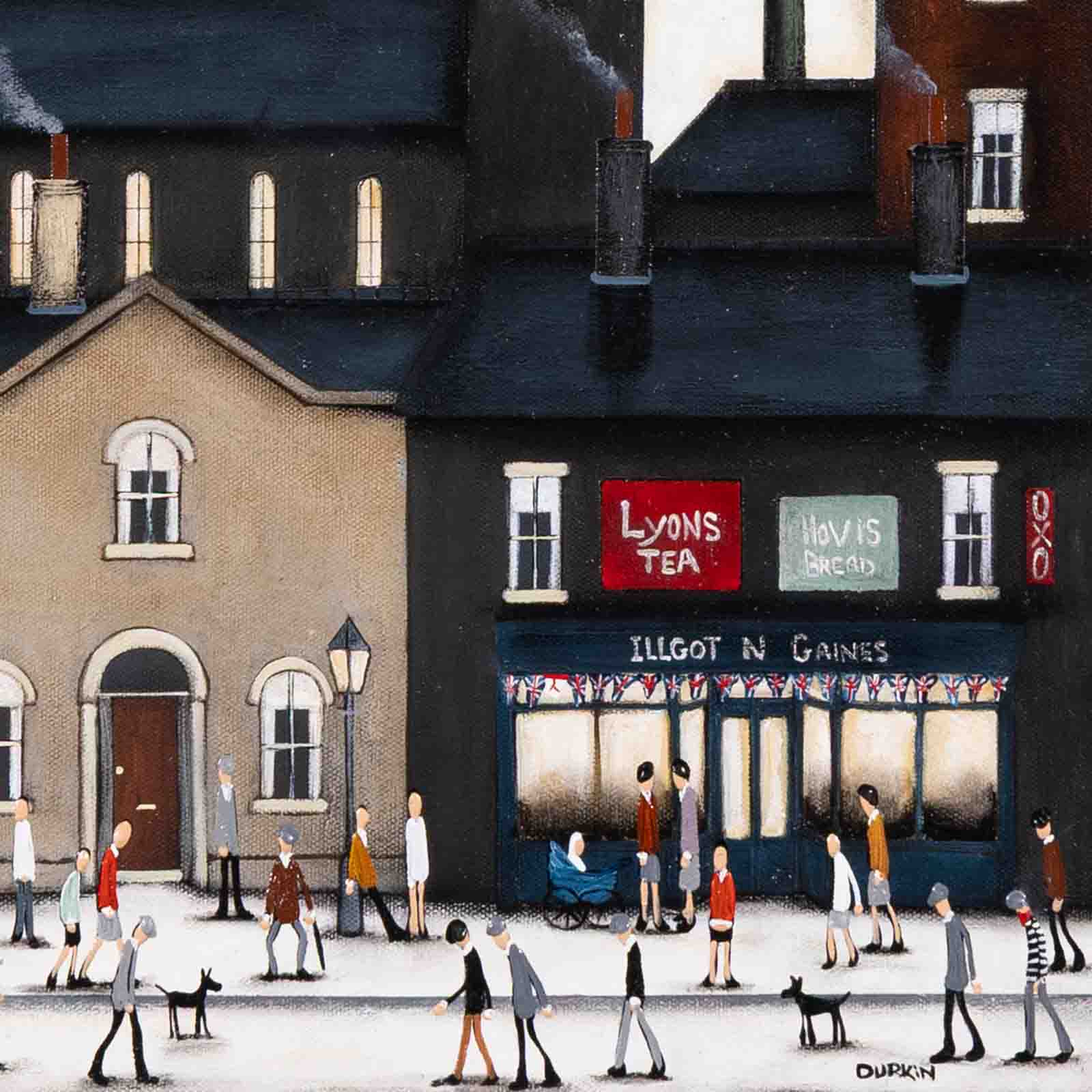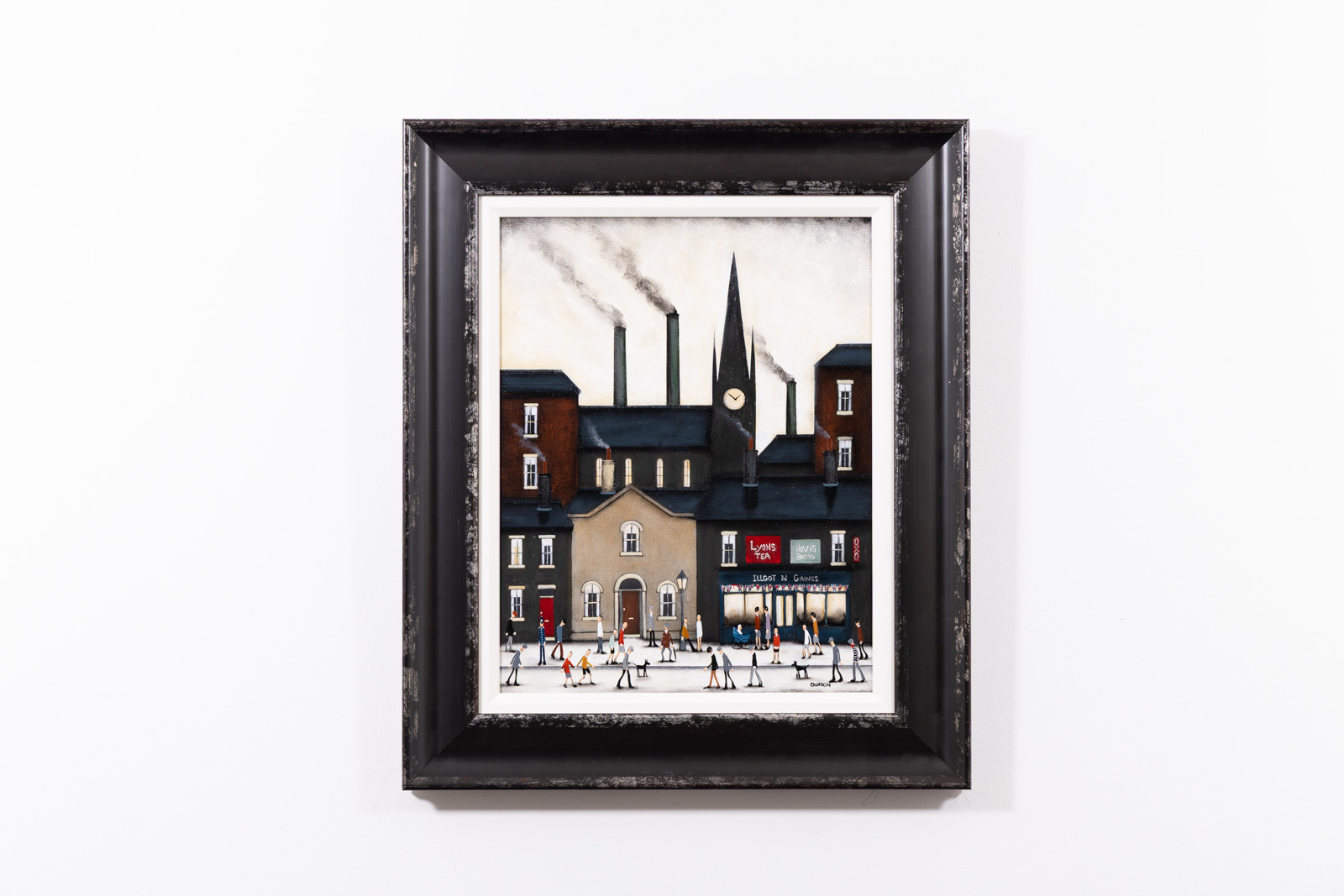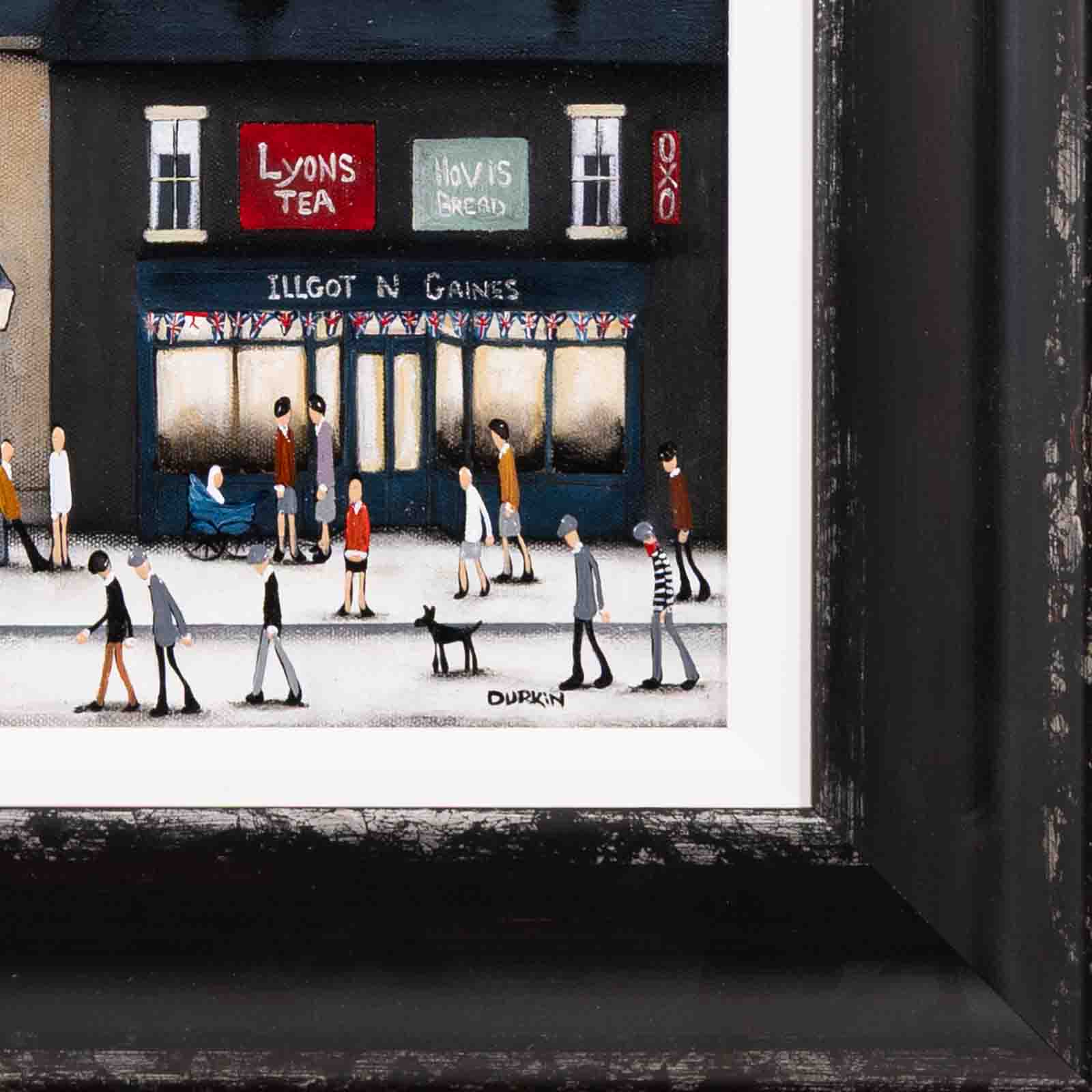 Classic style street scene by the collectable and talented British artist Sean Durkin. Framed in an off-white slip and bespoke dark frame as shown and ready to hang. Sean’s trademark policeman and robber figures also feature as a nod to his father’s escapades (read Sean’s bio for more info).
