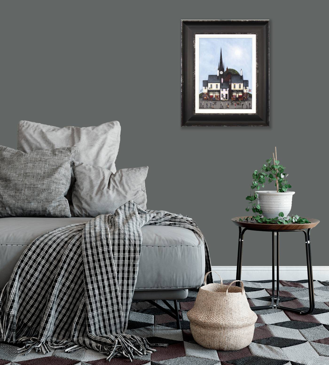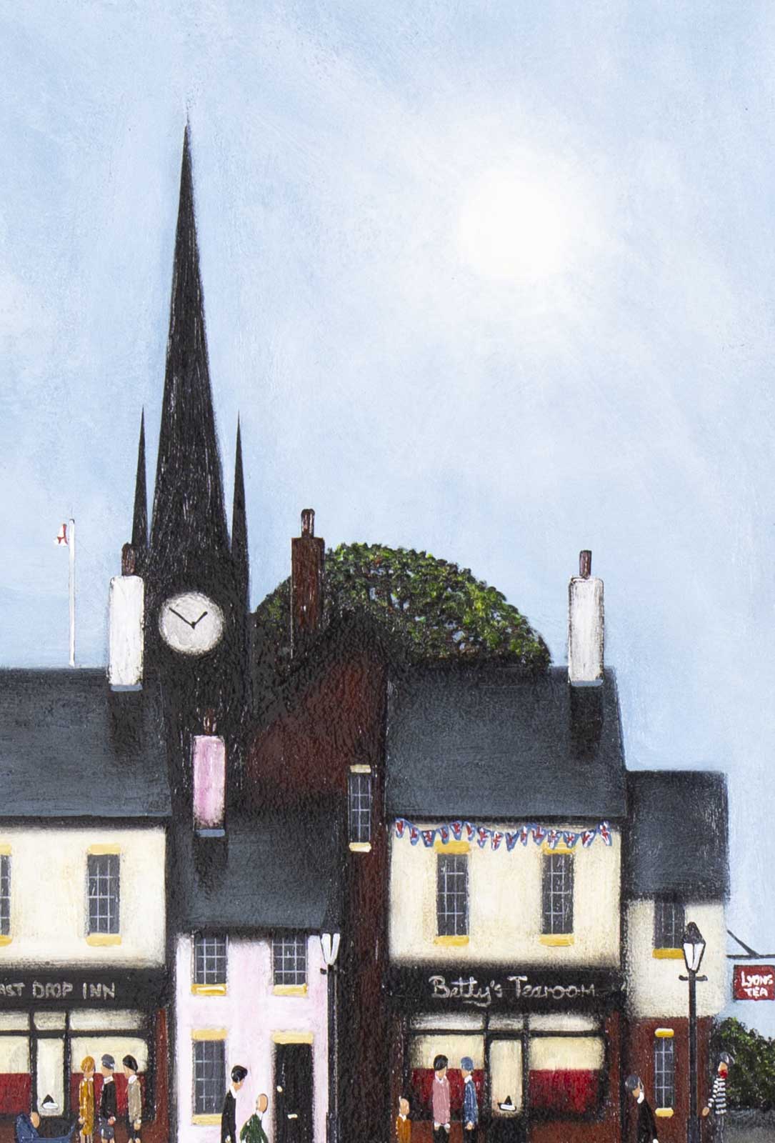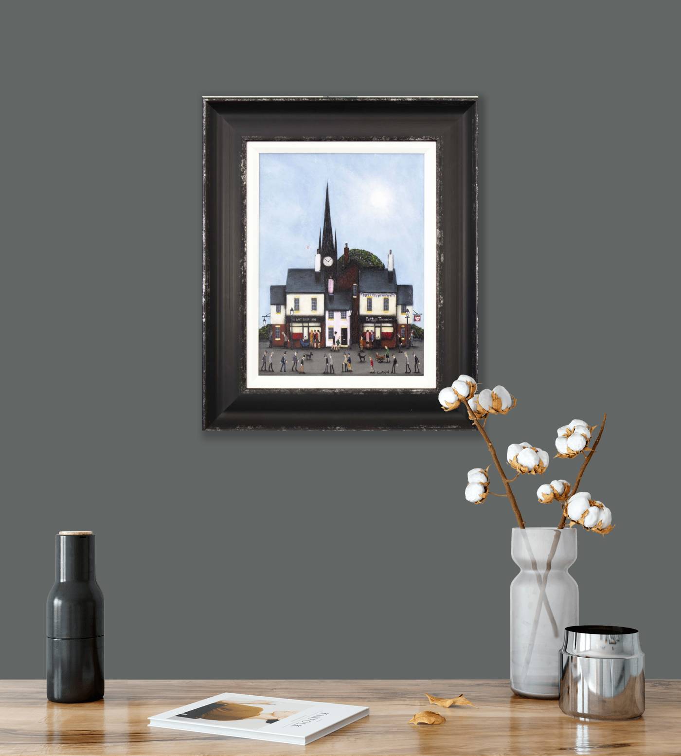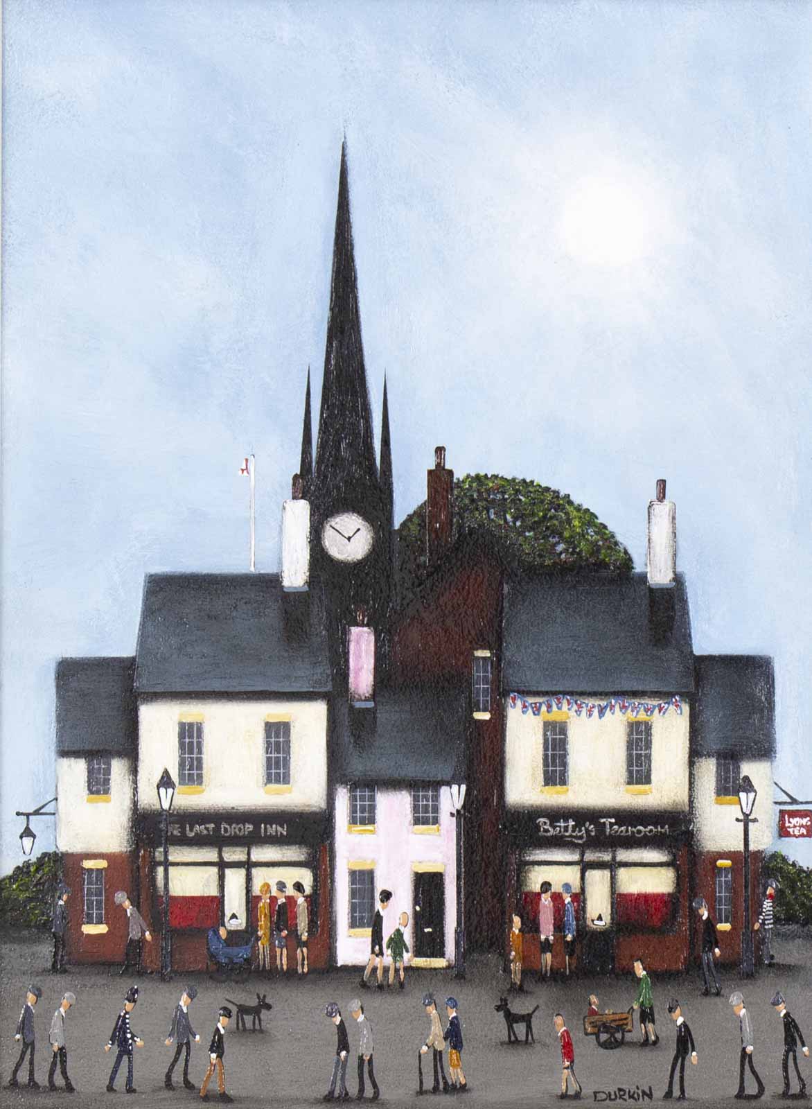 New style street scene by the collectable and talented British artist Sean Durkin. Framed in an off-white slip and bespoke dark frame as shown and ready to hang. Sean’s trademark policeman and robber figures also feature as a nod to his father’s escapades (read Sean’s bio for more info).