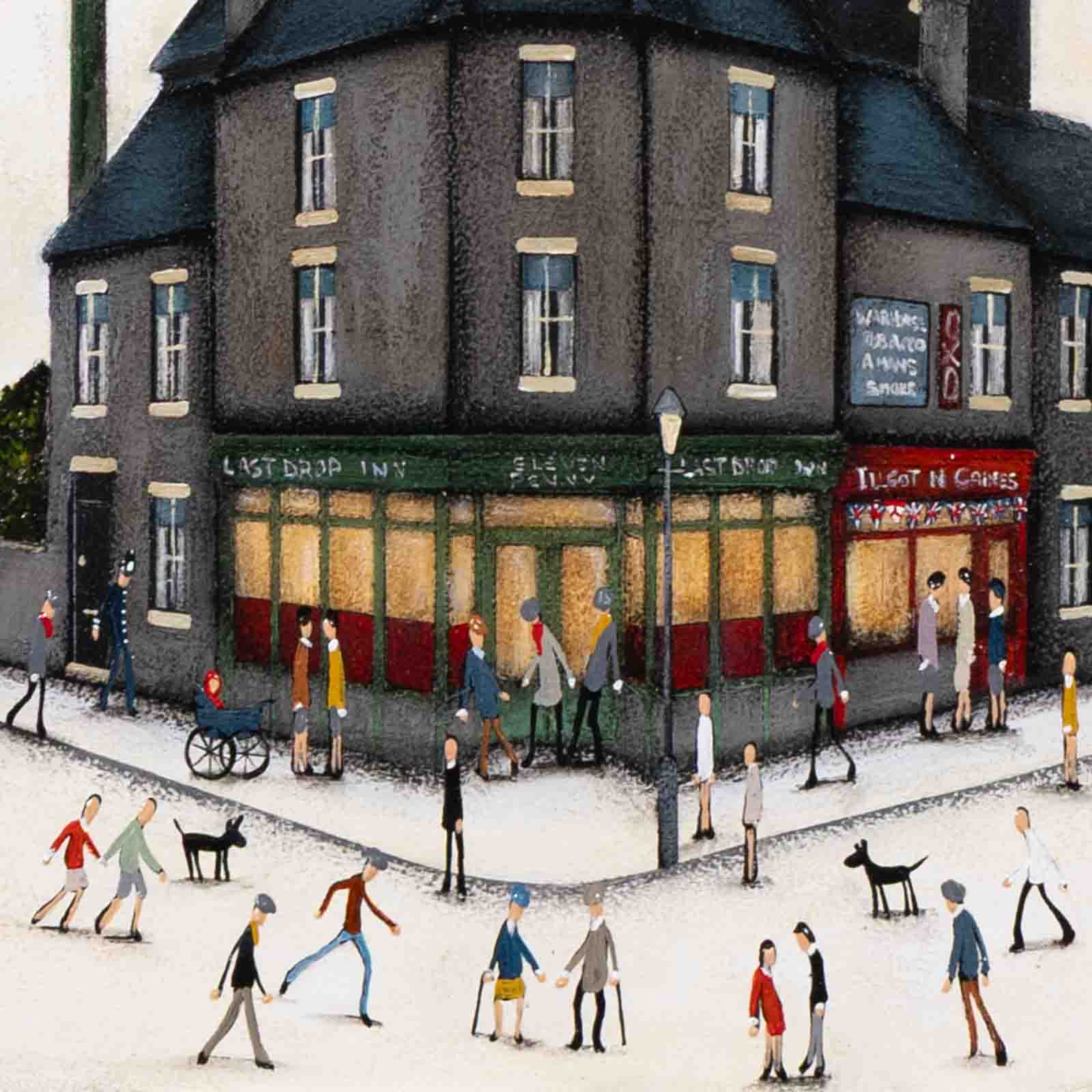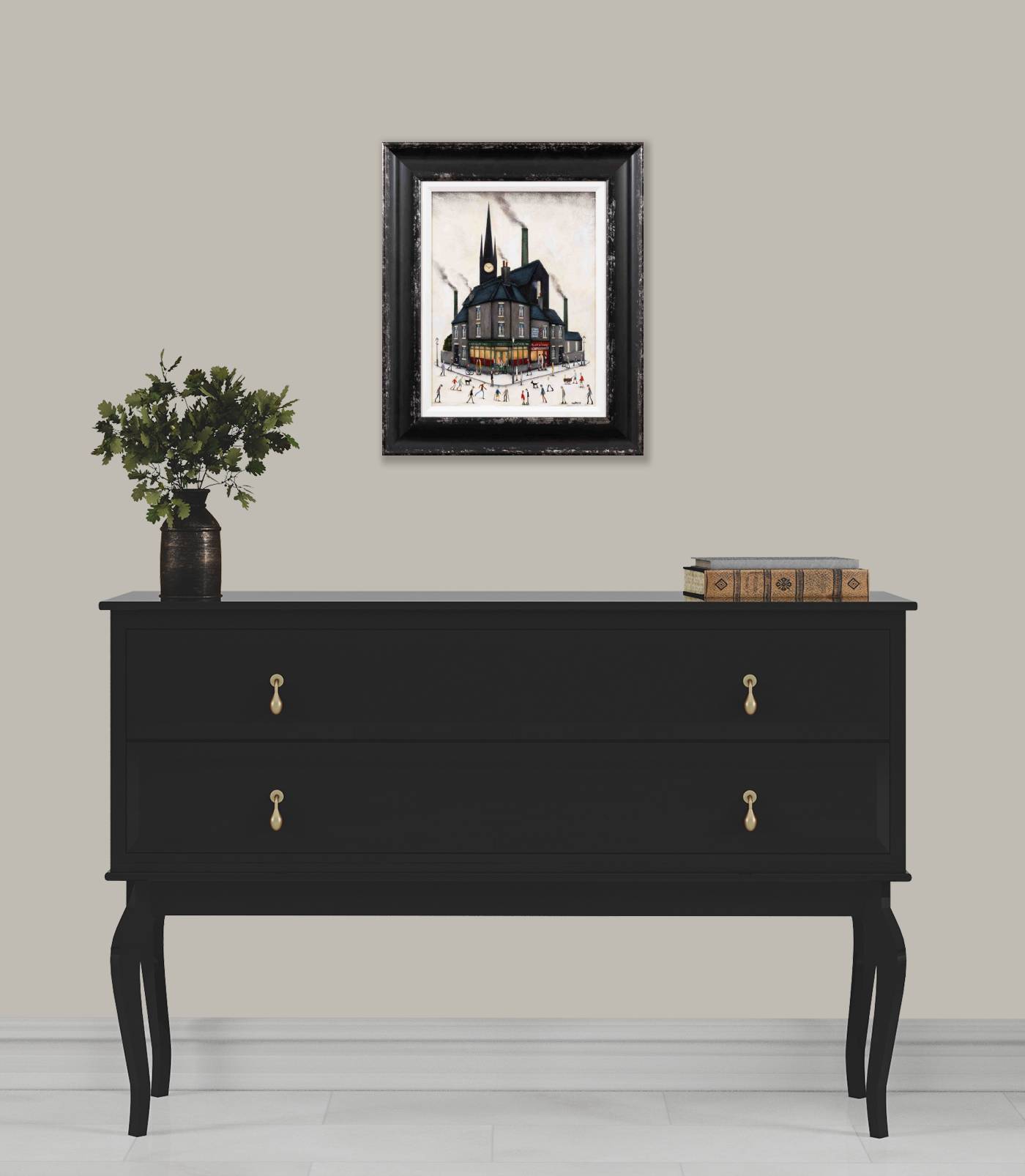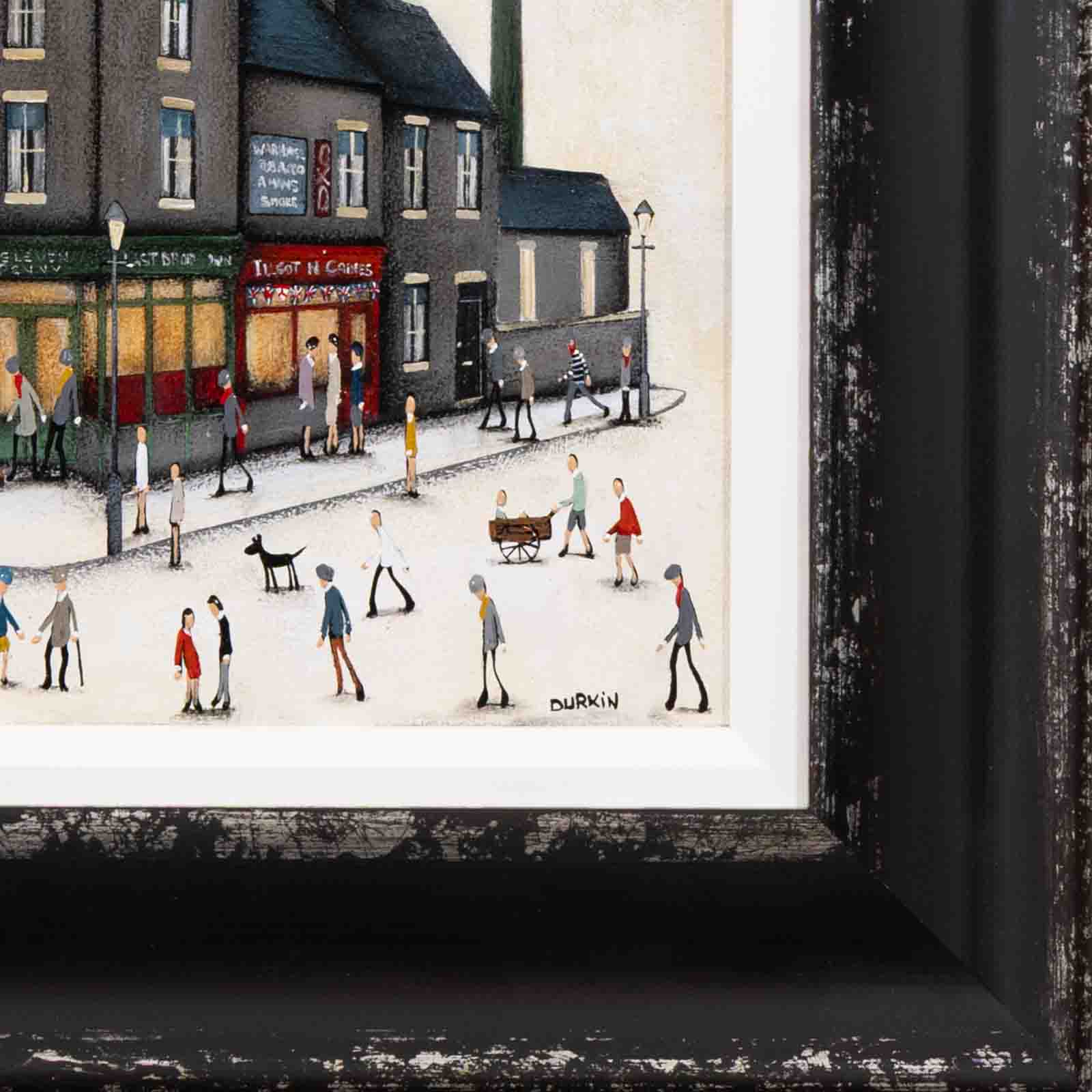 Classic style street scene by the collectable and talented British artist Sean Durkin. Framed in an off-white slip and bespoke dark frame as shown and ready to hang. Sean’s trademark policeman and robber figures also feature as a nod to his father’s escapades (read Sean’s bio for more info).