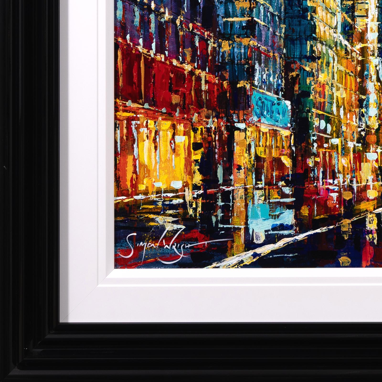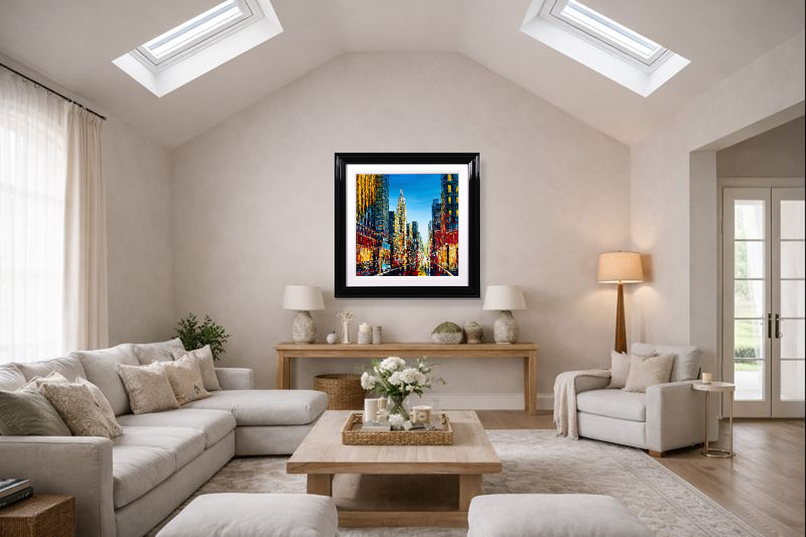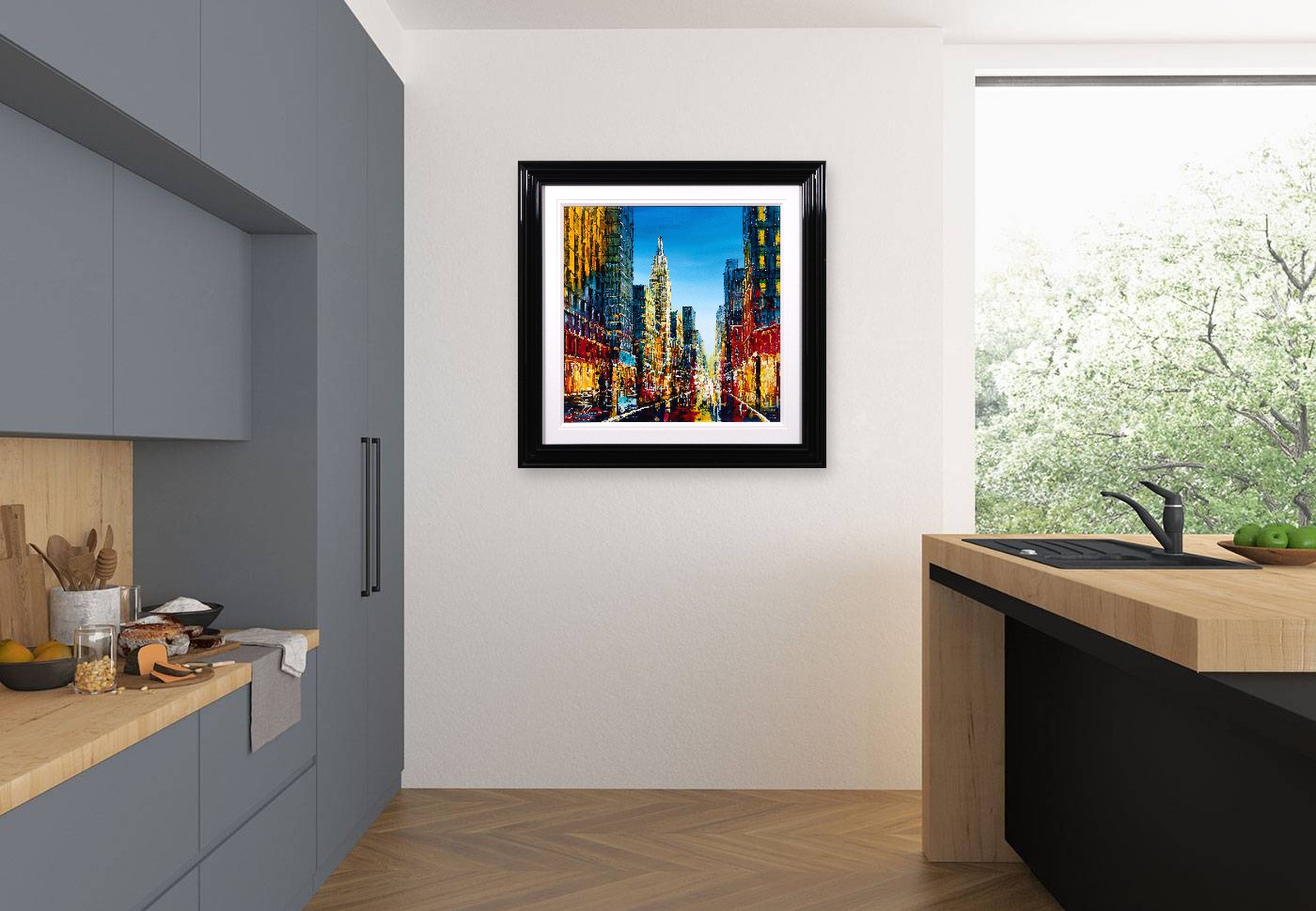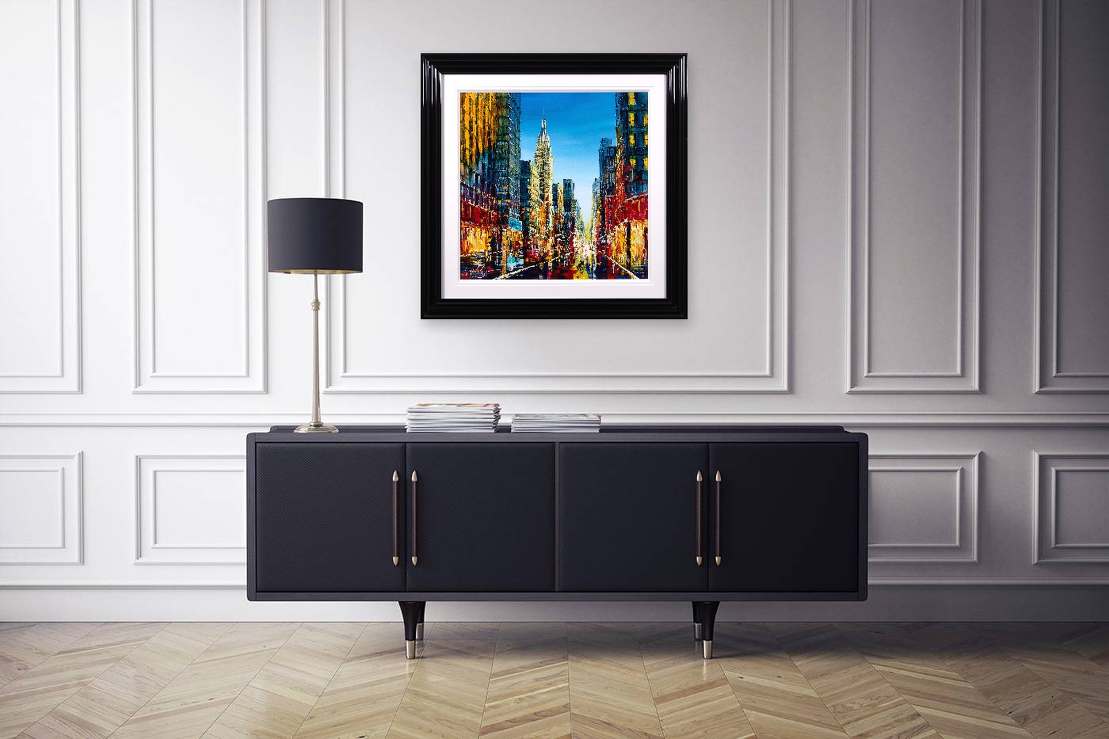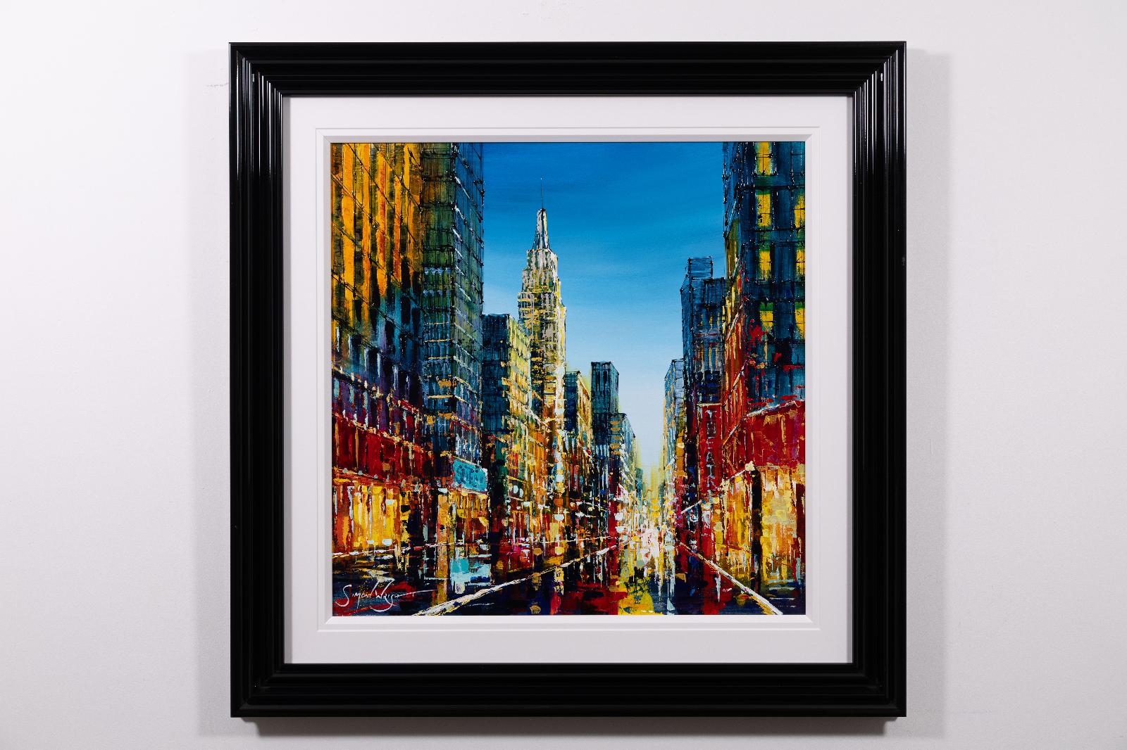 A bold, colourful New York City cityscape by British artist Simon Wright, presented with a wide white slip and sculpted gloss black frame for a sleek, contemporary look.