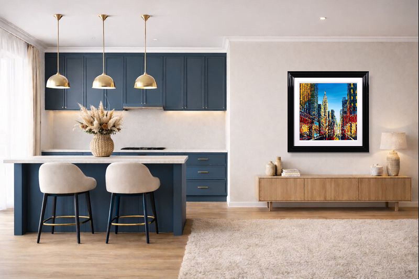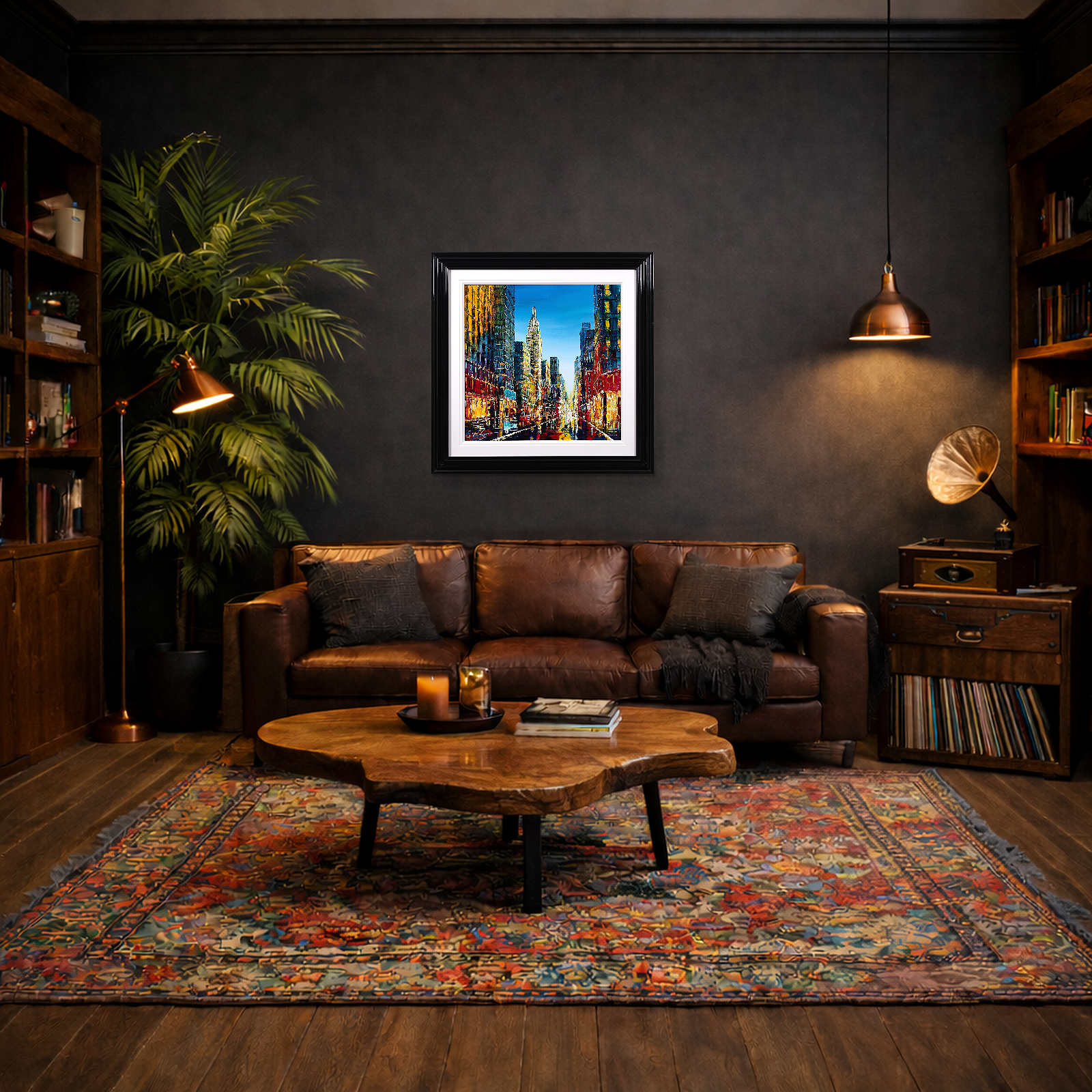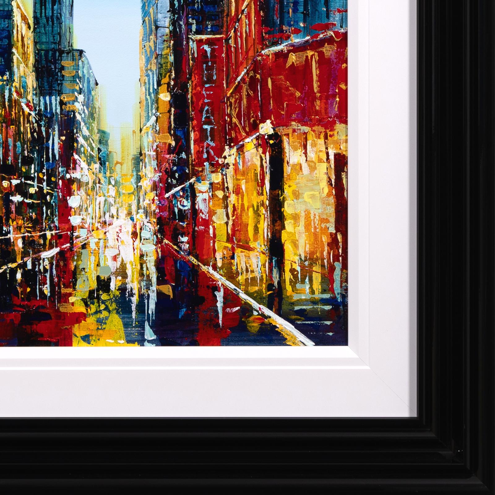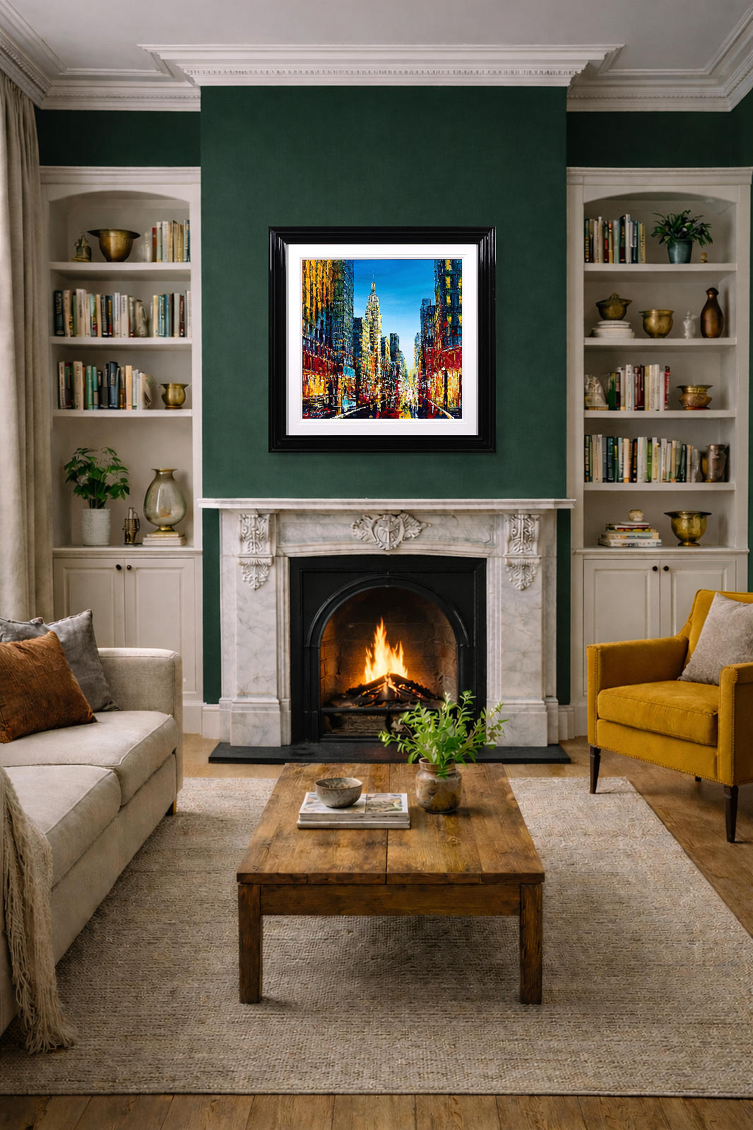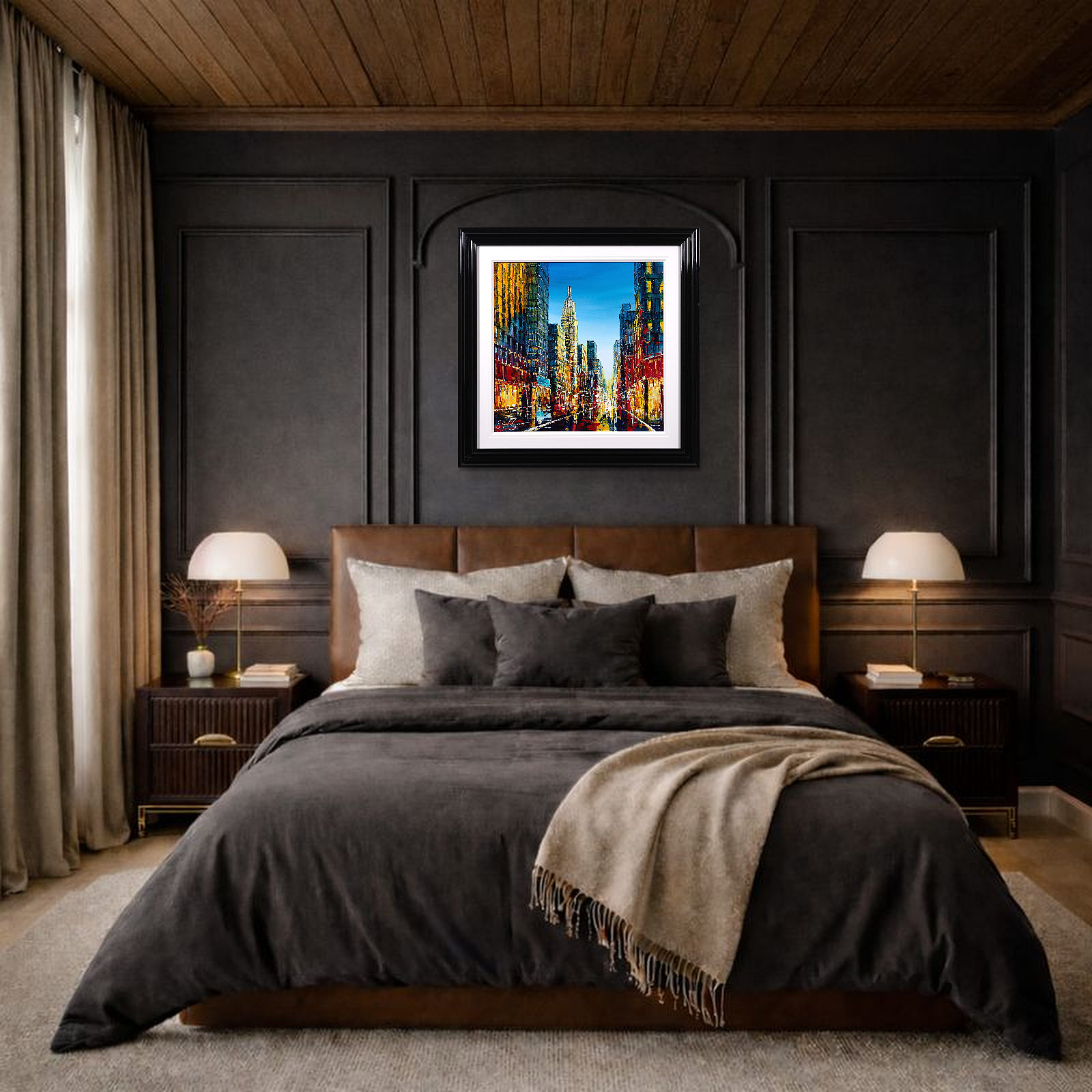 A bold, colourful New York City cityscape by British artist Simon Wright, presented with a wide white slip and sculpted gloss black frame for a sleek, contemporary look.