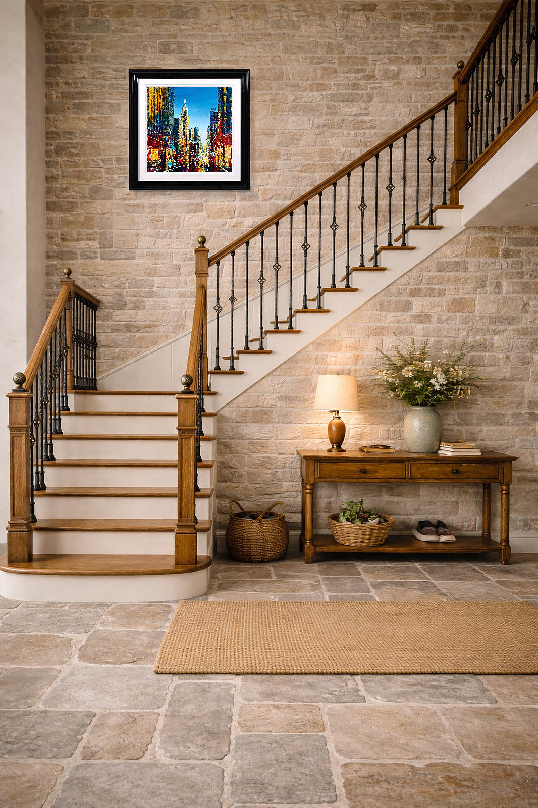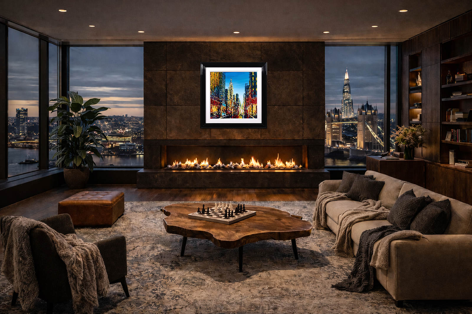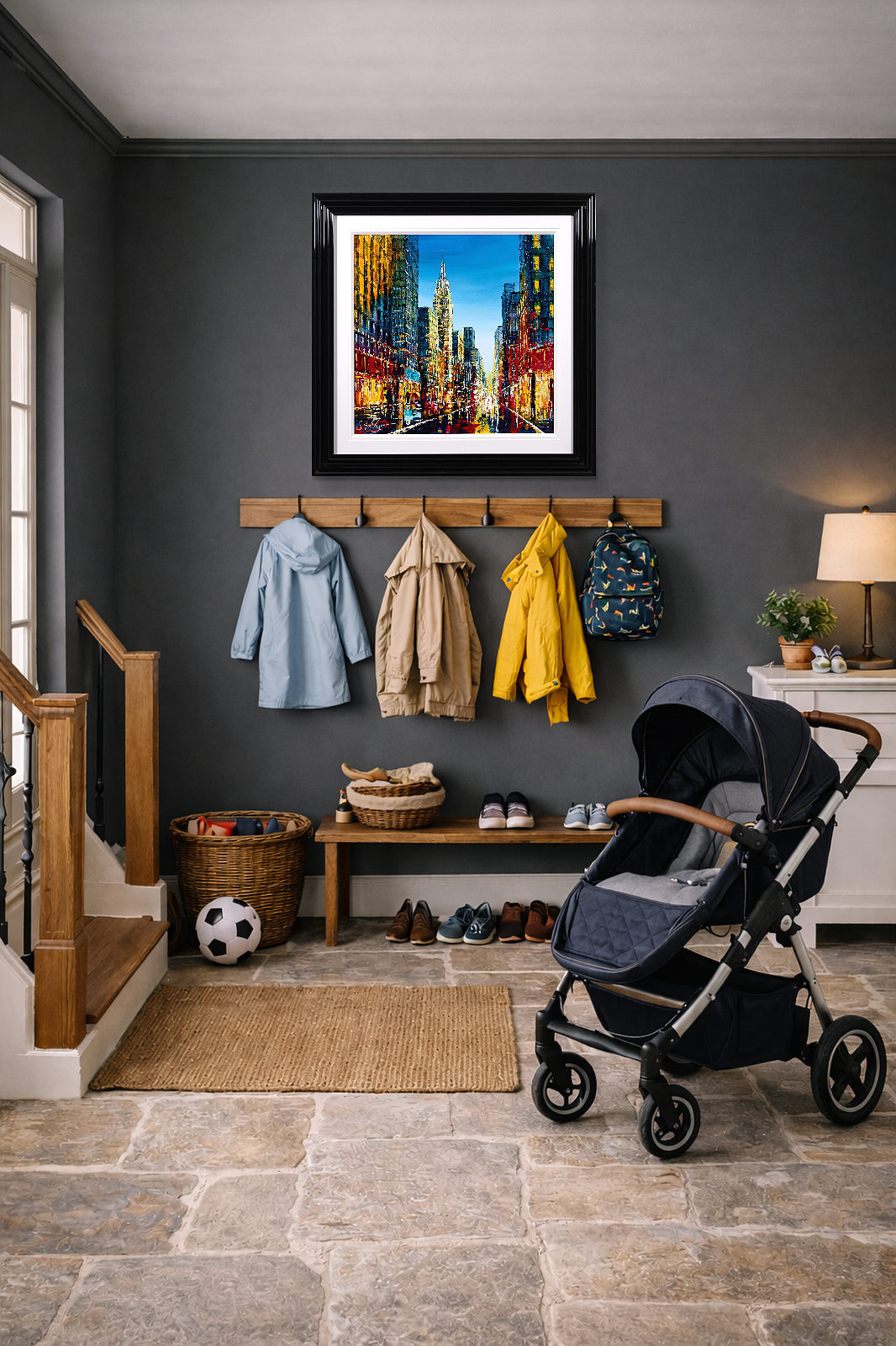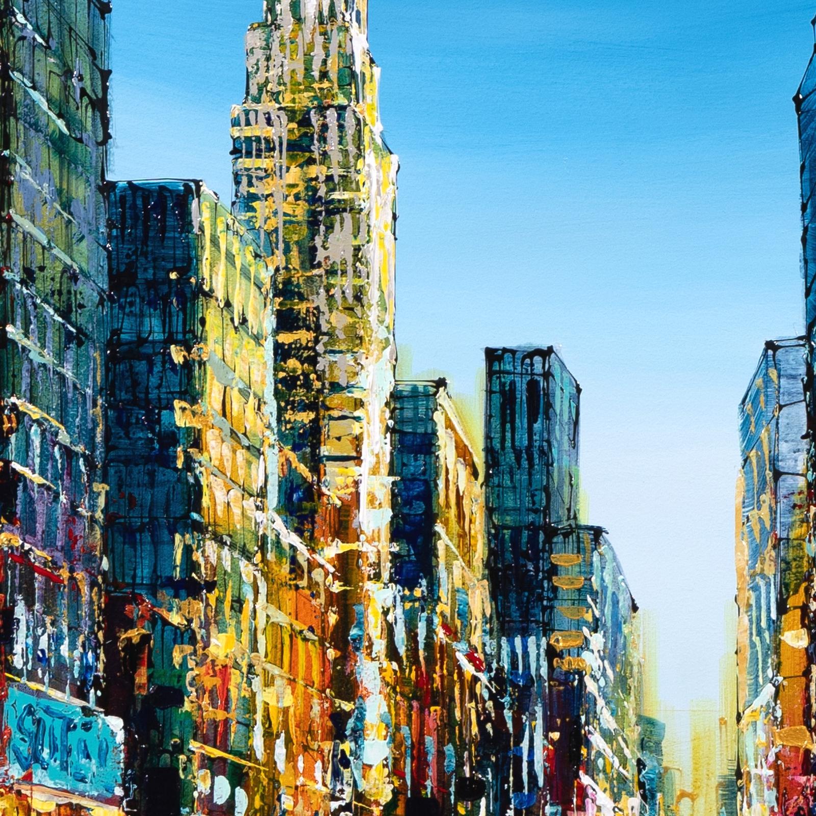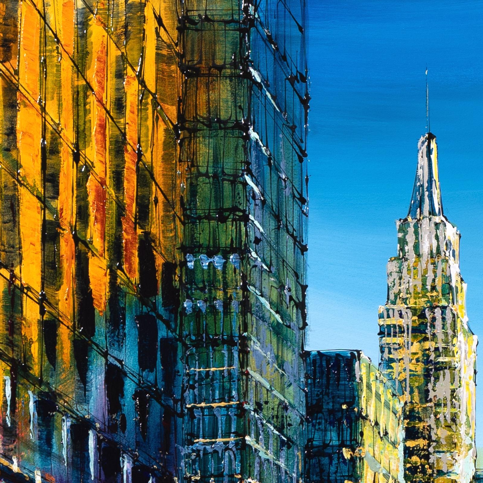 A bold, colourful New York City cityscape by British artist Simon Wright, presented with a wide white slip and sculpted gloss black frame for a sleek, contemporary look.