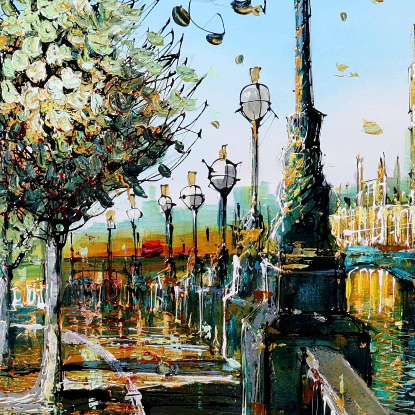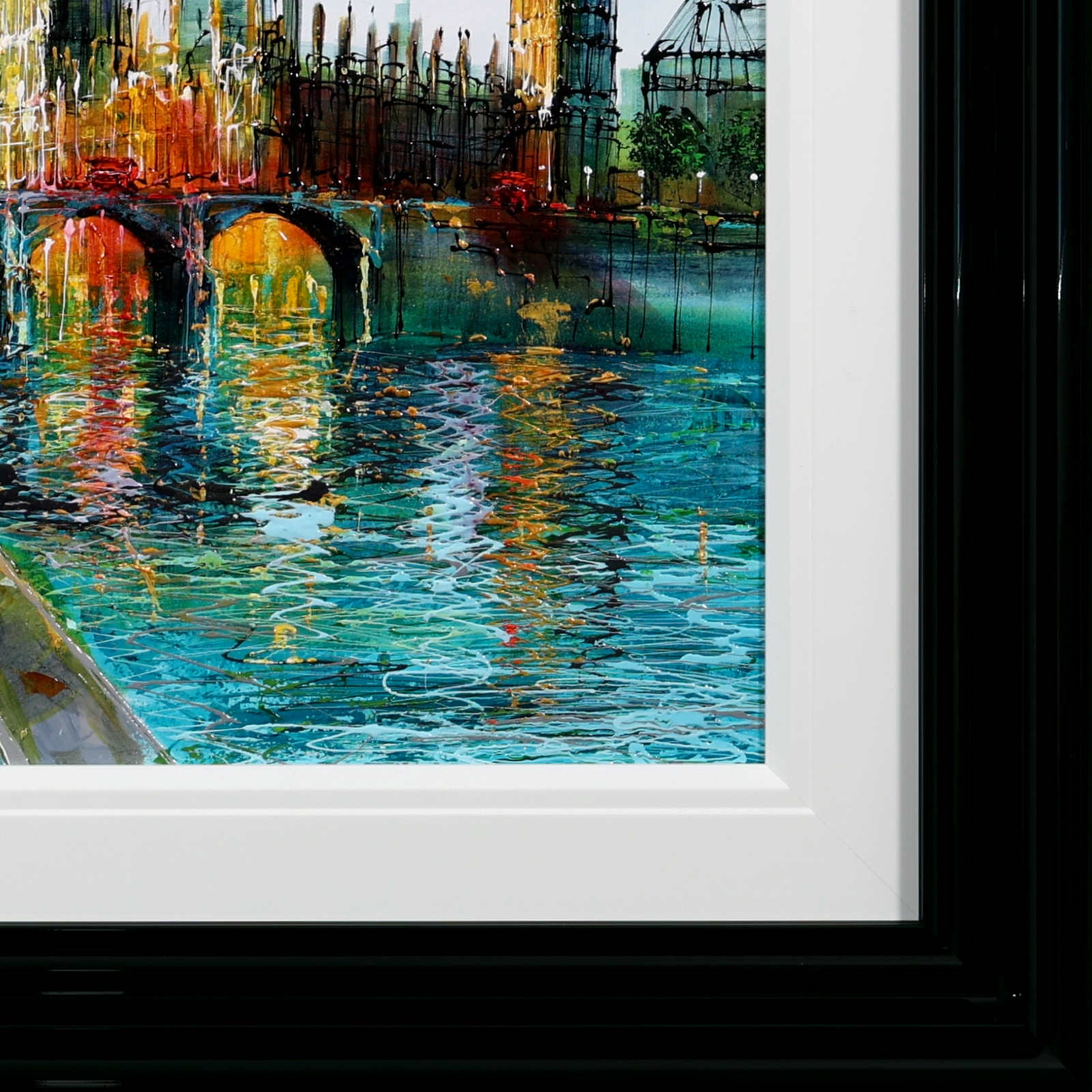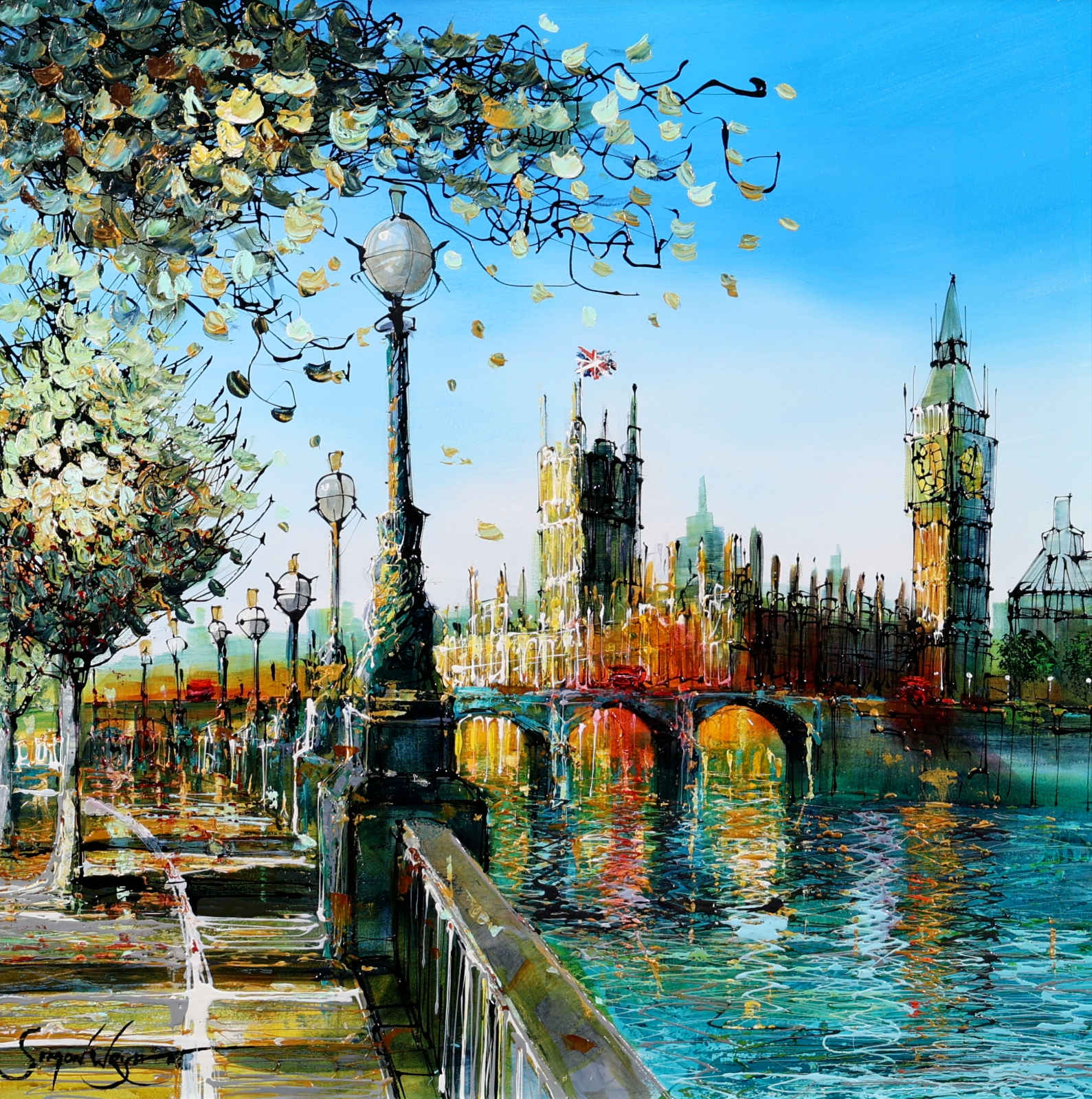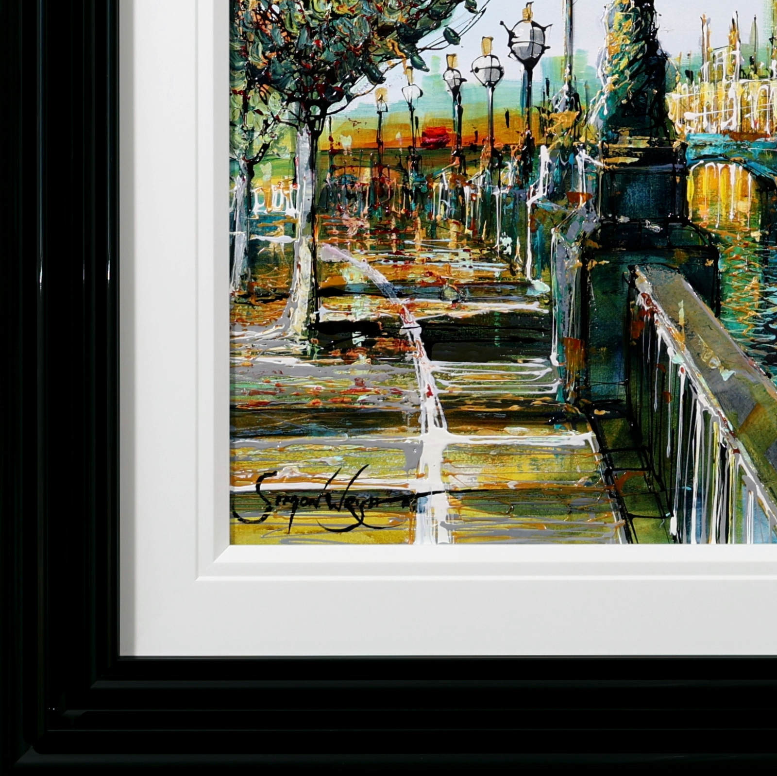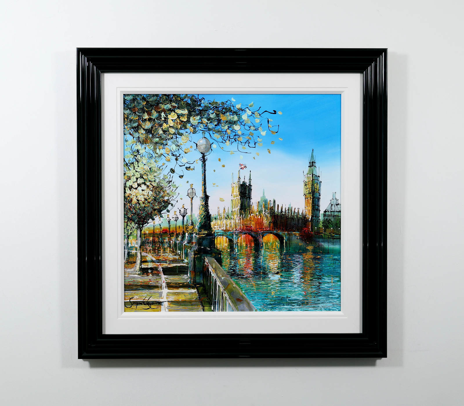 A softer, more atmospheric take on Westminster, where light dances across the river and blossoms frame the scene. Gentle reflections and fresh colour evoke a calm, seasonal moment in the heart of London. A fabulous original painting by British artist Simon Wright, presented with a wide white slip and sculpted gloss black frame for a sleek, contemporary look.