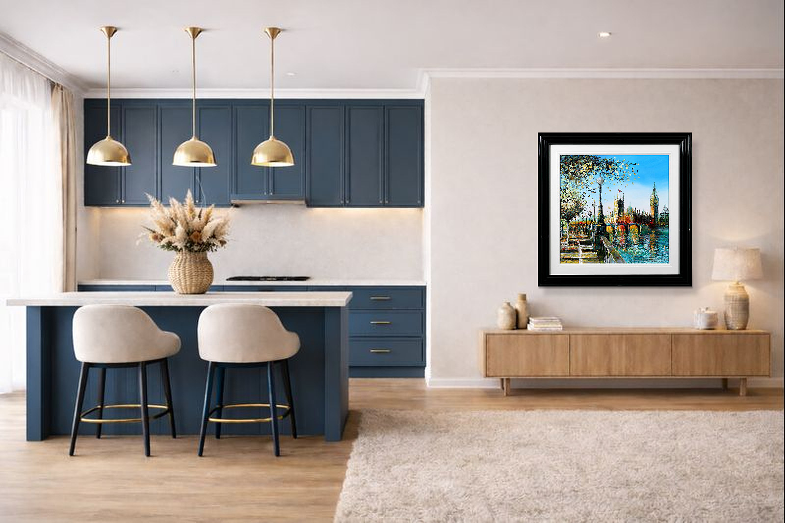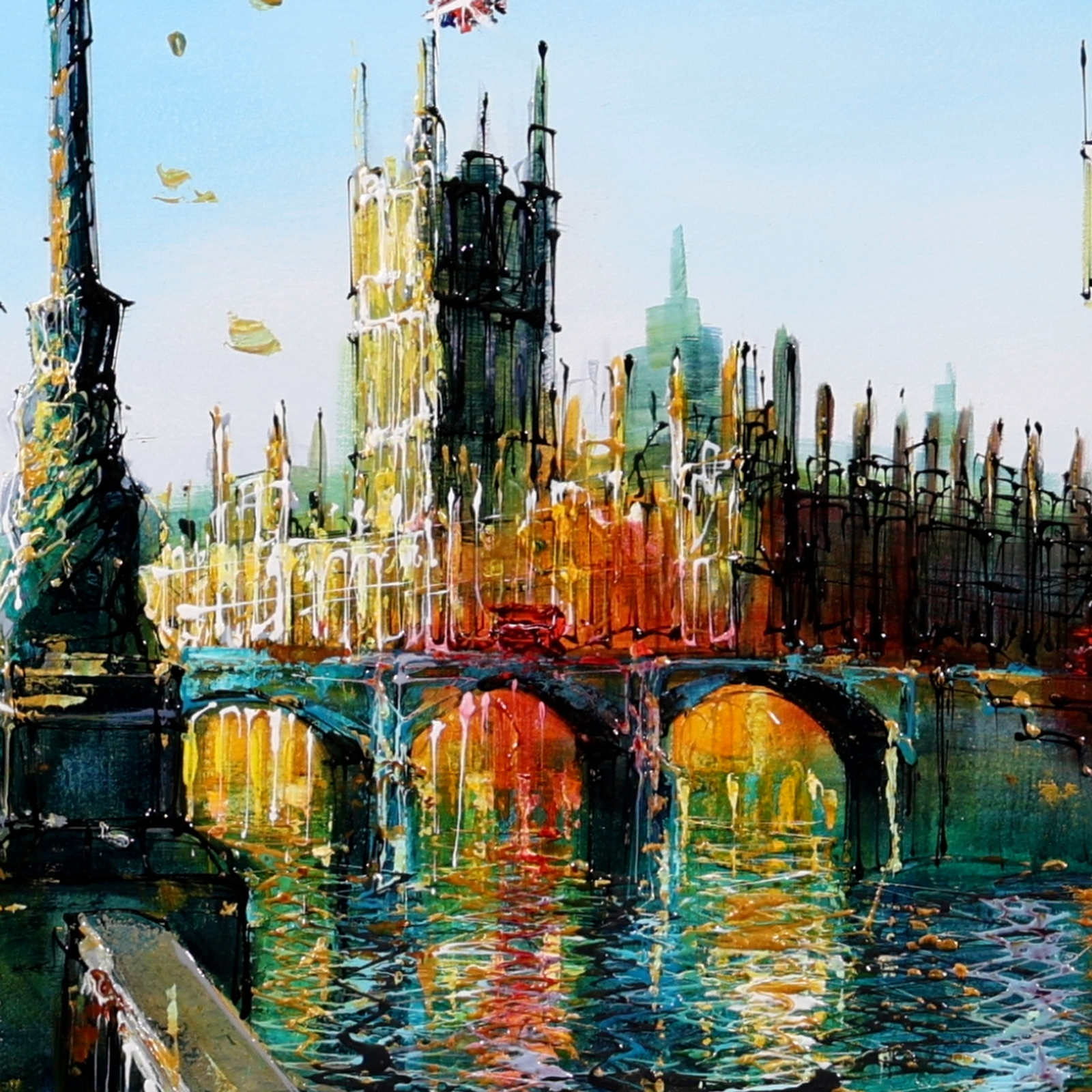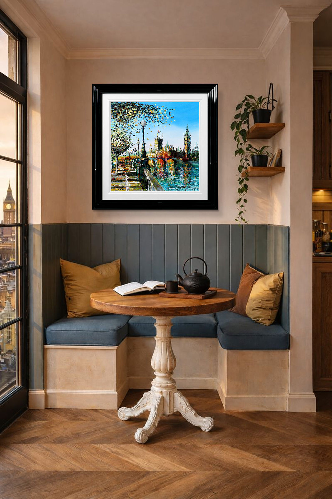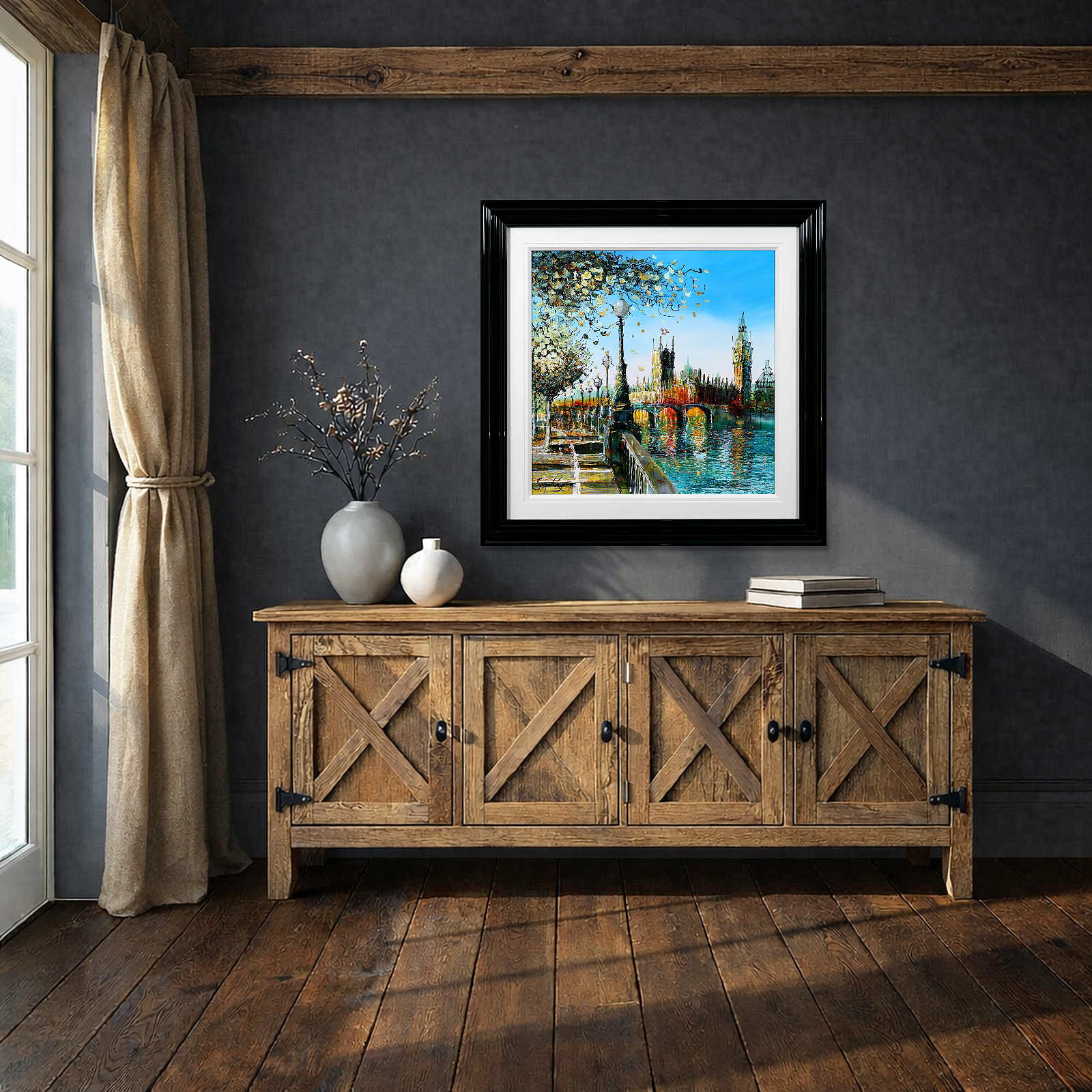 A softer, more atmospheric take on Westminster, where light dances across the river and blossoms frame the scene. Gentle reflections and fresh colour evoke a calm, seasonal moment in the heart of London. A fabulous original painting by British artist Simon Wright, presented with a wide white slip and sculpted gloss black frame for a sleek, contemporary look.