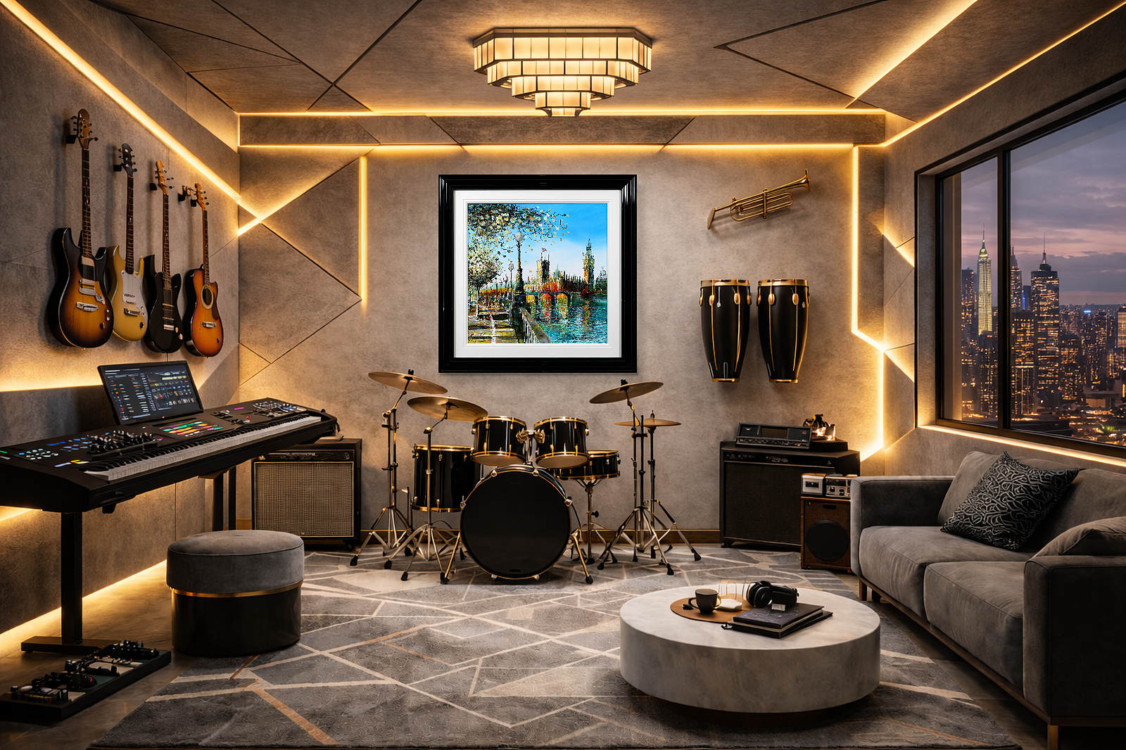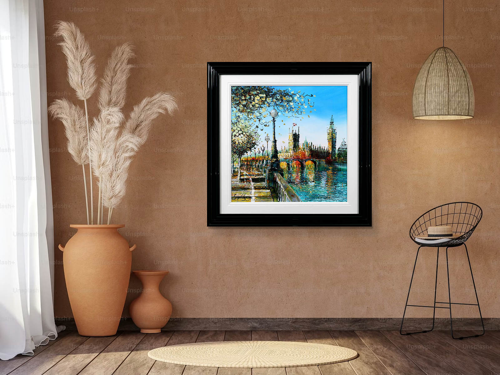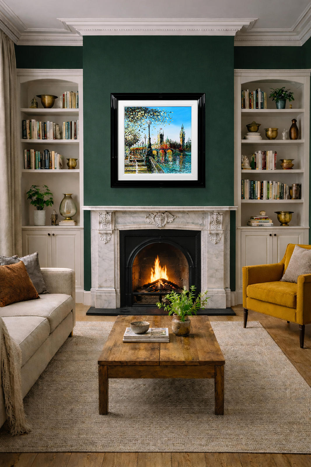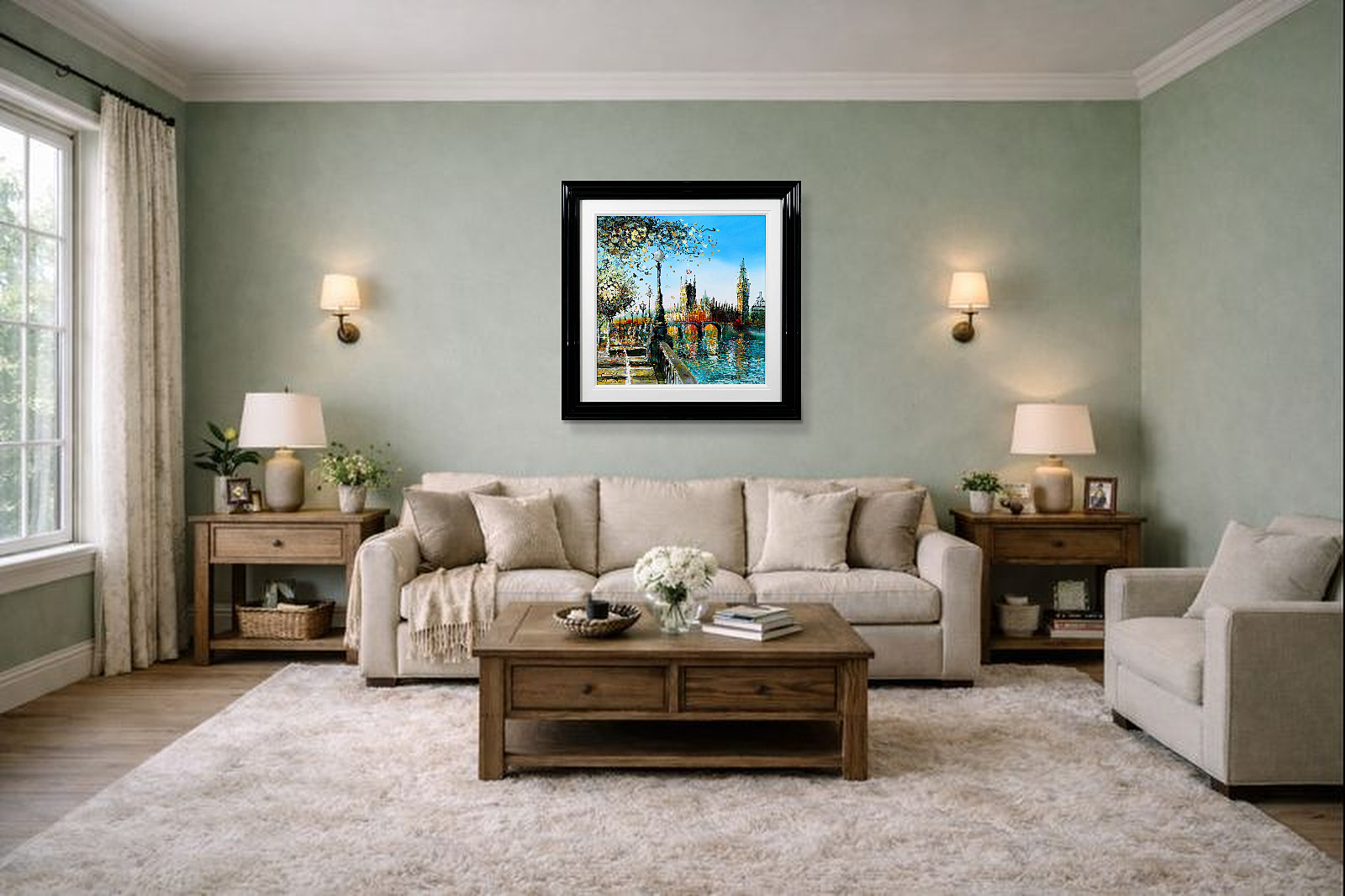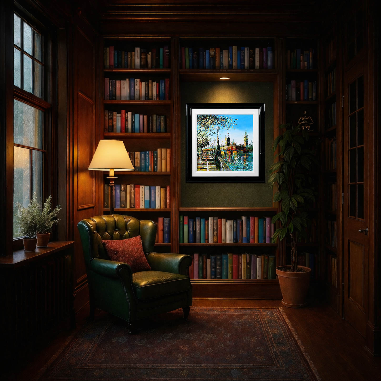A softer, more atmospheric take on Westminster, where light dances across the river and blossoms frame the scene. Gentle reflections and fresh colour evoke a calm, seasonal moment in the heart of London. A fabulous original painting by British artist Simon Wright, presented with a wide white slip and sculpted gloss black frame for a sleek, contemporary look.