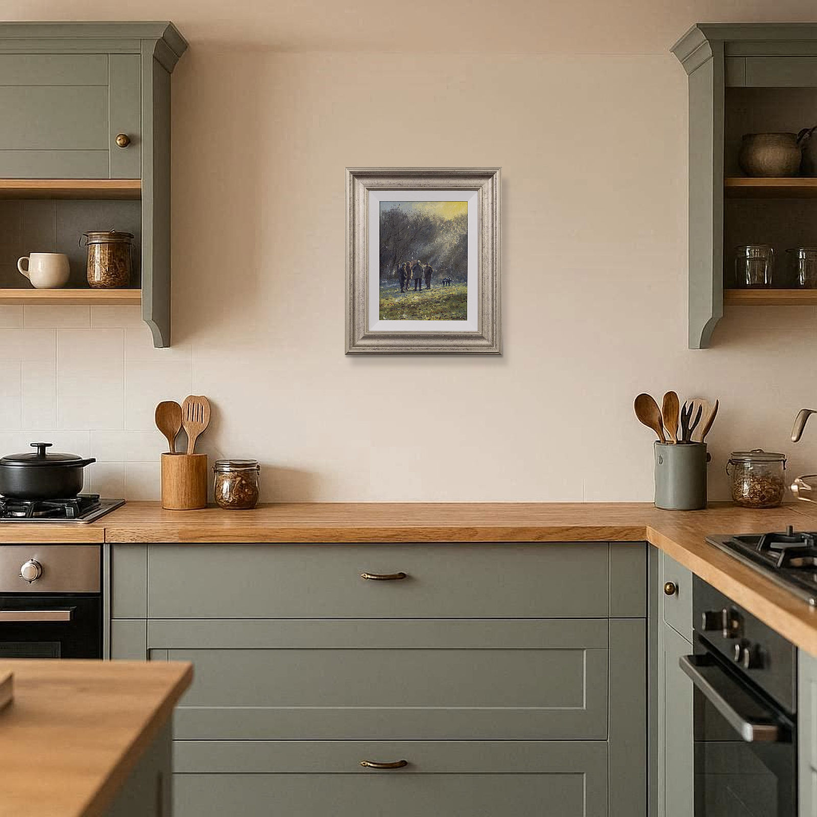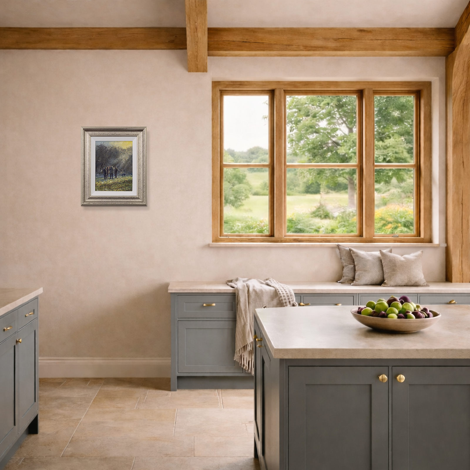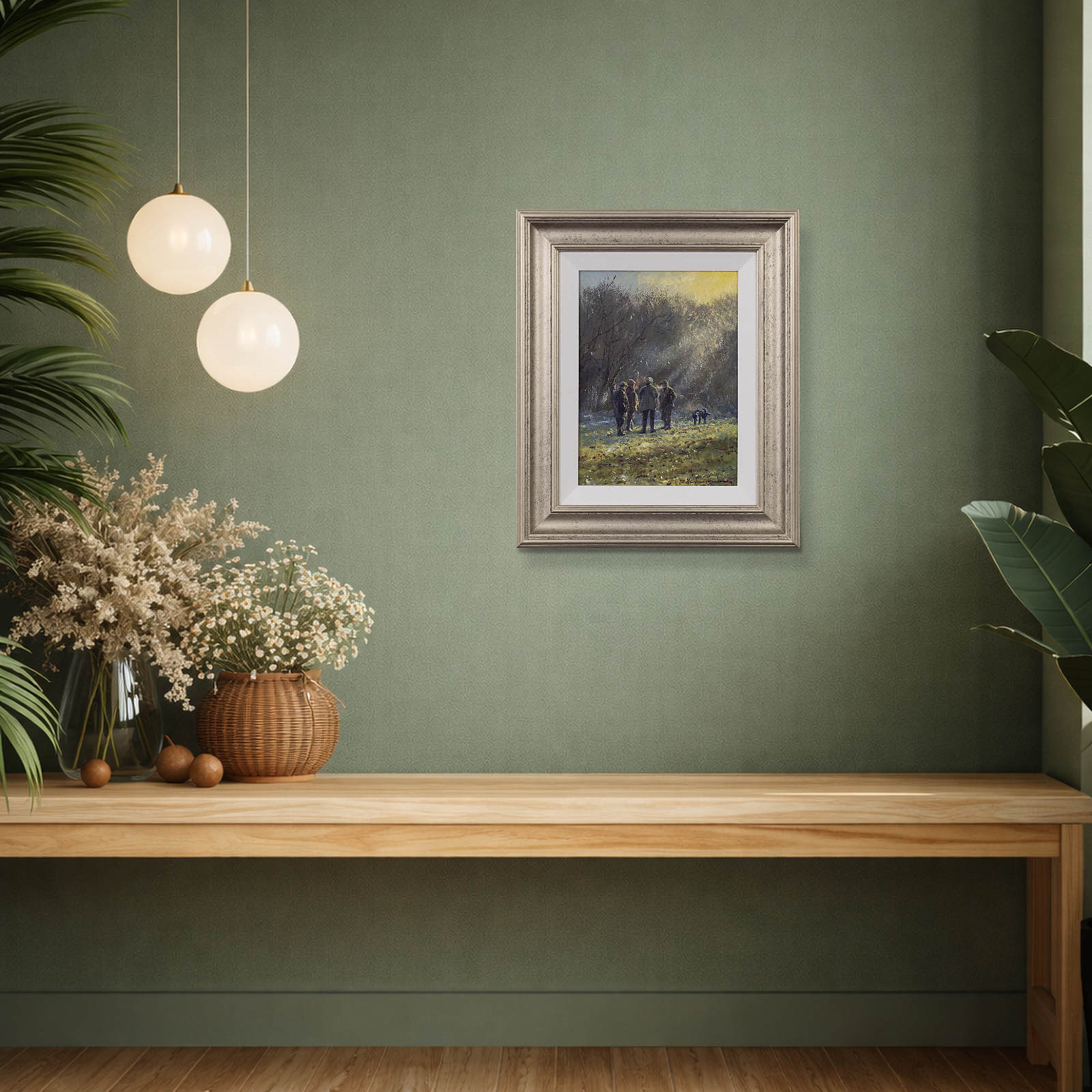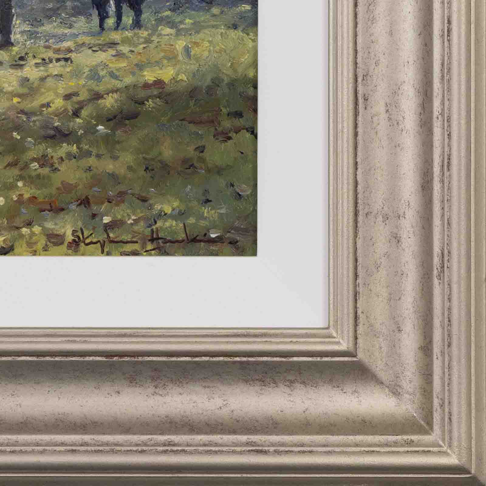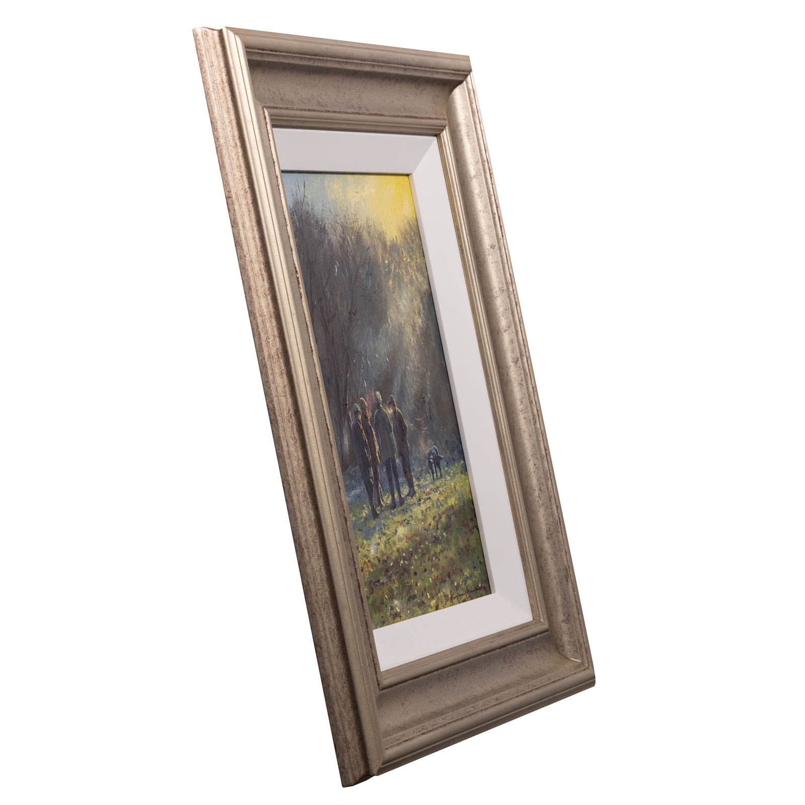 Atmospheric countryside scene in oil by talented British artist Stephen Hawkins. Framed with a slim white slip and a warm distressed silver frame as shown.