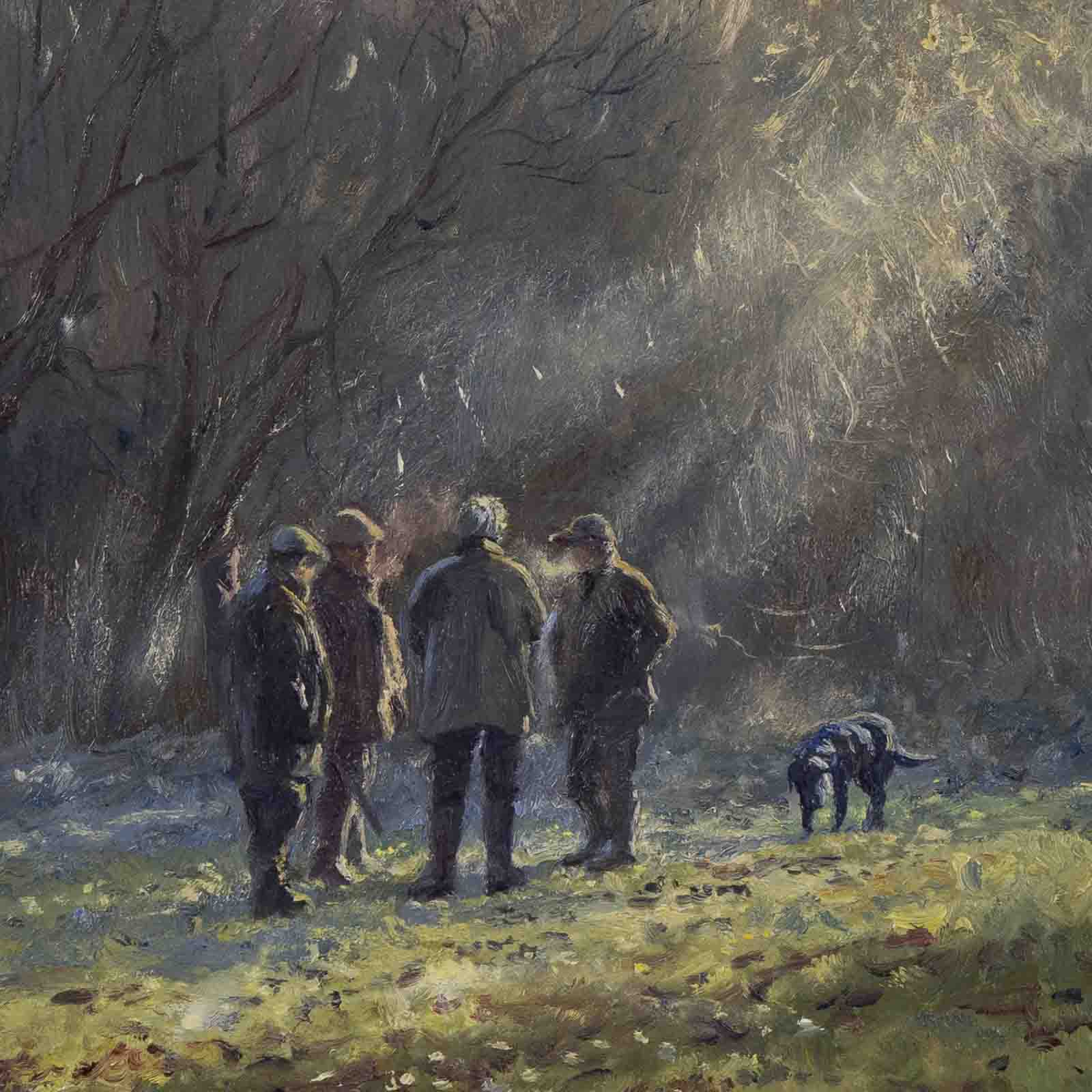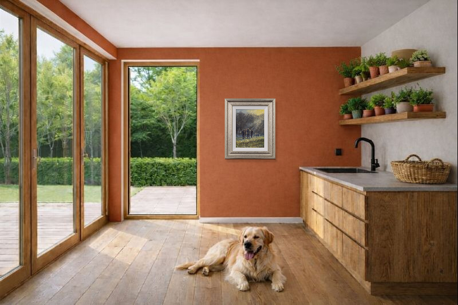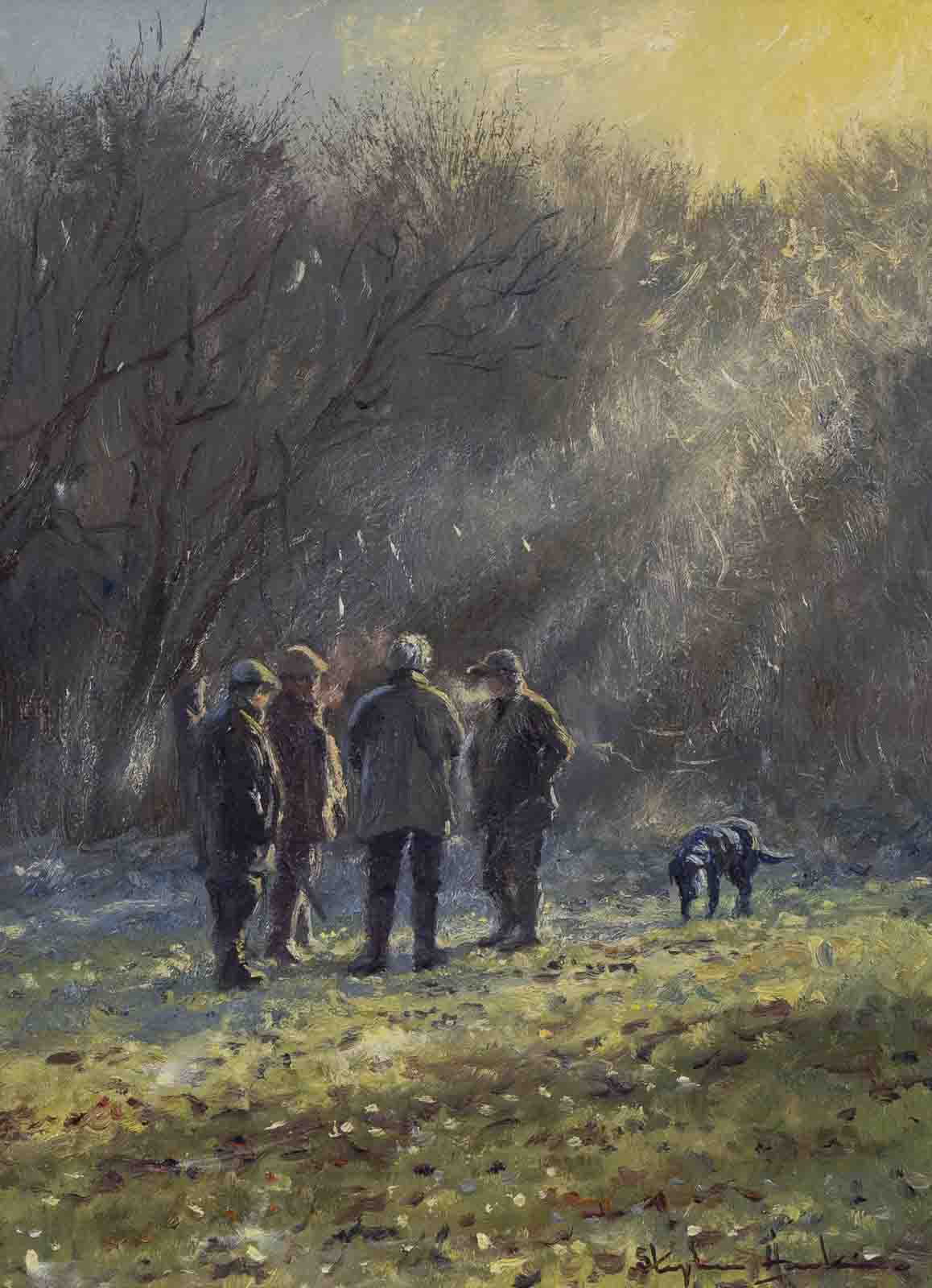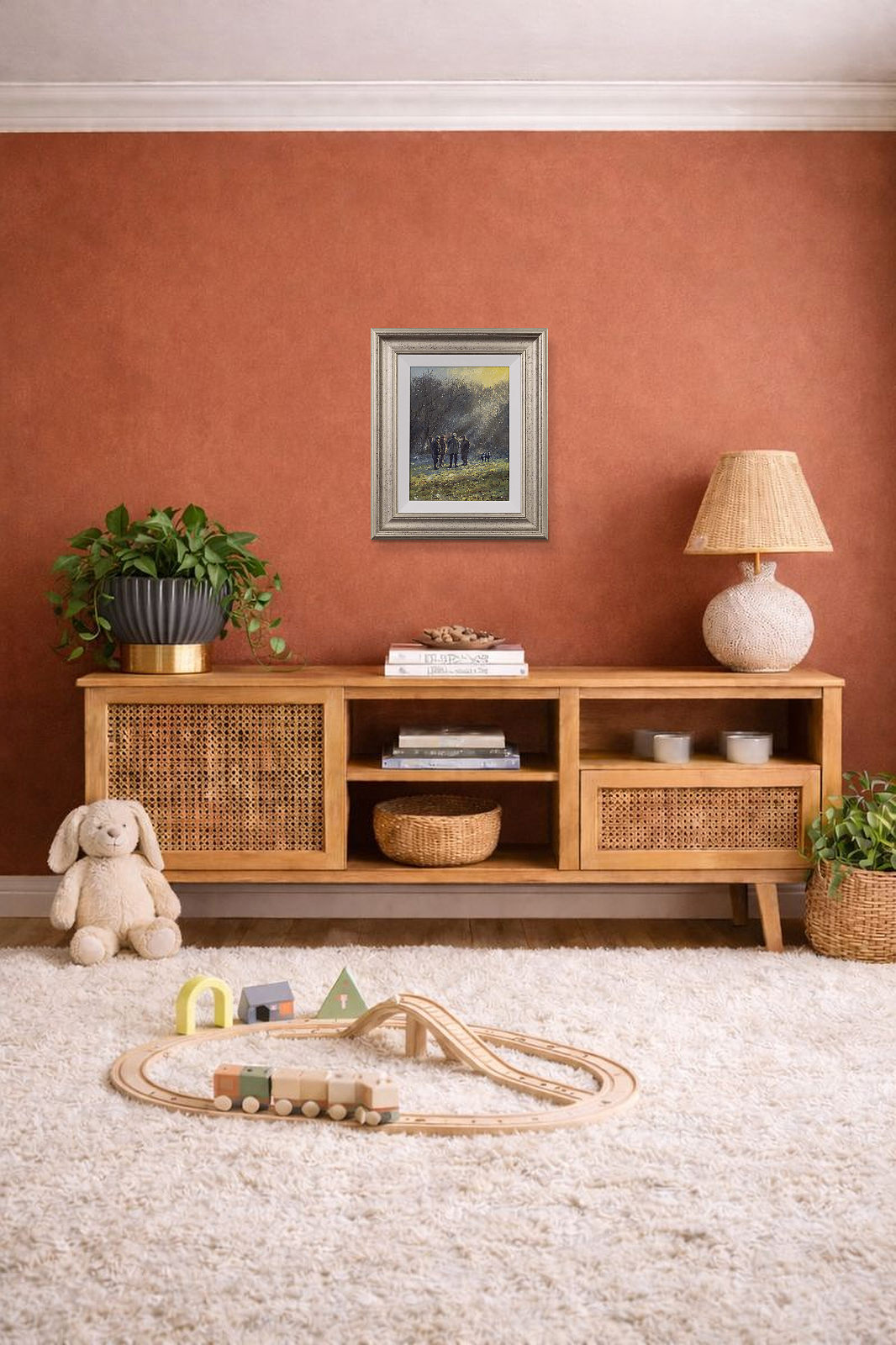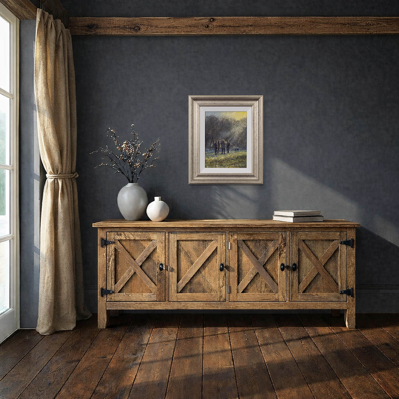 Atmospheric countryside scene in oil by talented British artist Stephen Hawkins. Framed with a slim white slip and a warm distressed silver frame as shown.