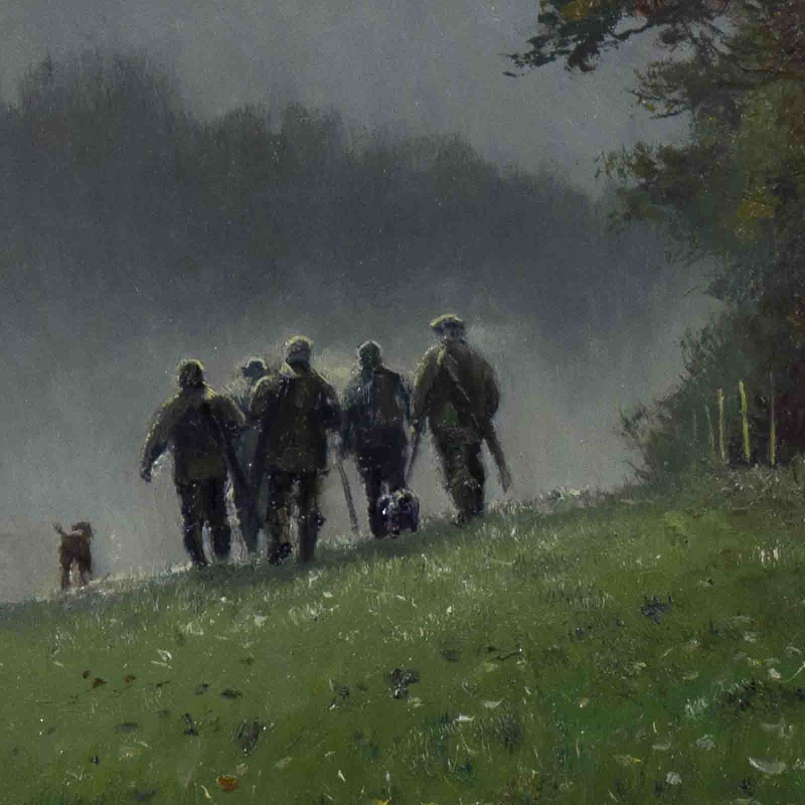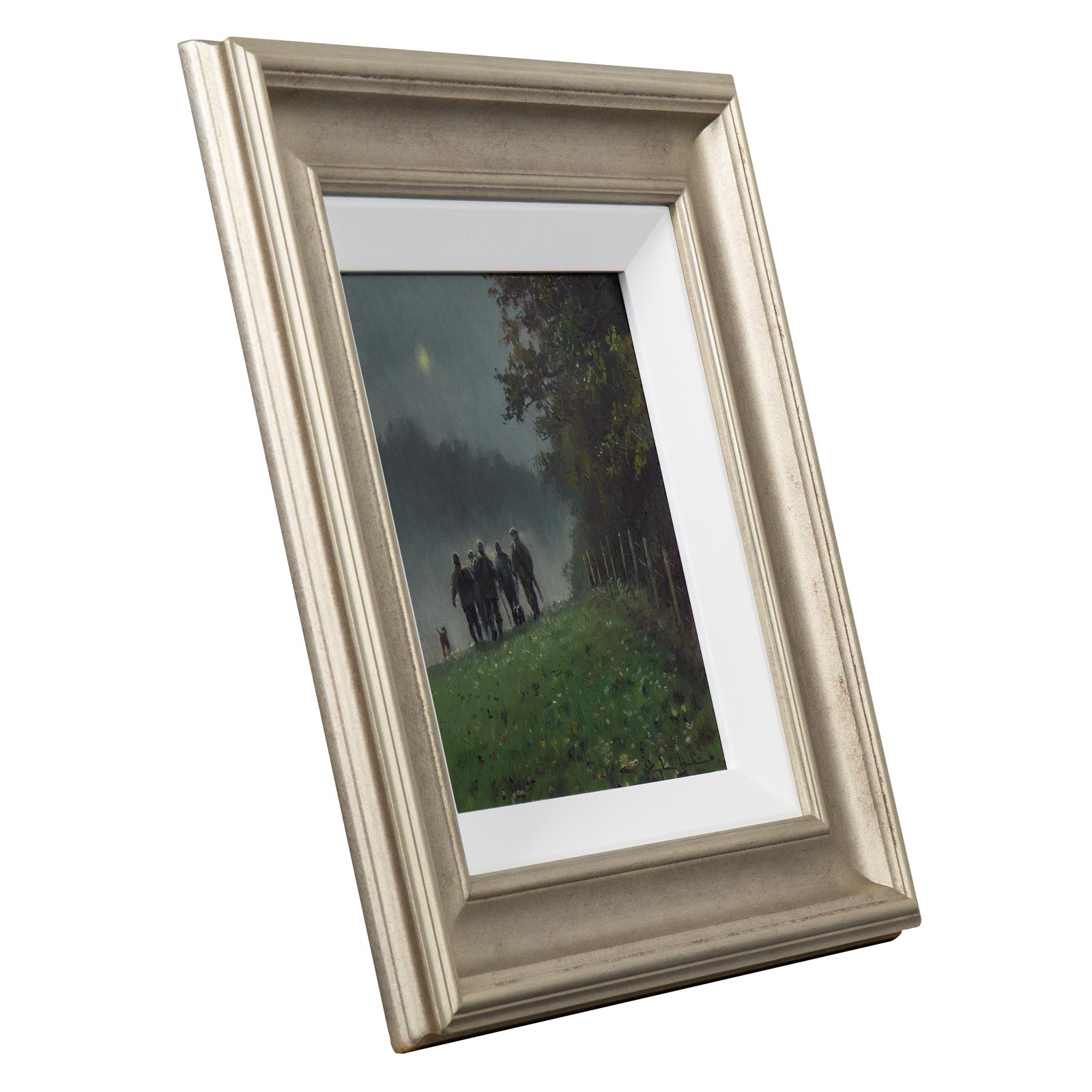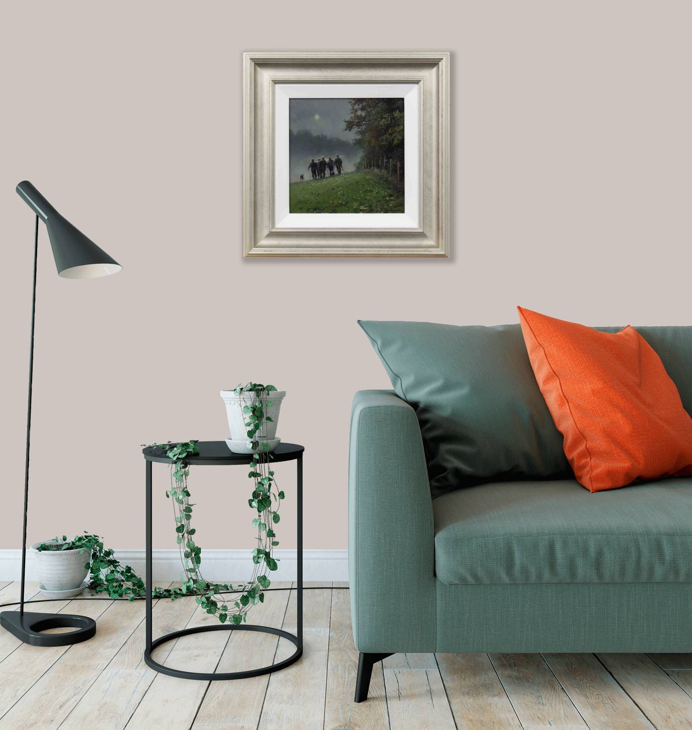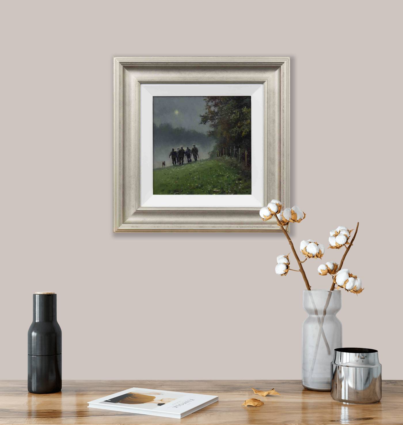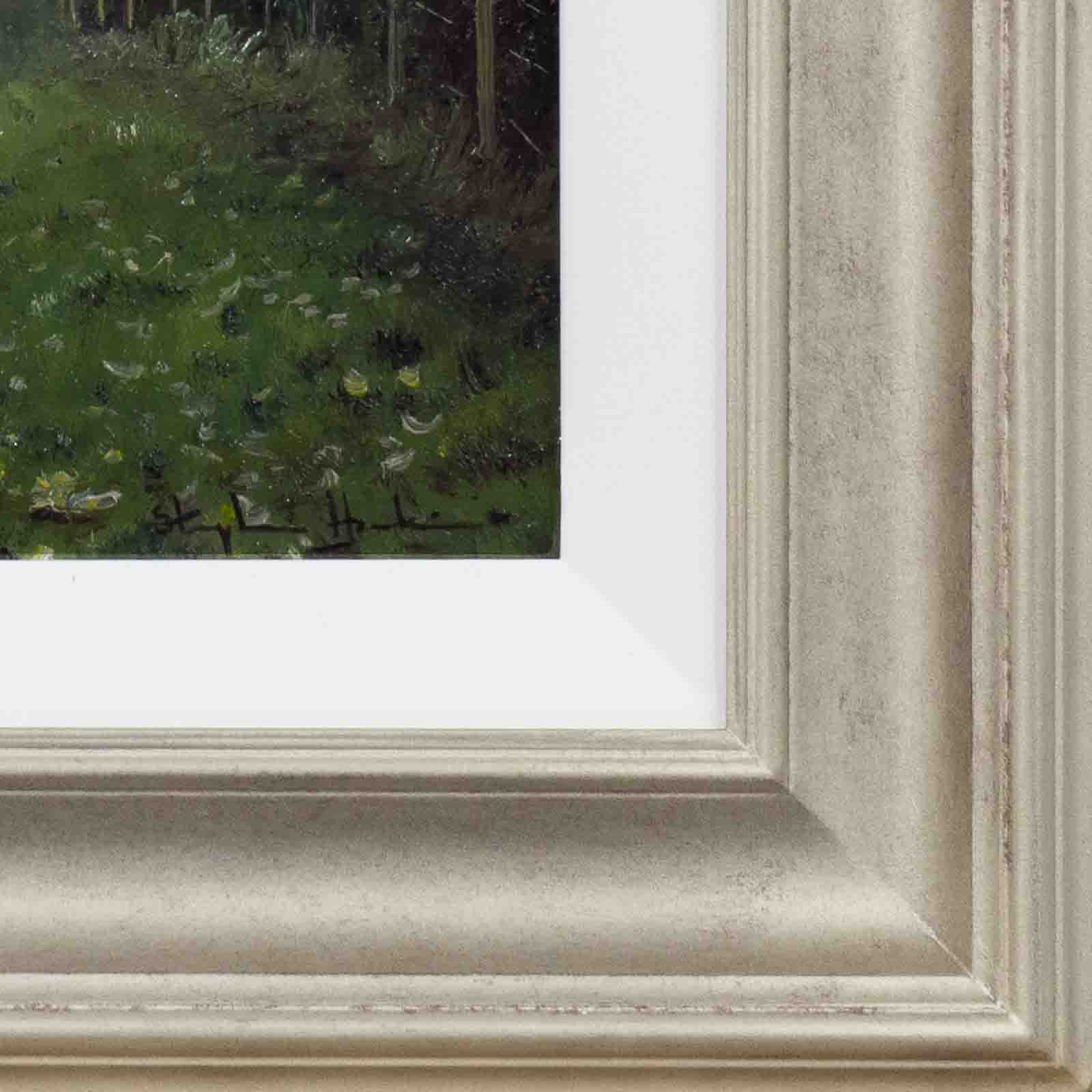 Atmospheric countryside scene in oil by talented British artist Stephen Hawkins. Framed with a slim white slip and a warm distressed silver frame as shown.