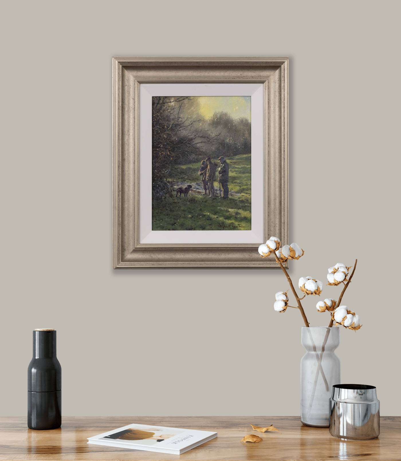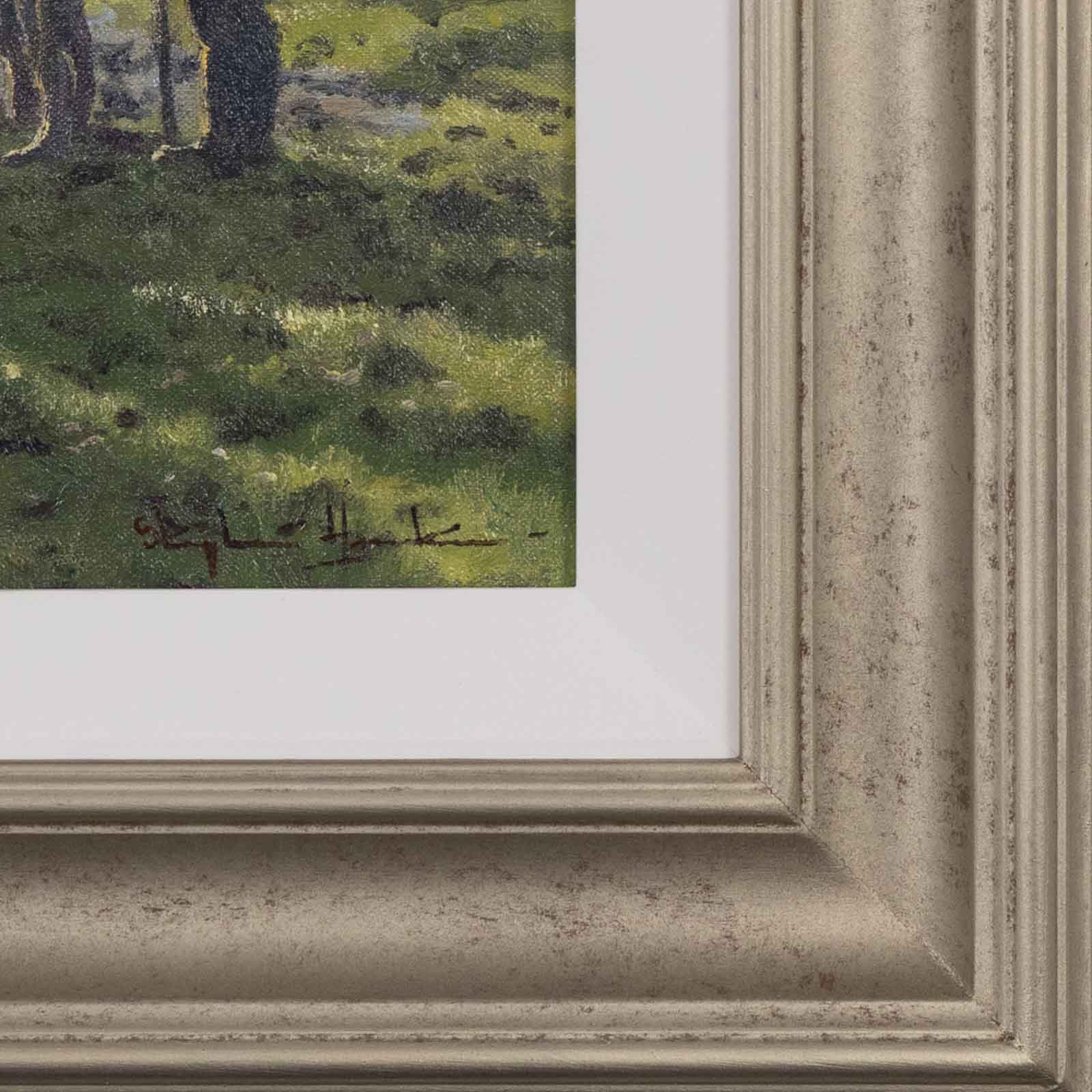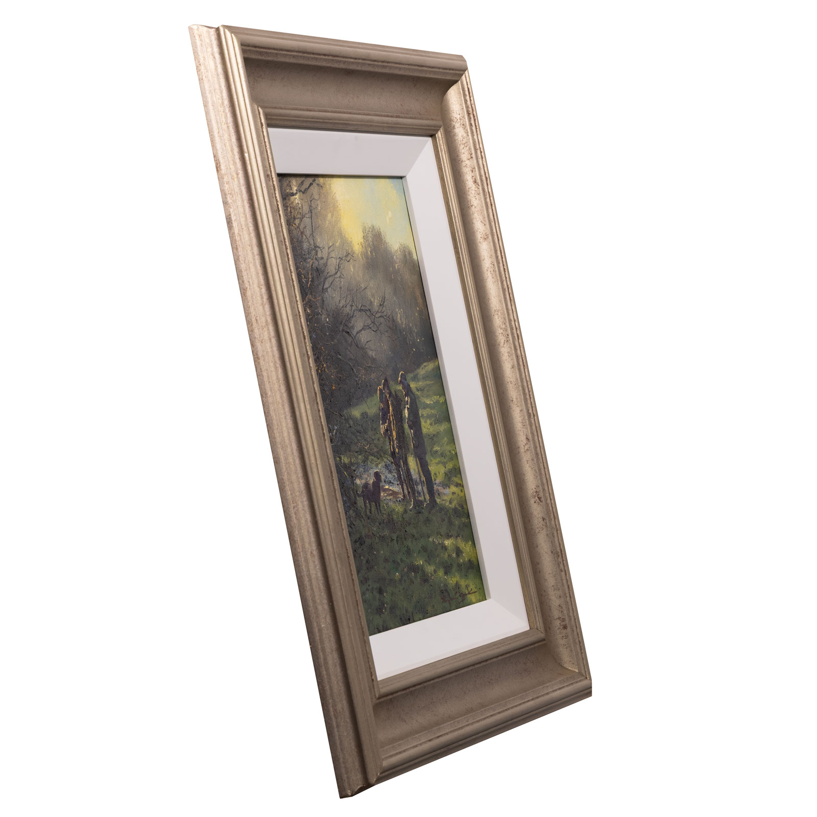 Atmospheric countryside scene in oil by talented British artist Stephen Hawkins. Framed with a slim white slip and a warm distressed silver frame as shown.