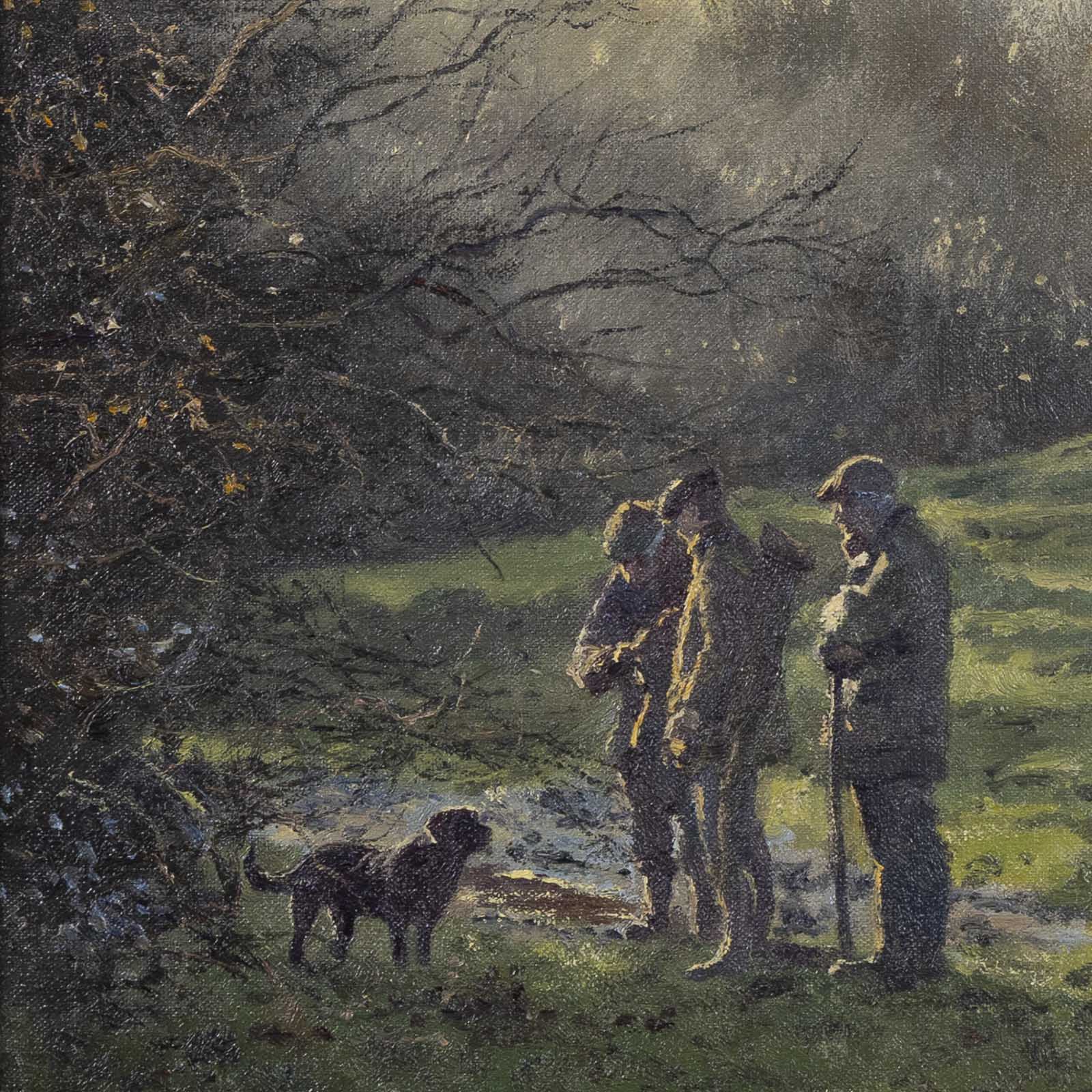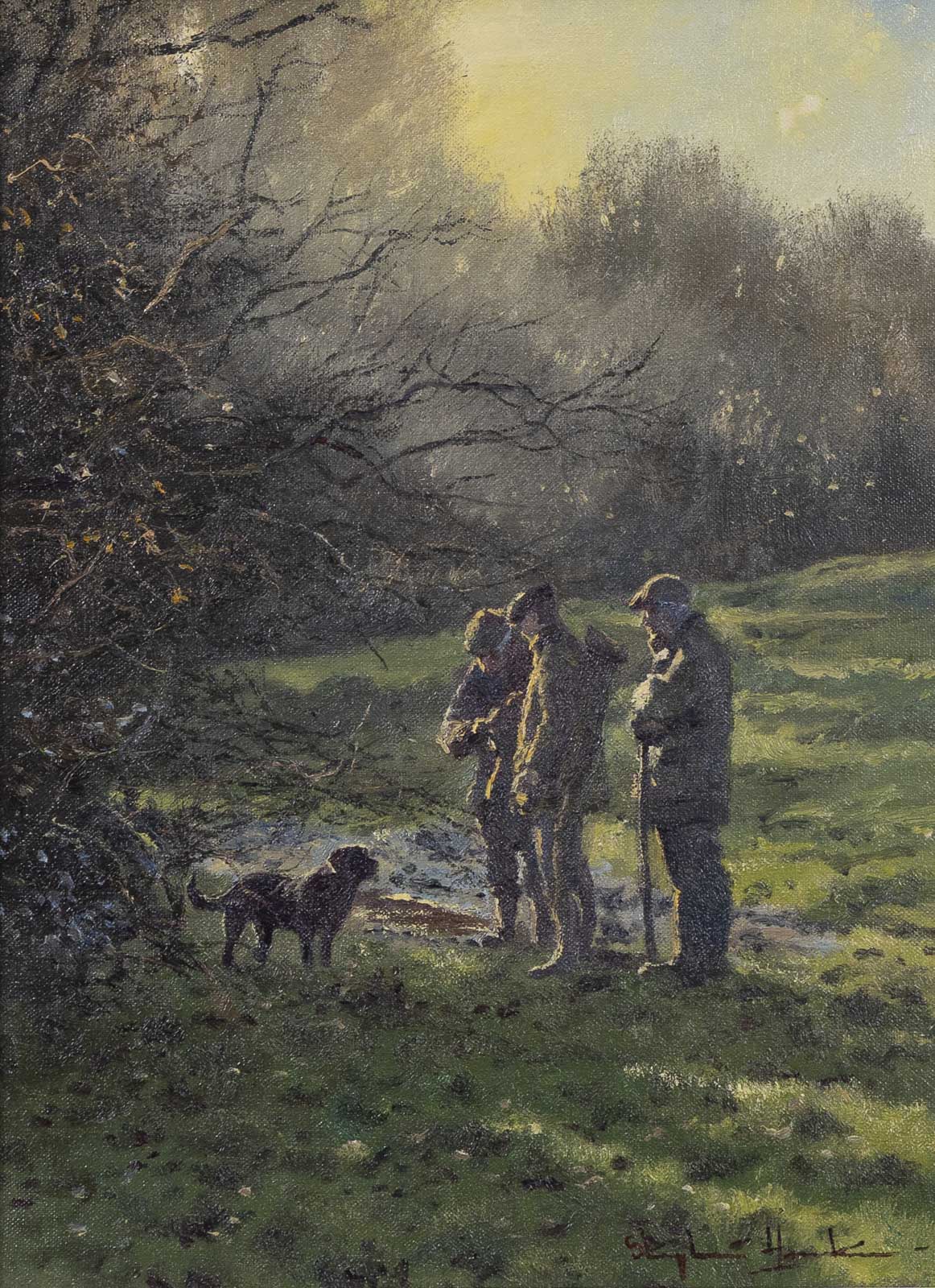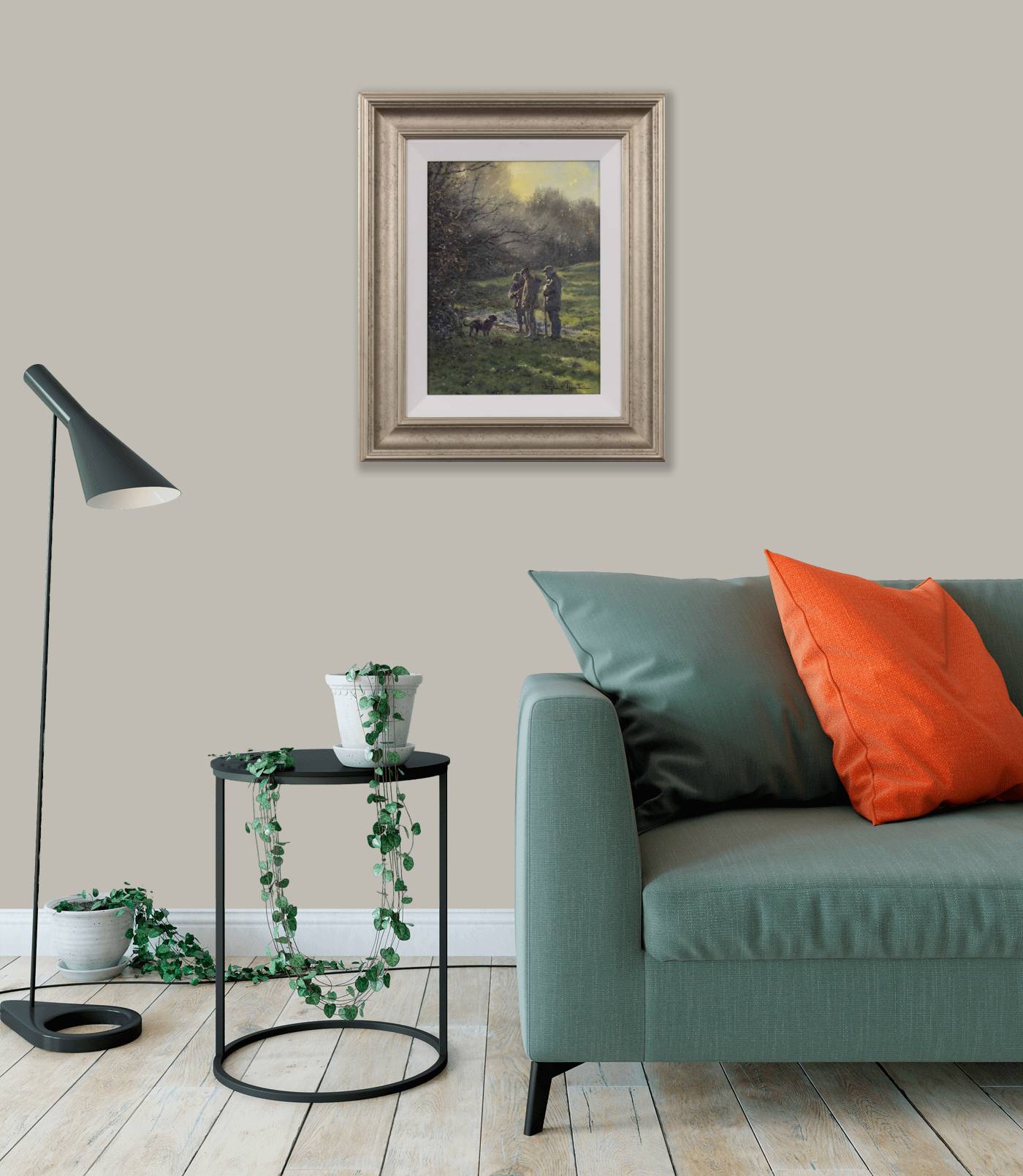 Atmospheric countryside scene in oil by talented British artist Stephen Hawkins. Framed with a slim white slip and a warm distressed silver frame as shown.