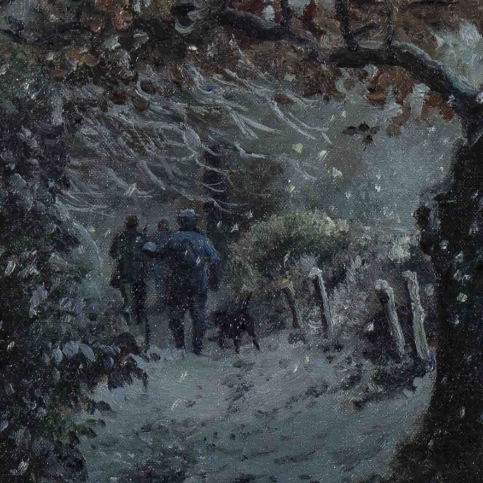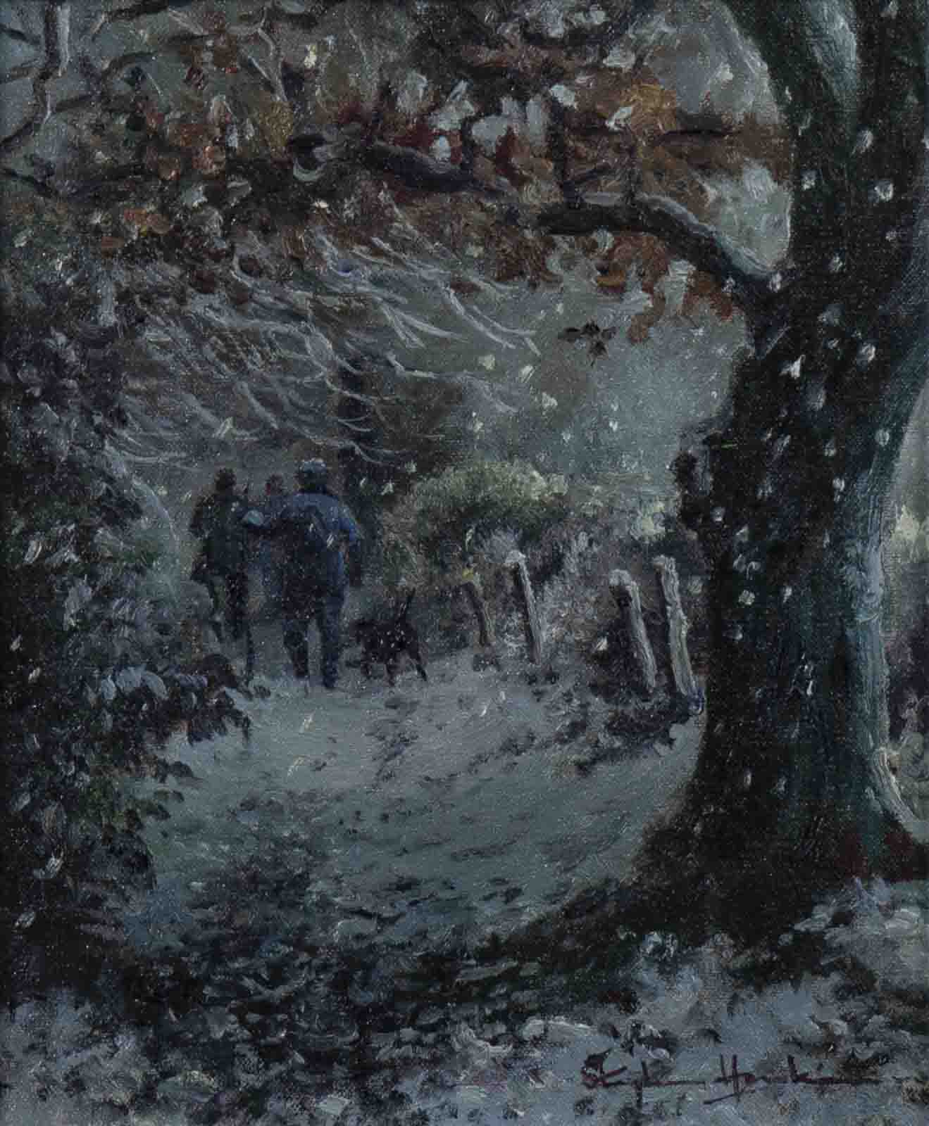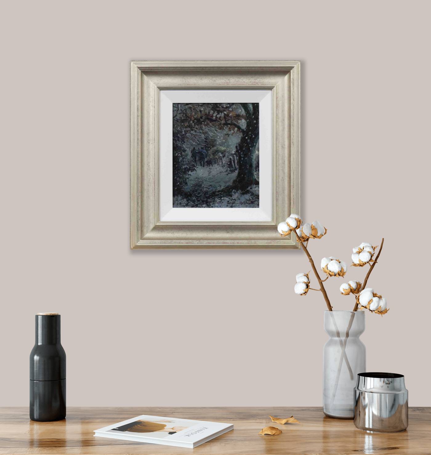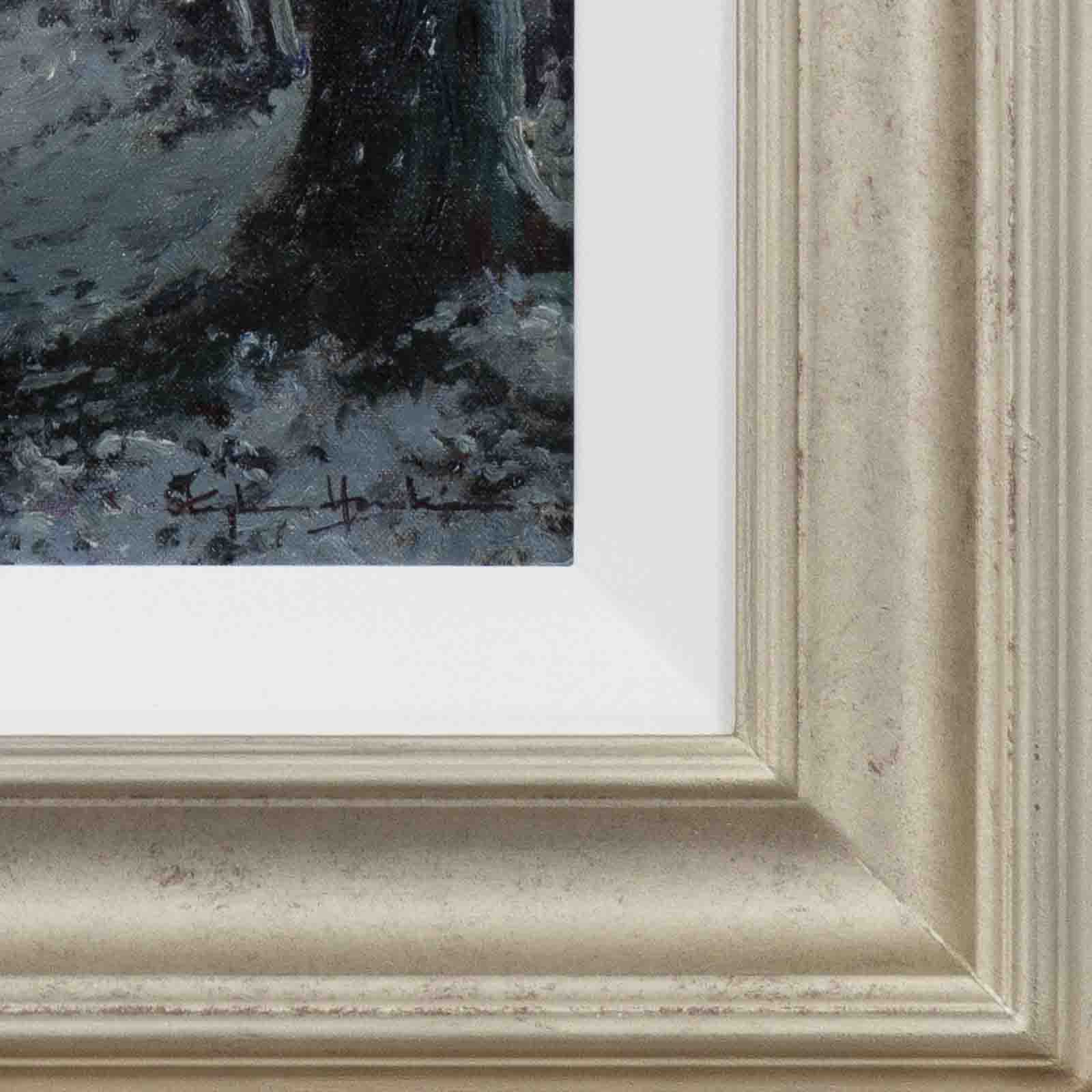 Atmospheric countryside scene in oil by talented British artist Stephen Hawkins. Framed with a slim white slip and a warm distressed silver frame as shown.