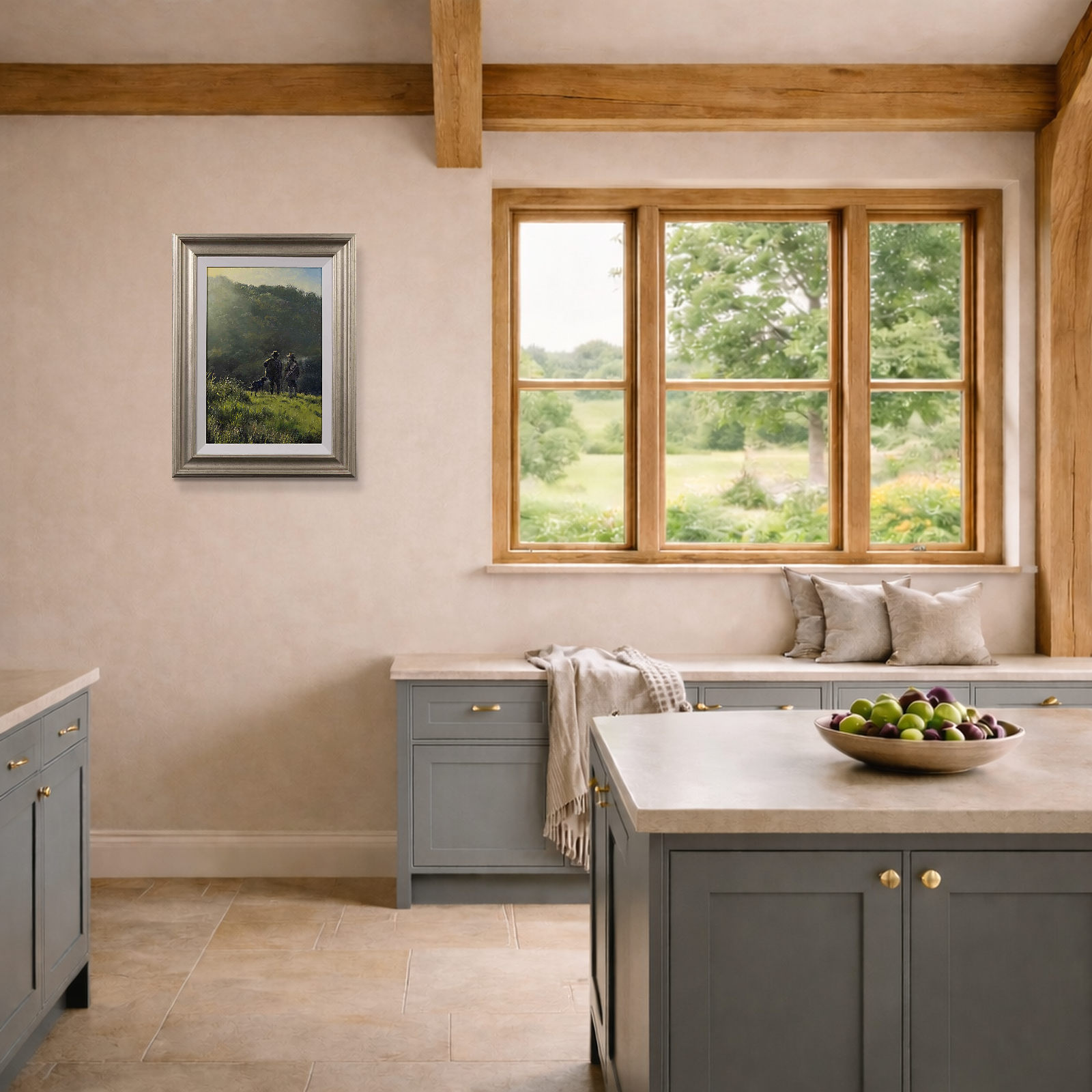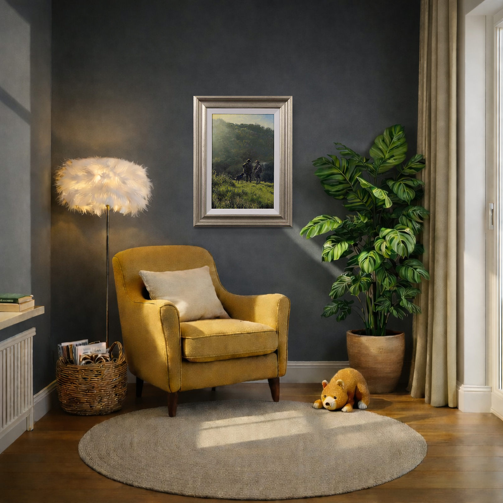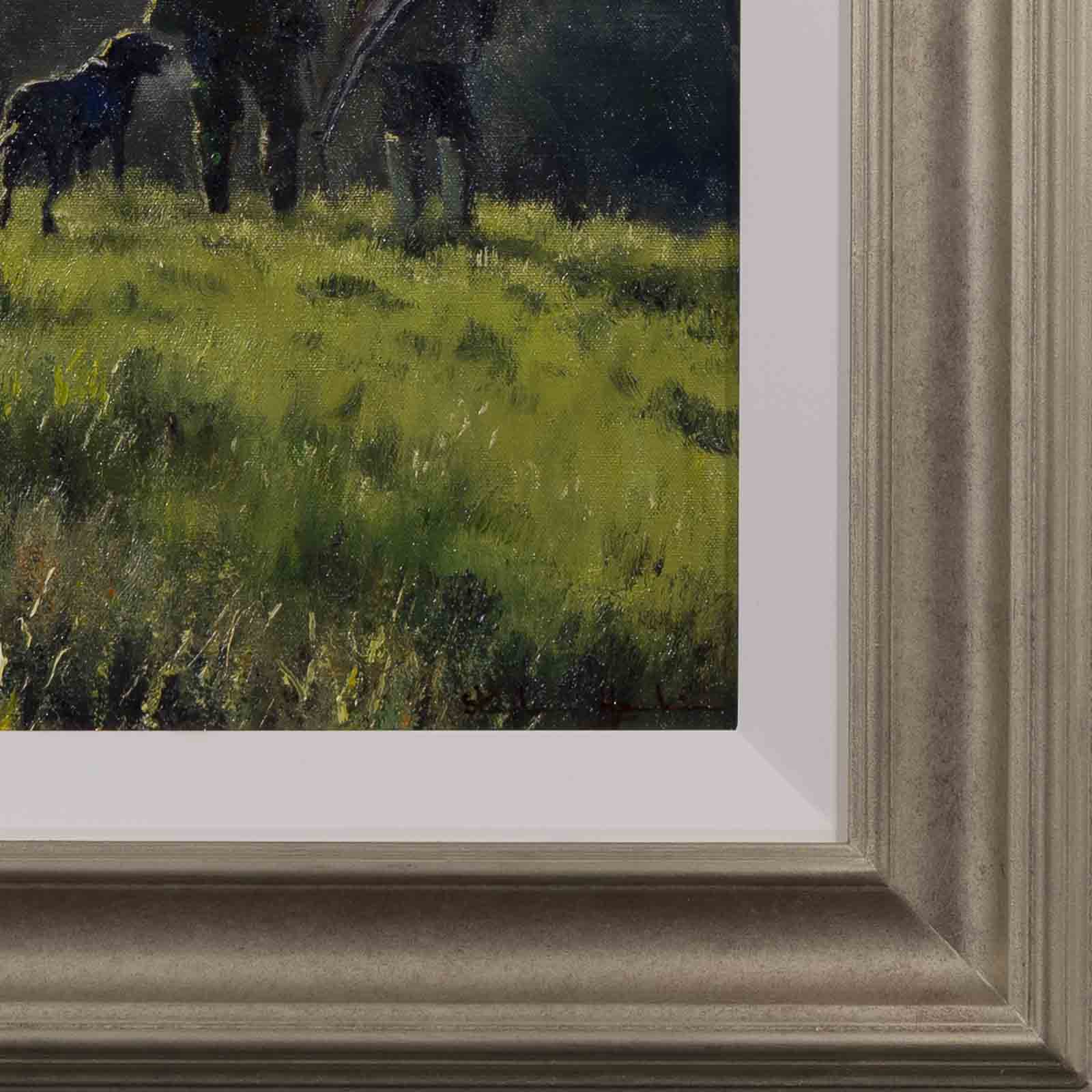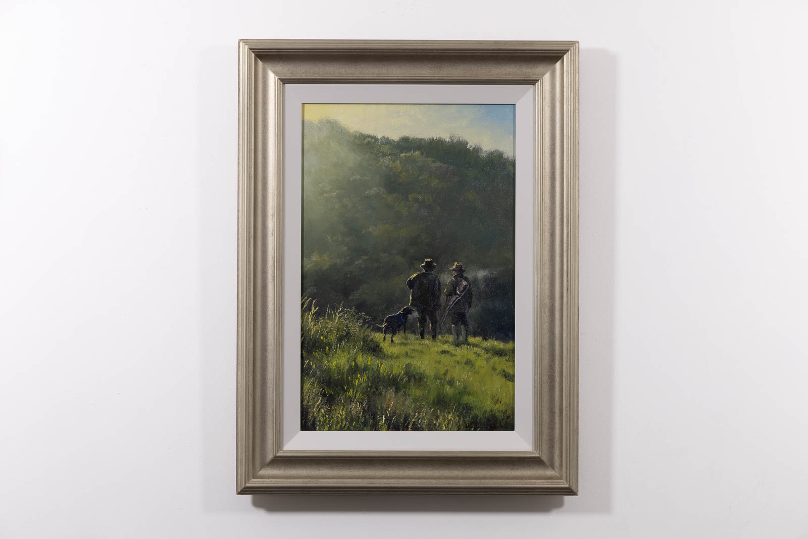Atmospheric countryside scene in oil by talented British artist Stephen Hawkins. Framed with a slim white slip and a warm distressed silver frame as shown.