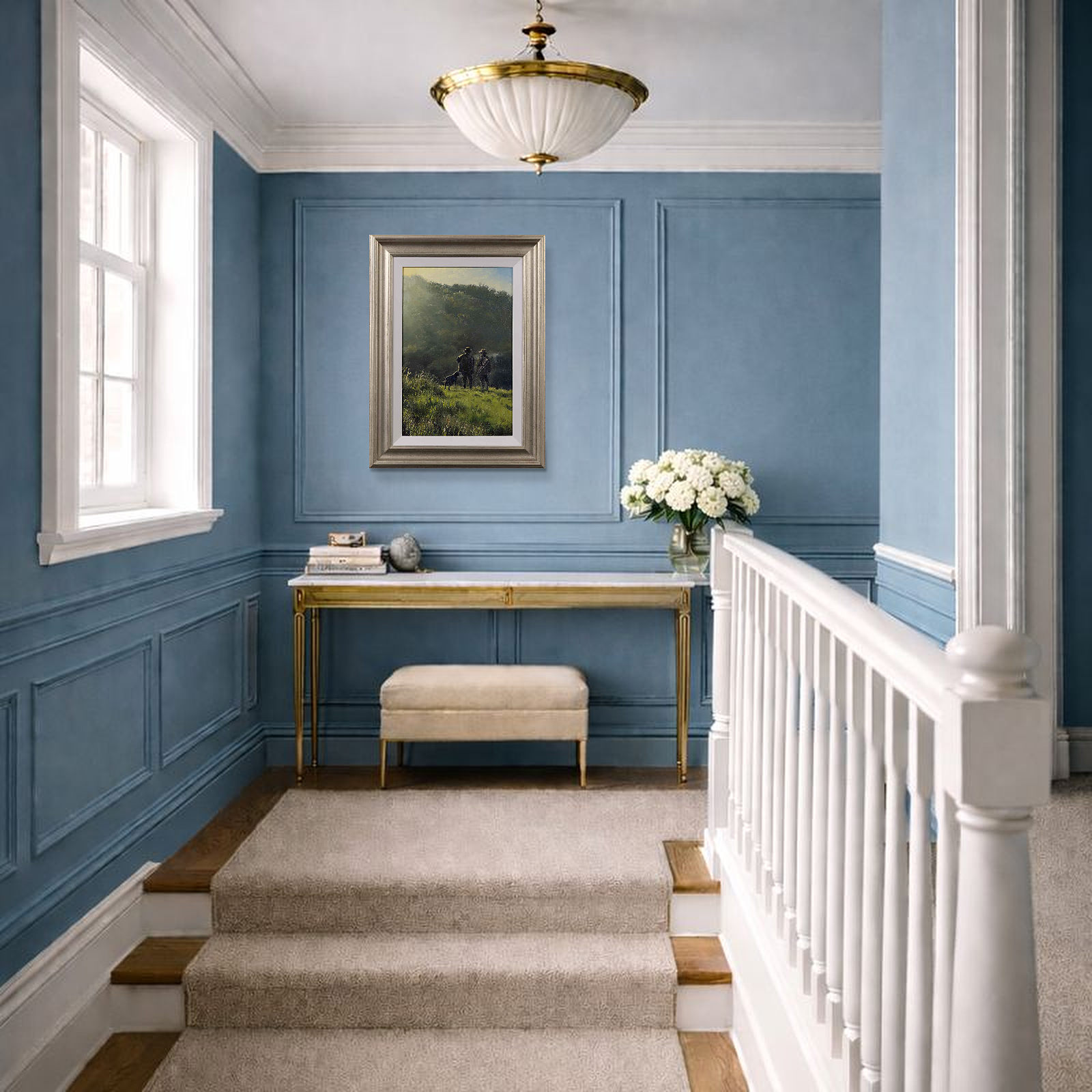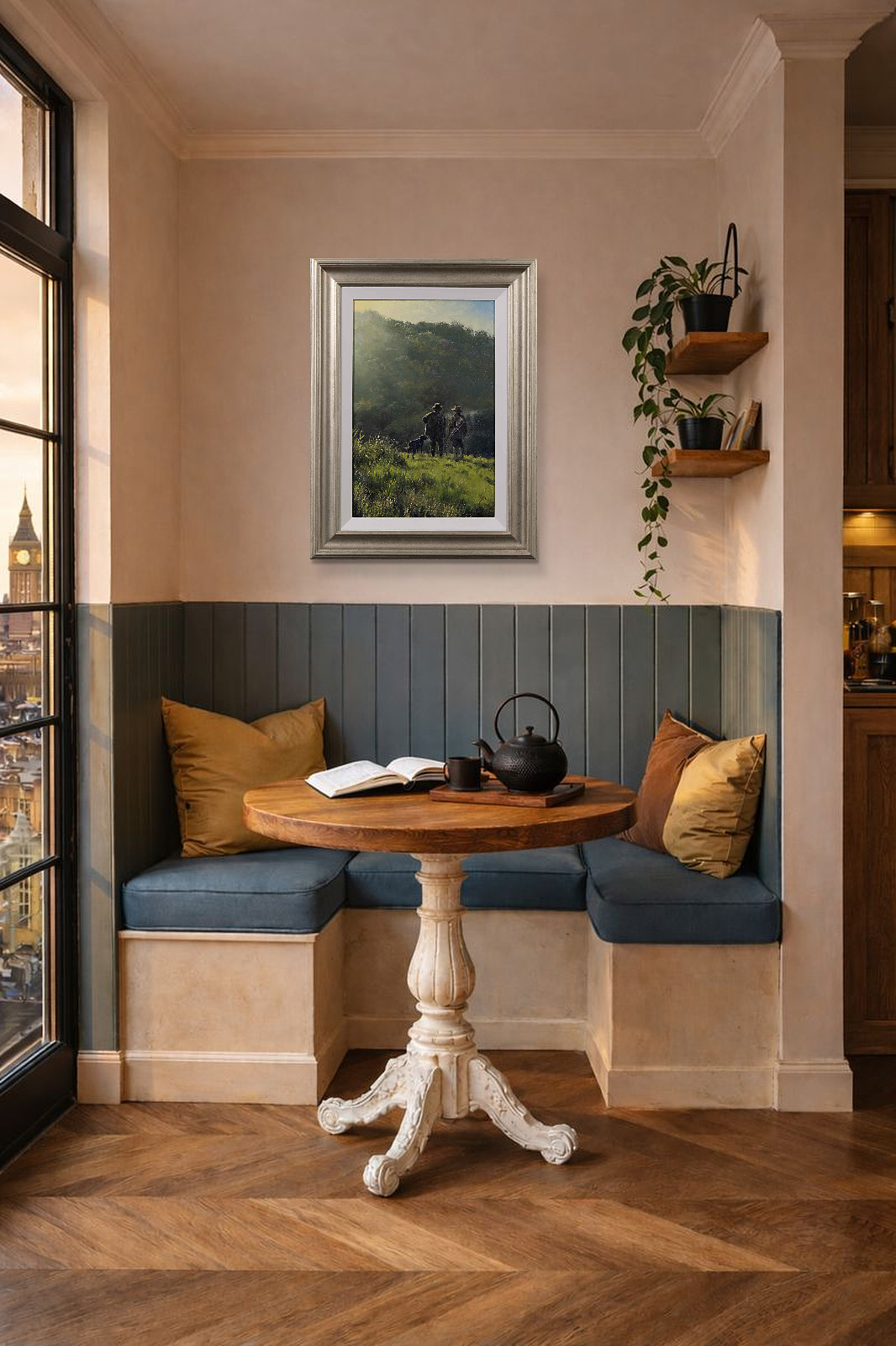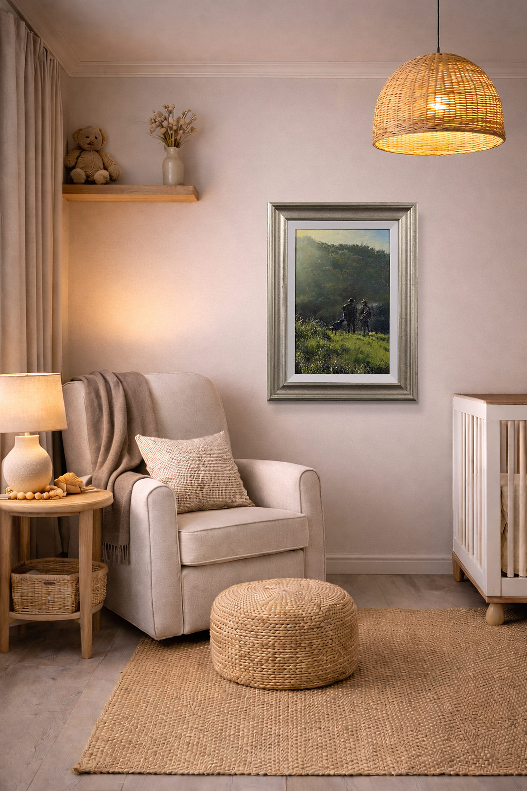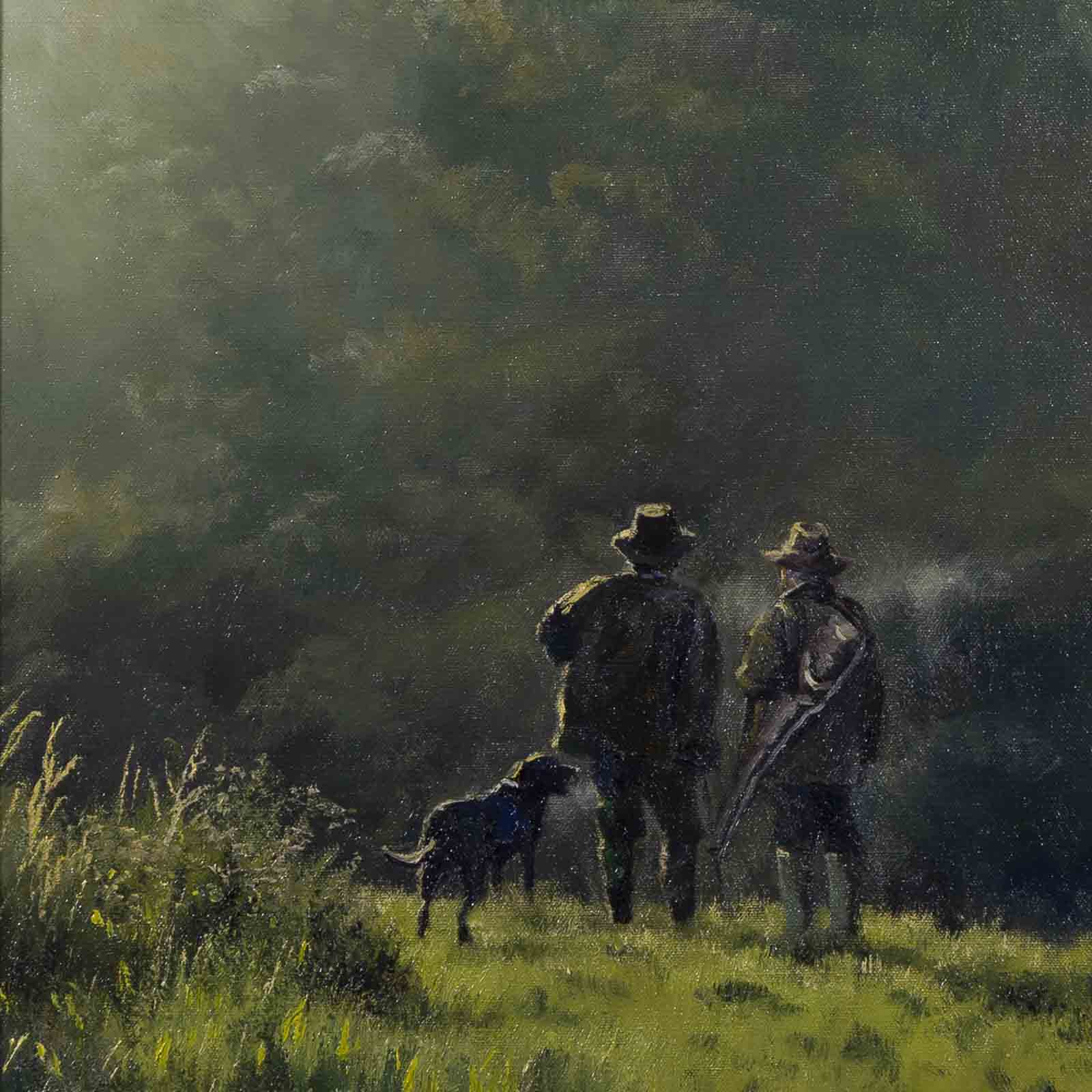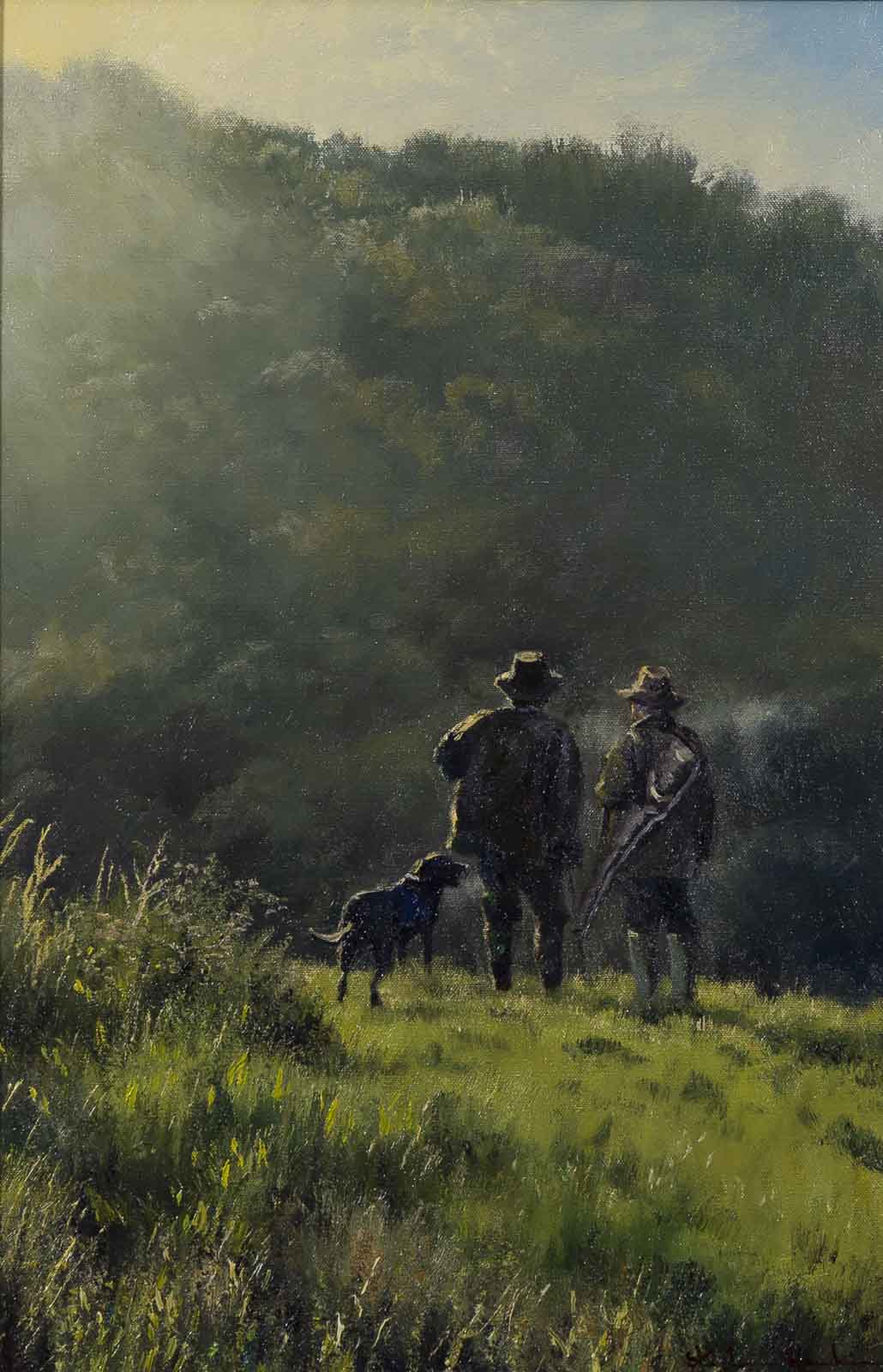 Atmospheric countryside scene in oil by talented British artist Stephen Hawkins. Framed with a slim white slip and a warm distressed silver frame as shown.
