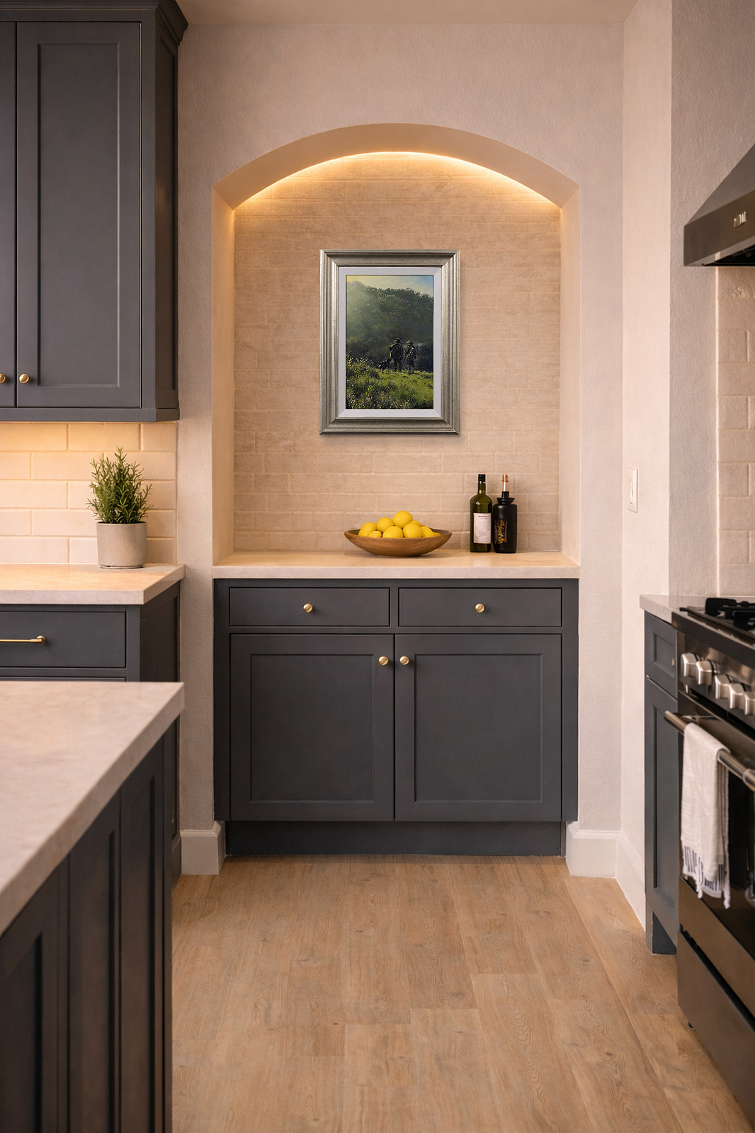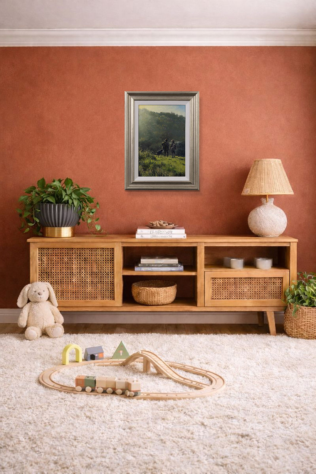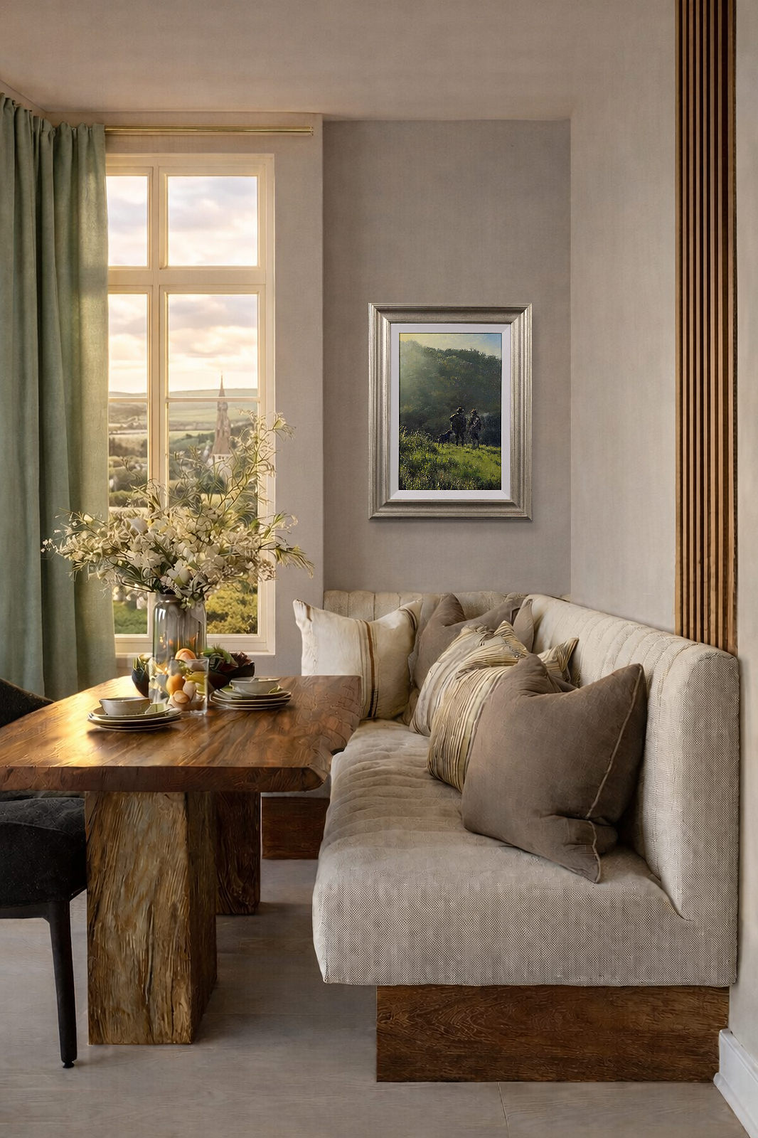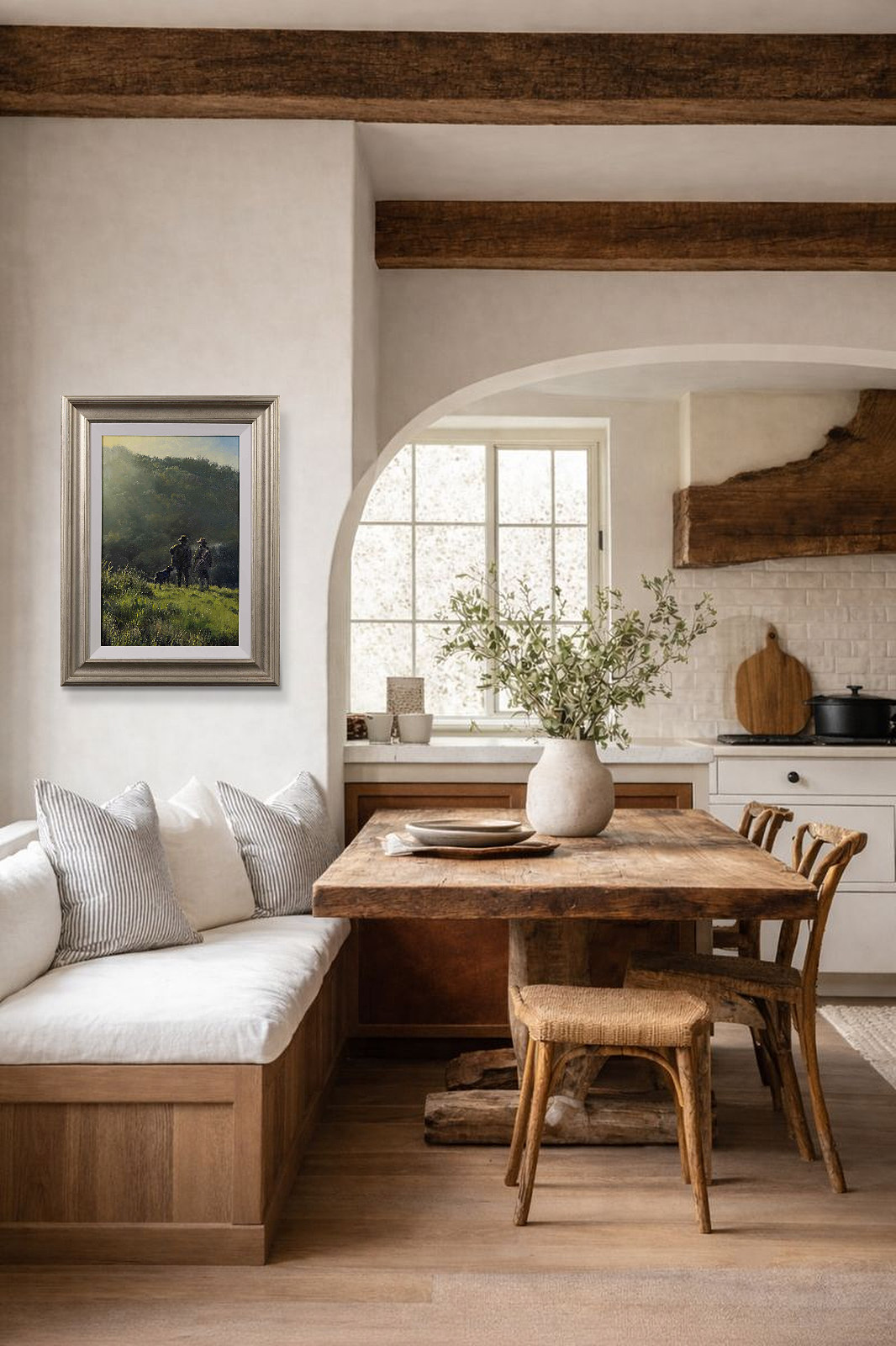 Atmospheric countryside scene in oil by talented British artist Stephen Hawkins. Framed with a slim white slip and a warm distressed silver frame as shown.