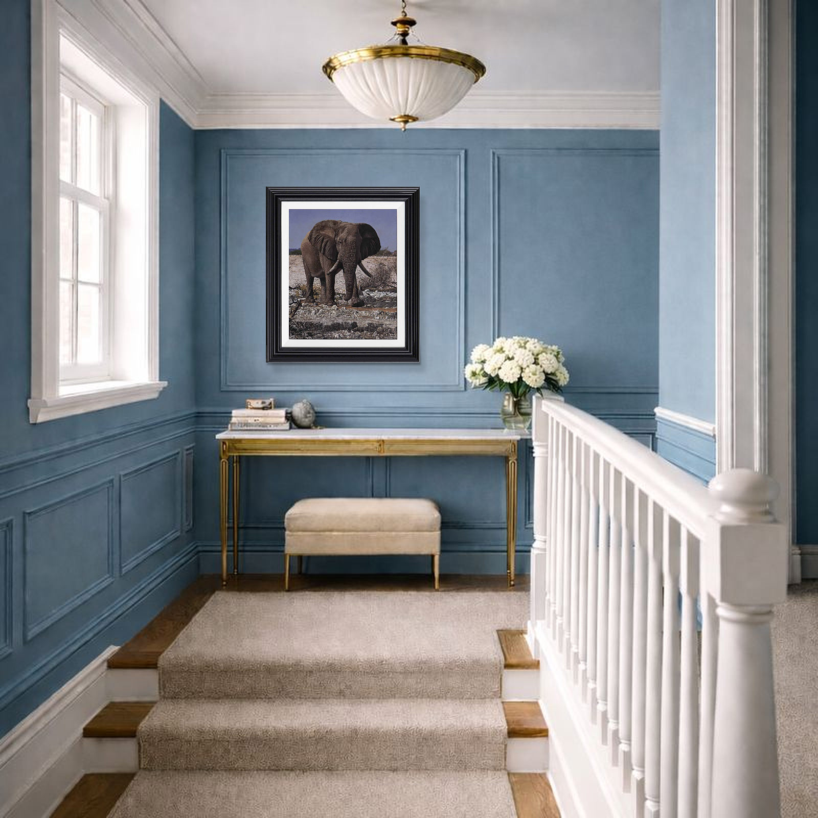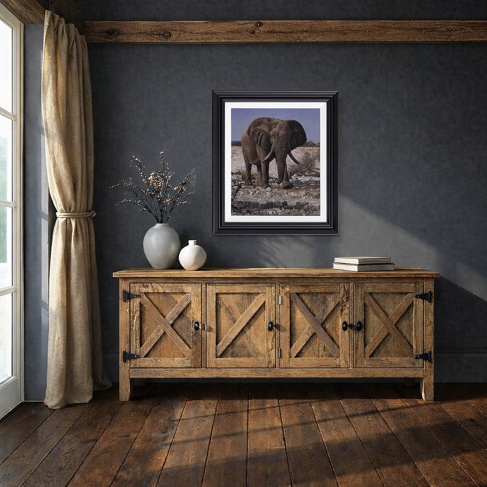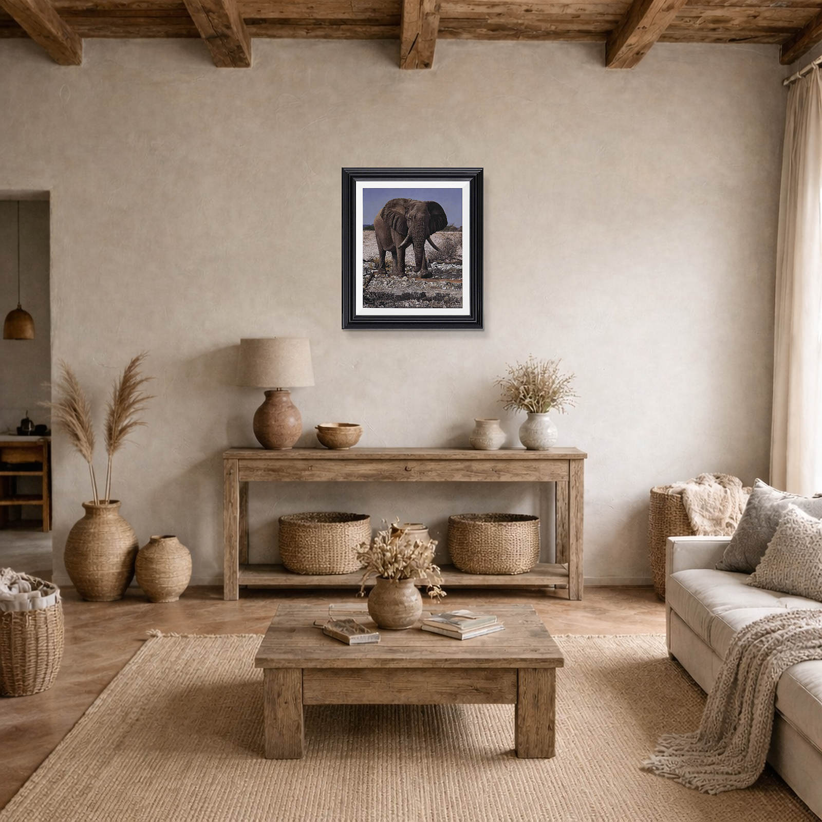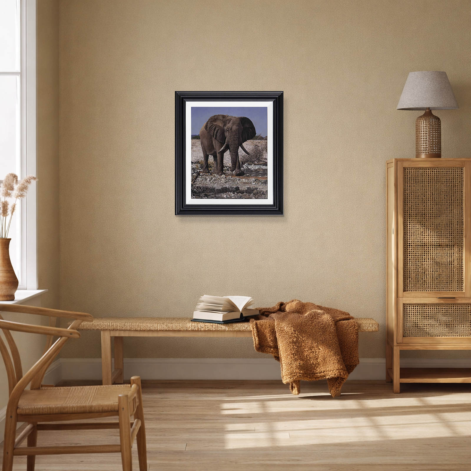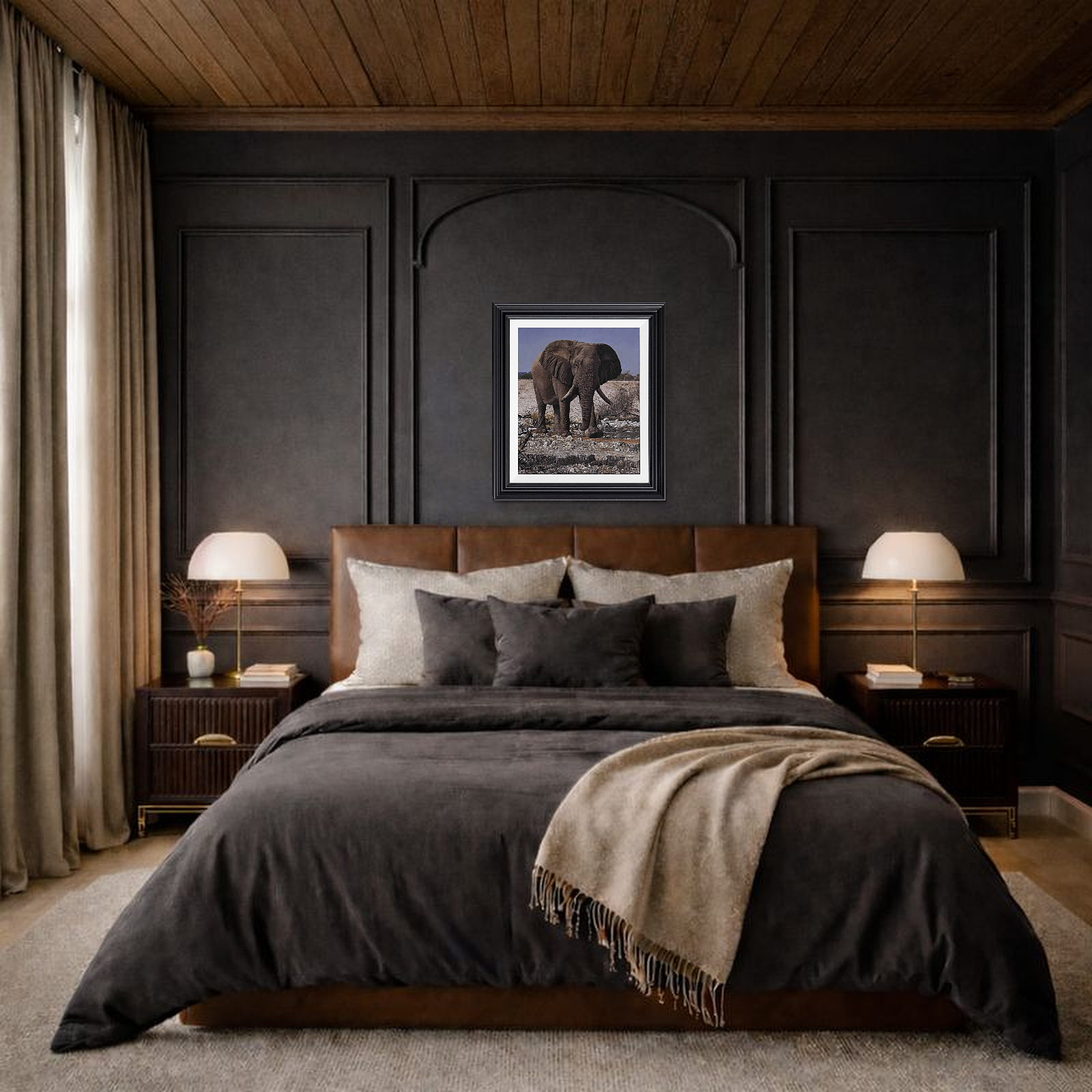 Exquisite original oil painting of an African elephant by Stephen Park. Presented framed in a white slip and pewter finish frame as shown and ready to hang.