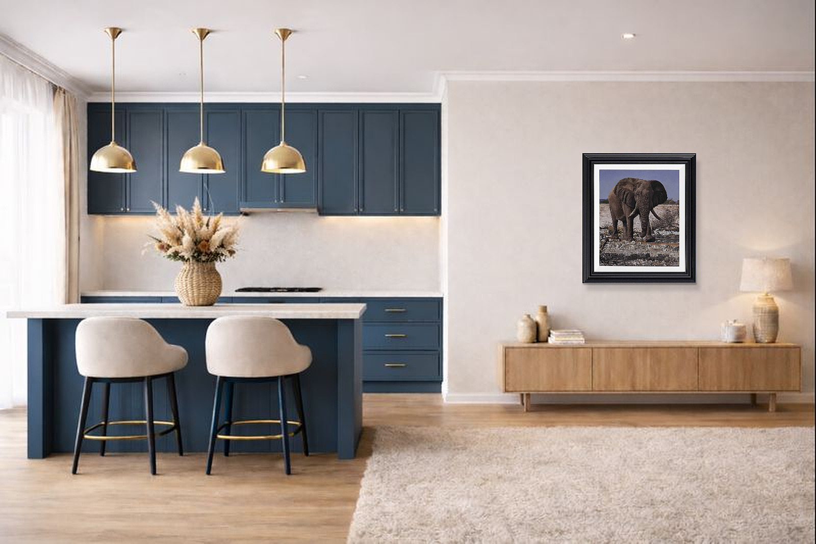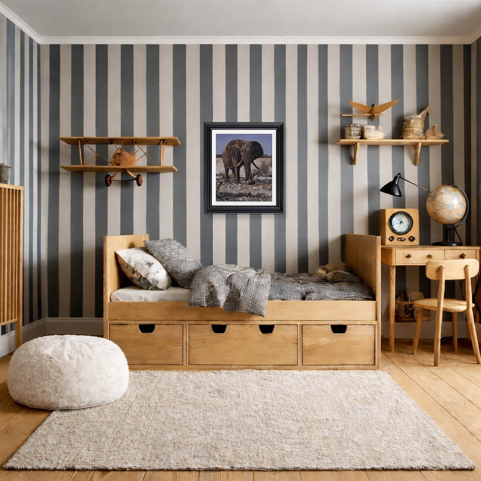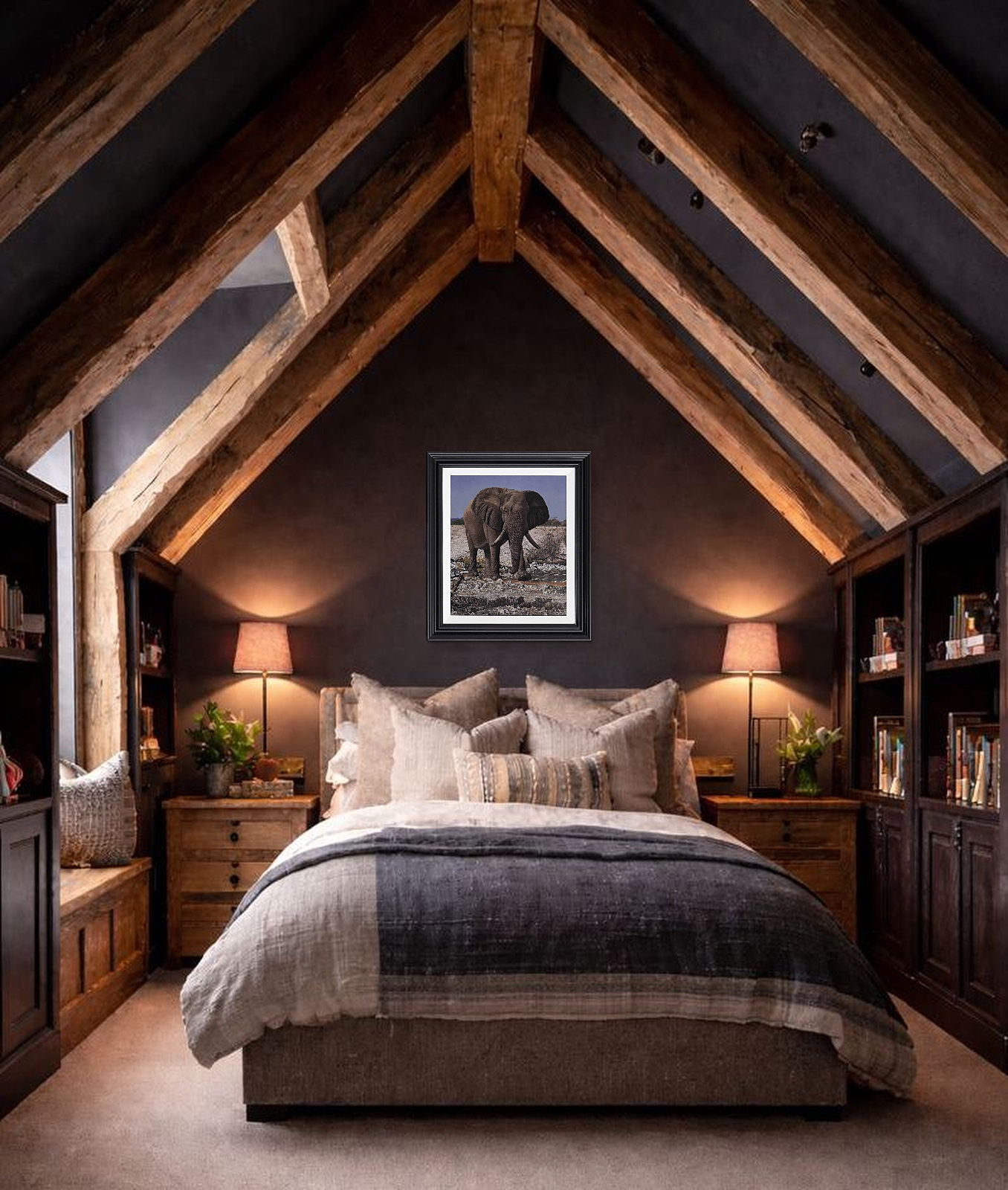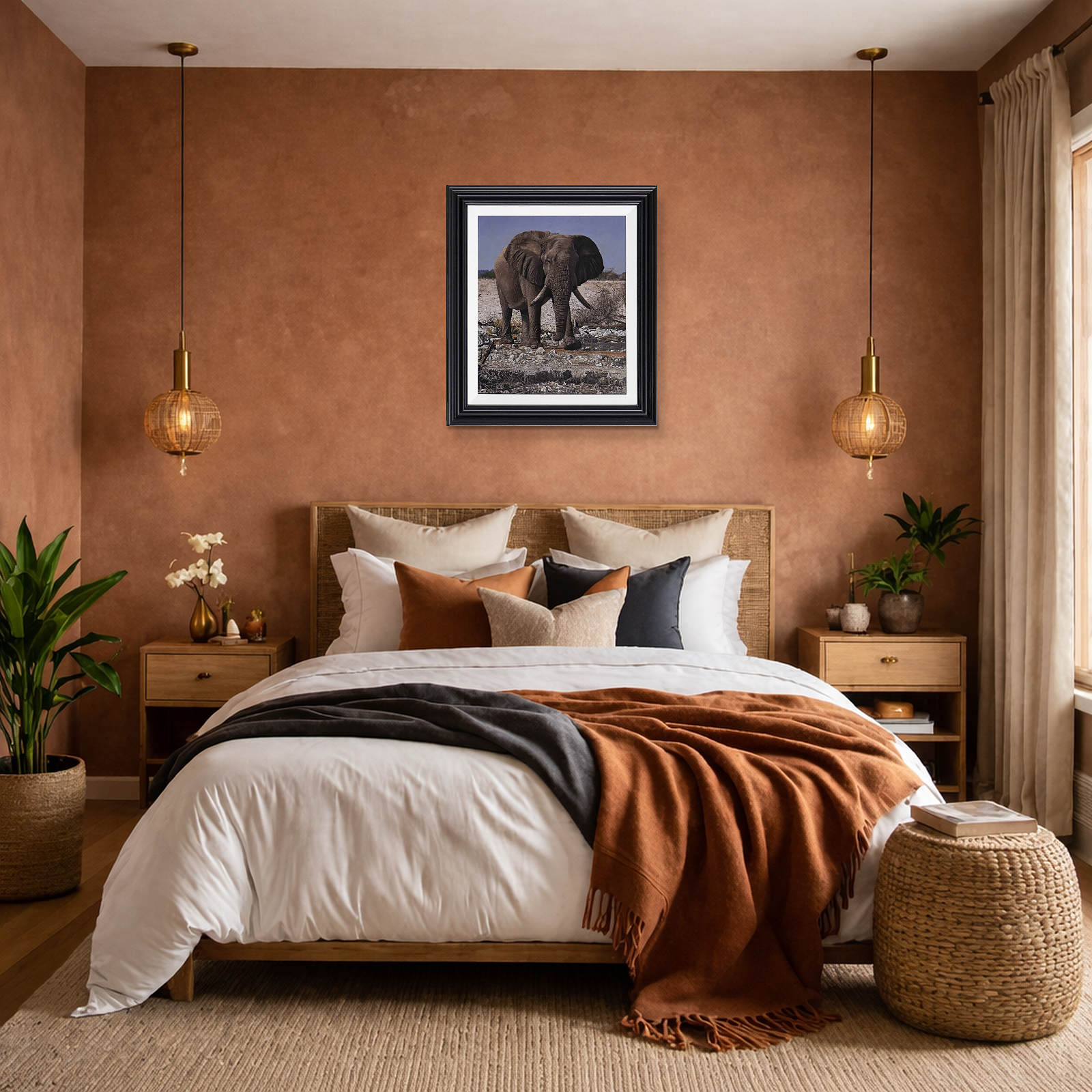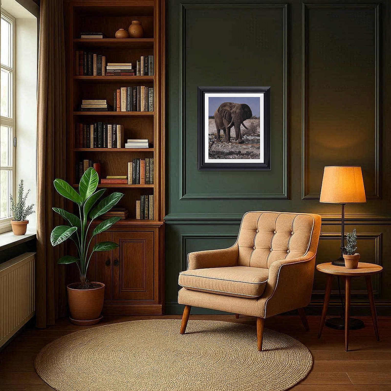 Exquisite original oil painting of an African elephant by Stephen Park. Presented framed in a white slip and pewter finish frame as shown and ready to hang.