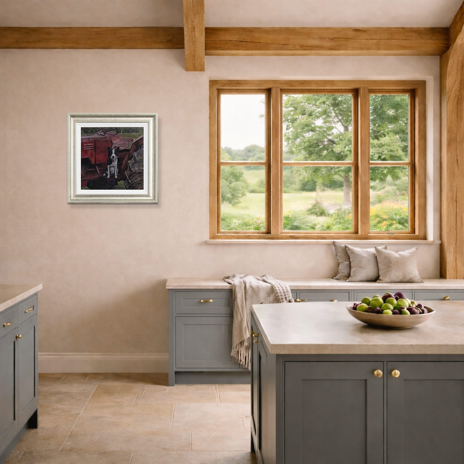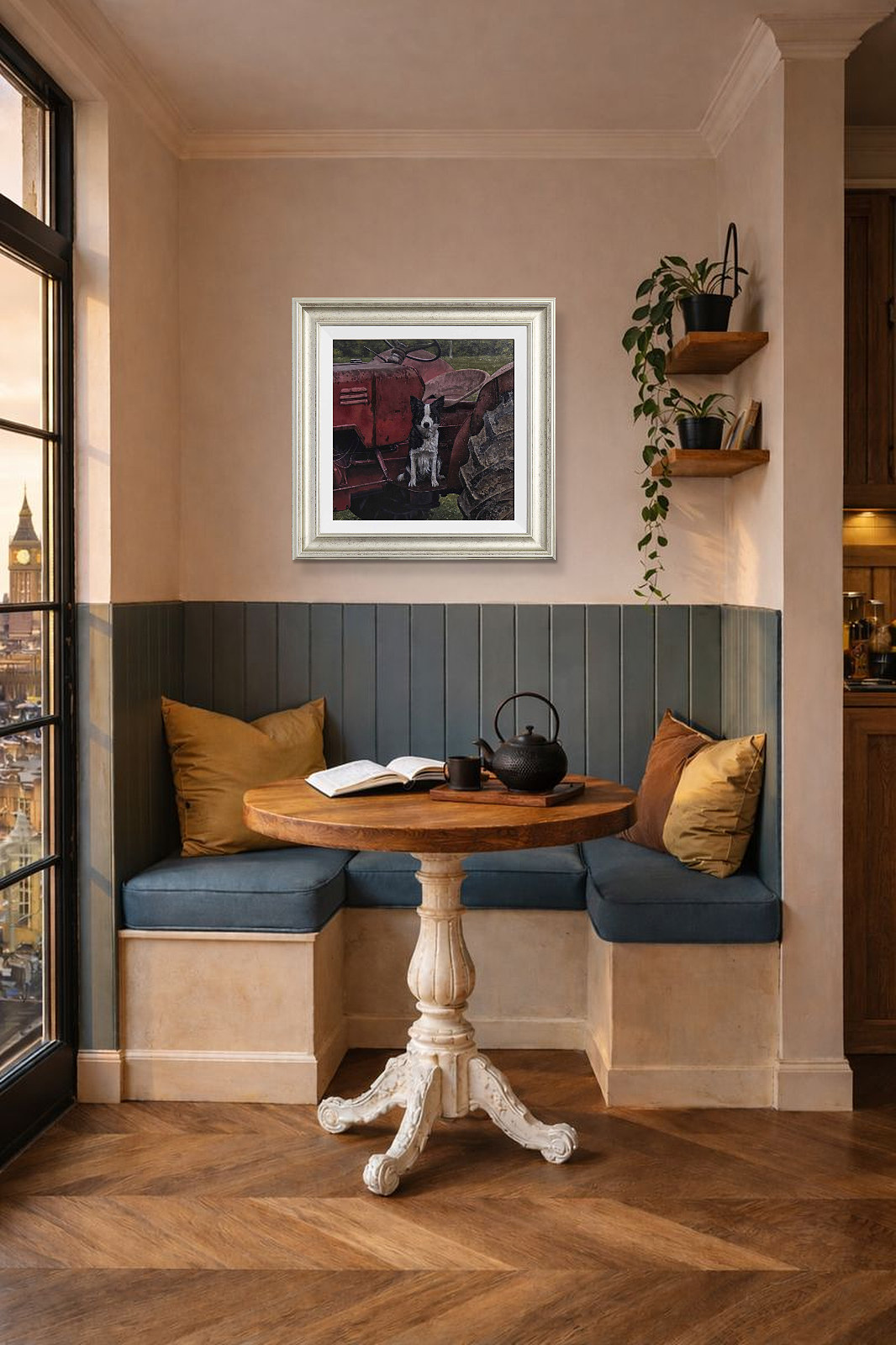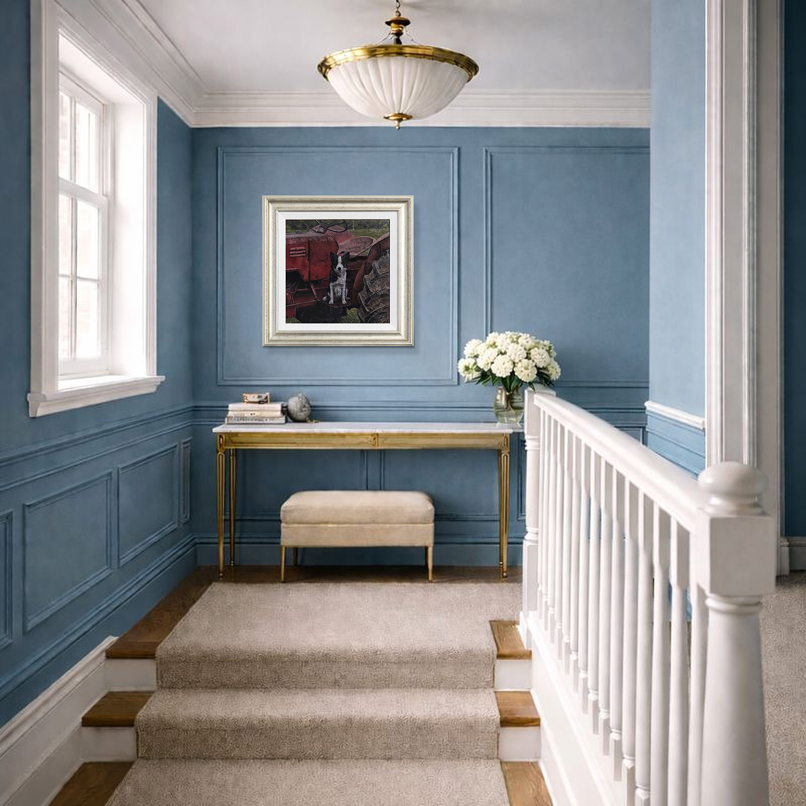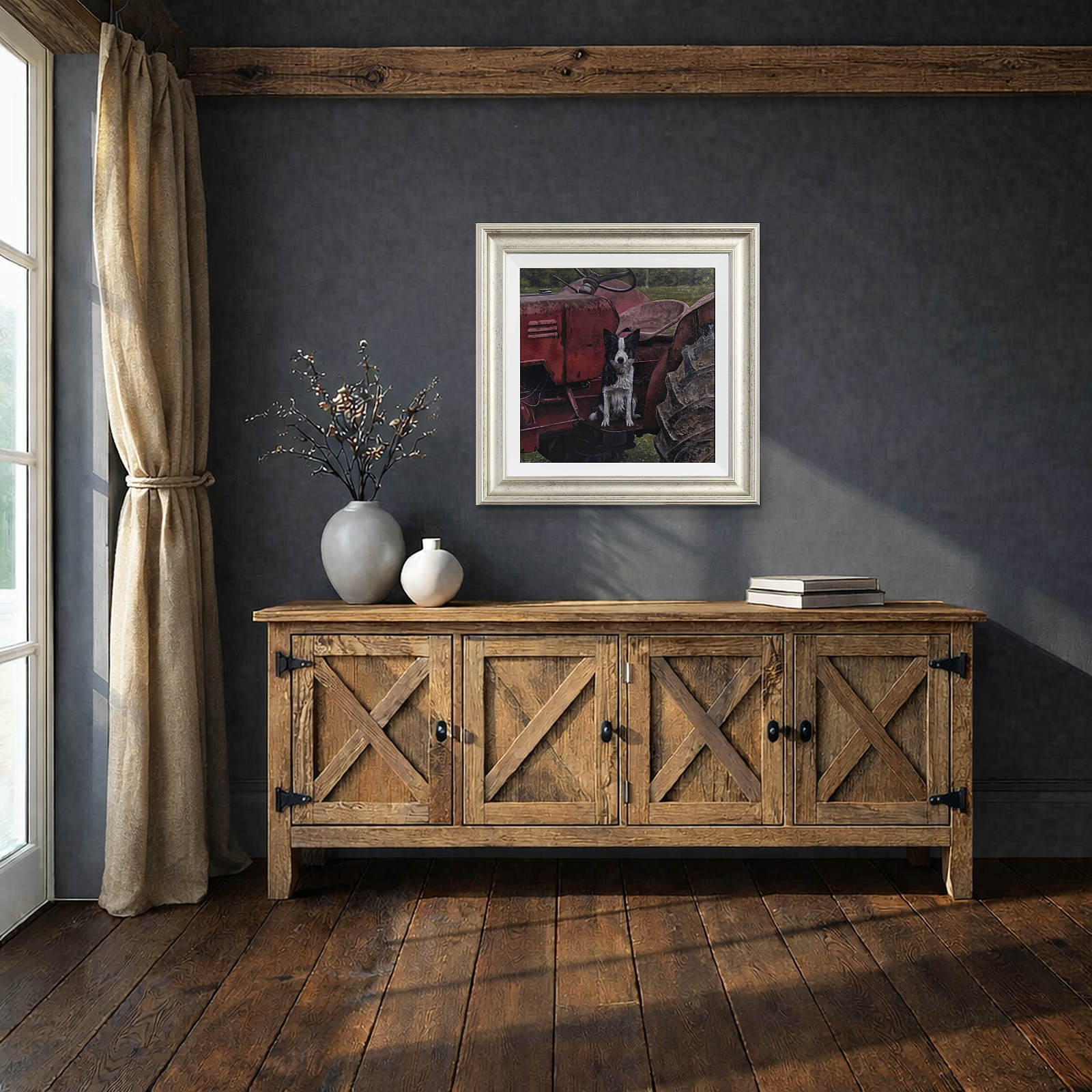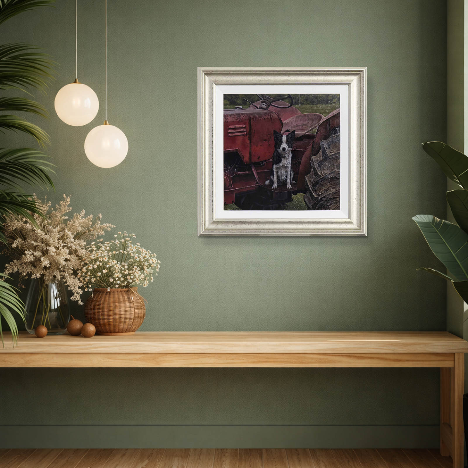 A border collie perched atop a red tractor stands watch; expertly completed original oil painting by British artist Stephen Park. Presented framed in a white slip and pewter finish frame as shown and ready to hang.