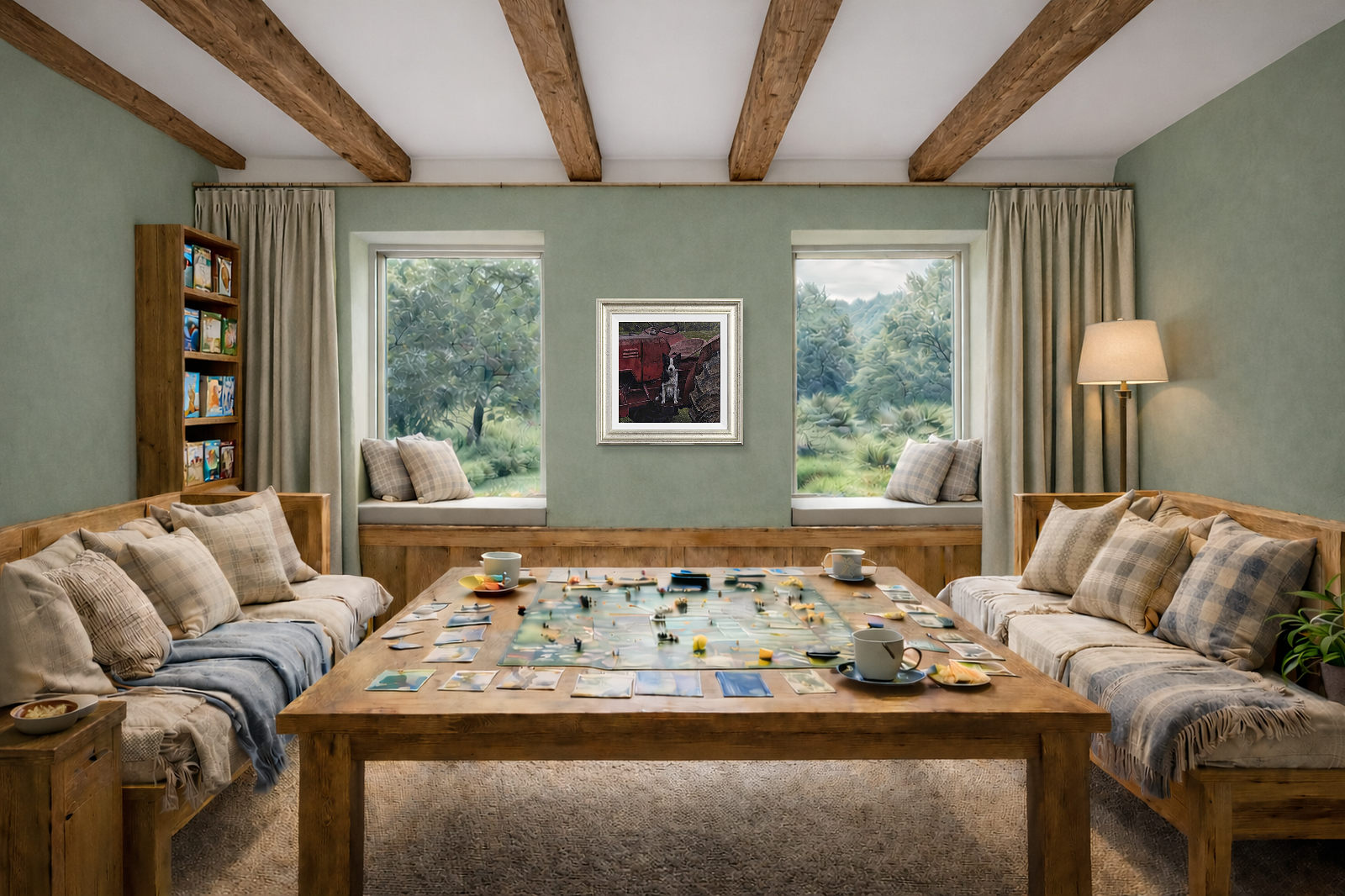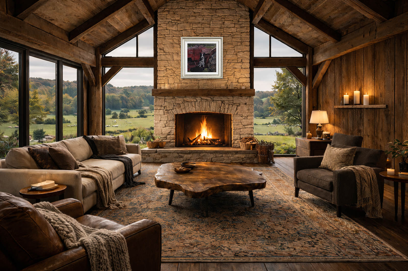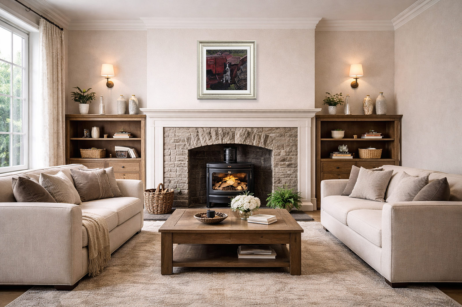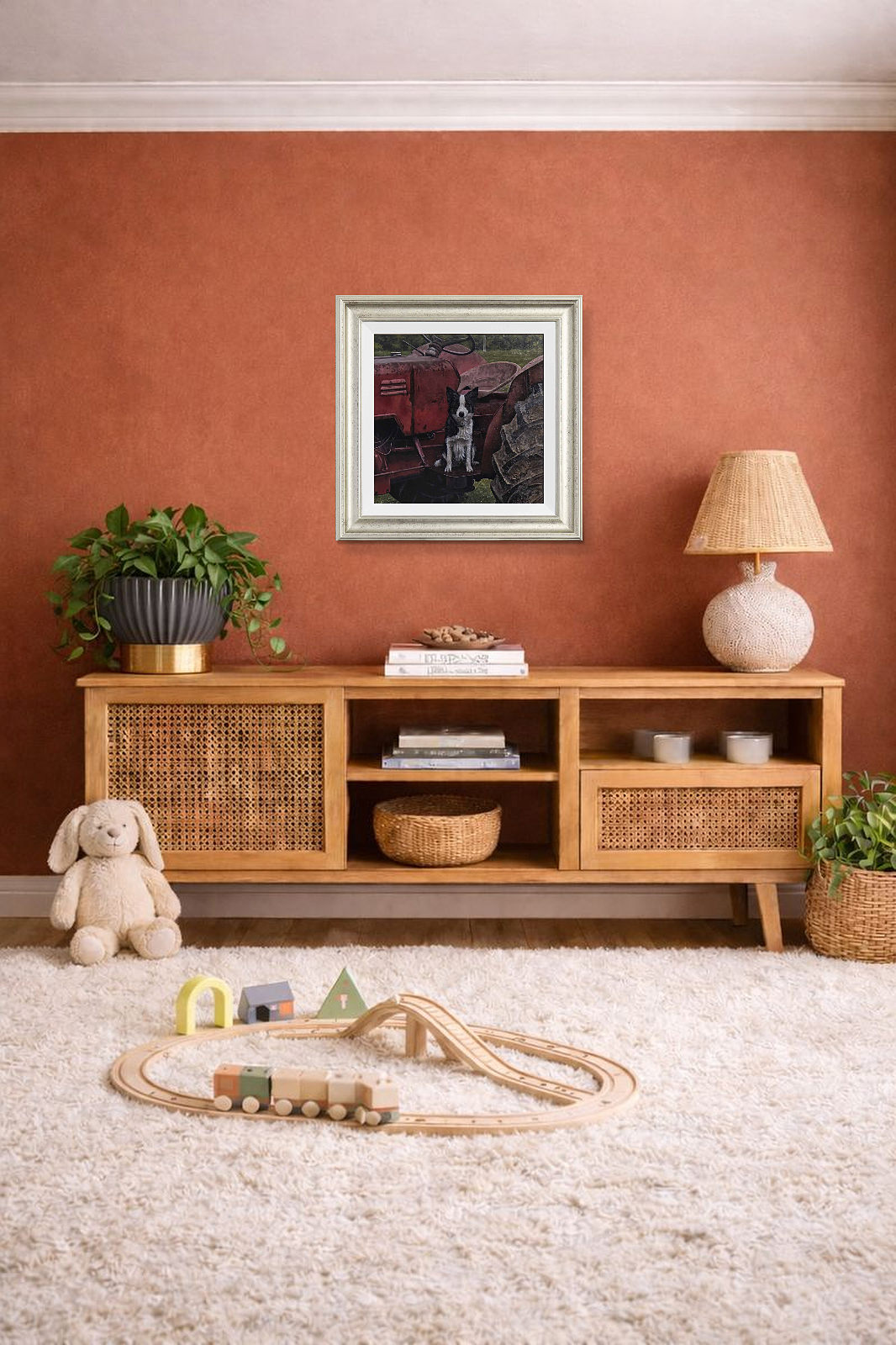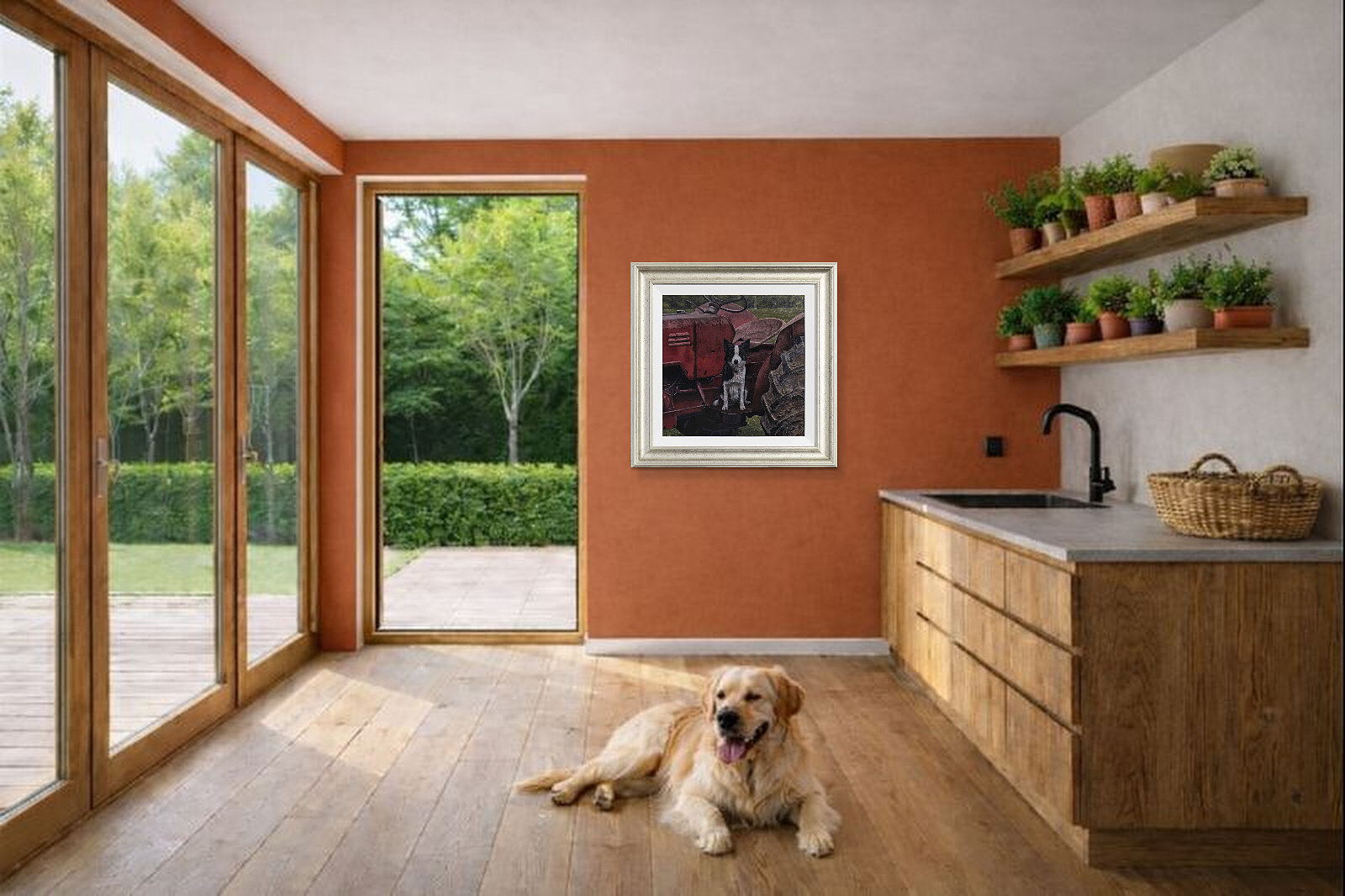 A border collie perched atop a red tractor stands watch; expertly completed original oil painting by British artist Stephen Park. Presented framed in a white slip and pewter finish frame as shown and ready to hang.