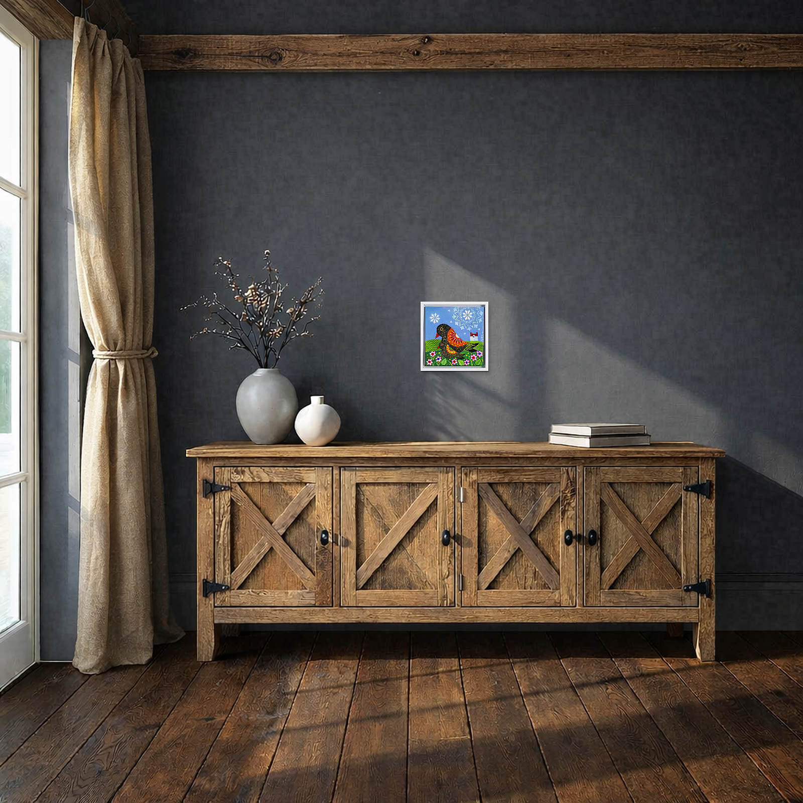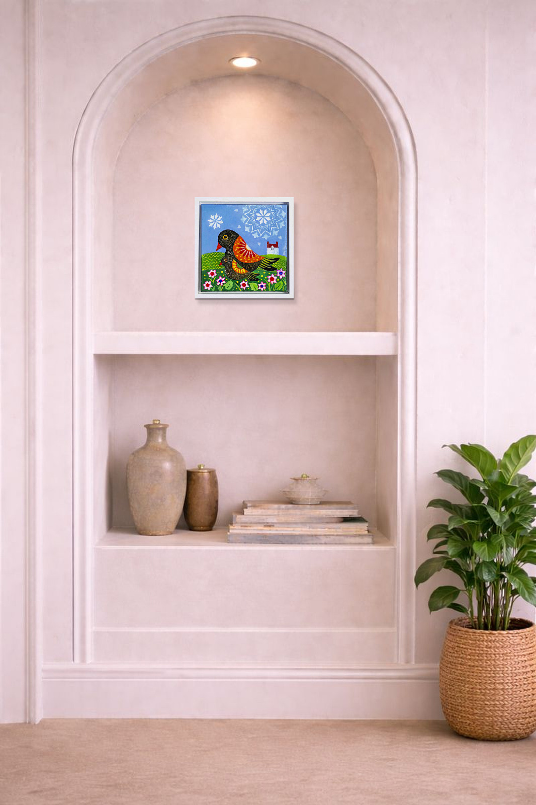 A cute and colourful original painting by Indian born artist Sunita Khedekar. Sunita invites us to enjoy her magical world in this naïve style painting from her ‘Birds Series’. Presented framed in contemporary white tray frame and ready to hang.