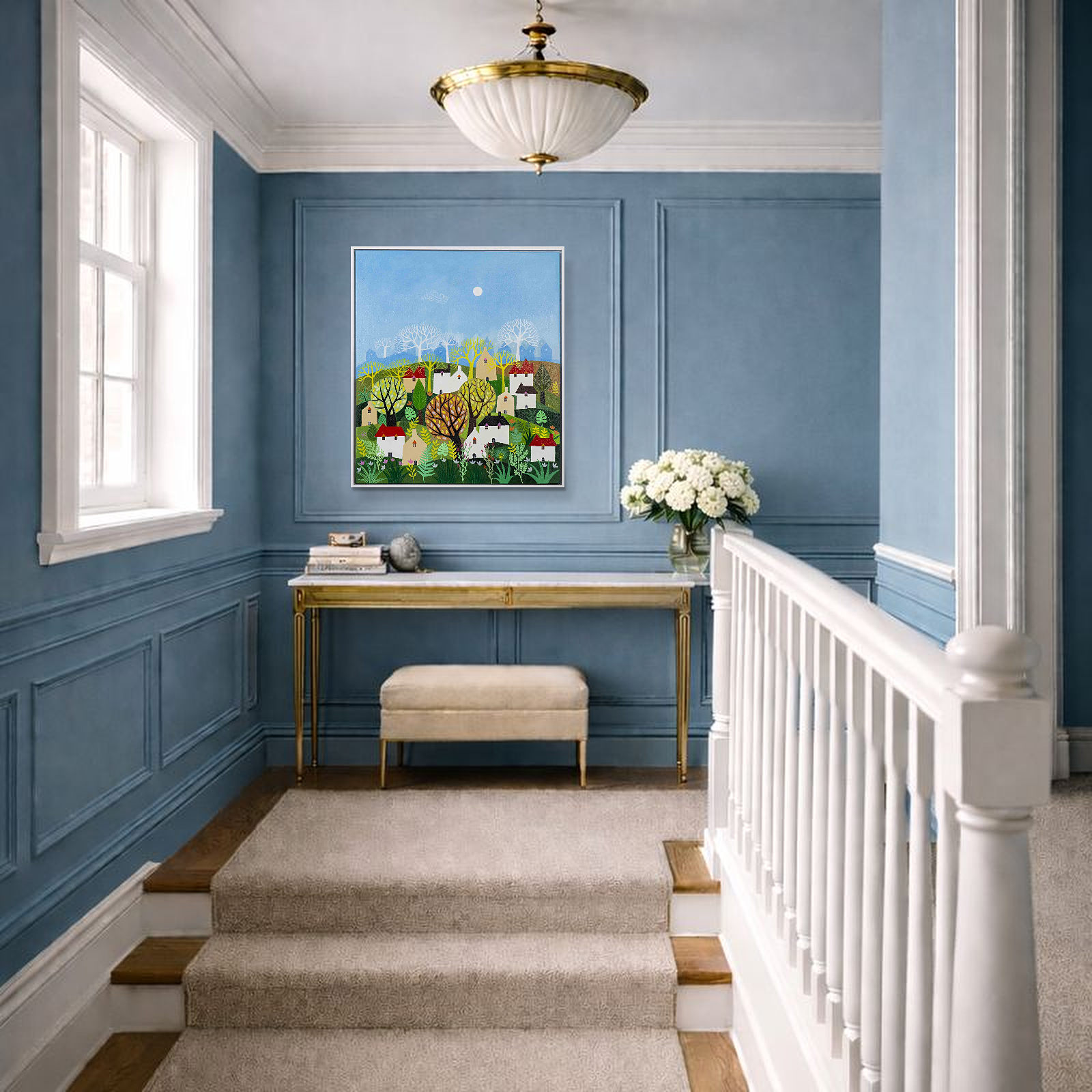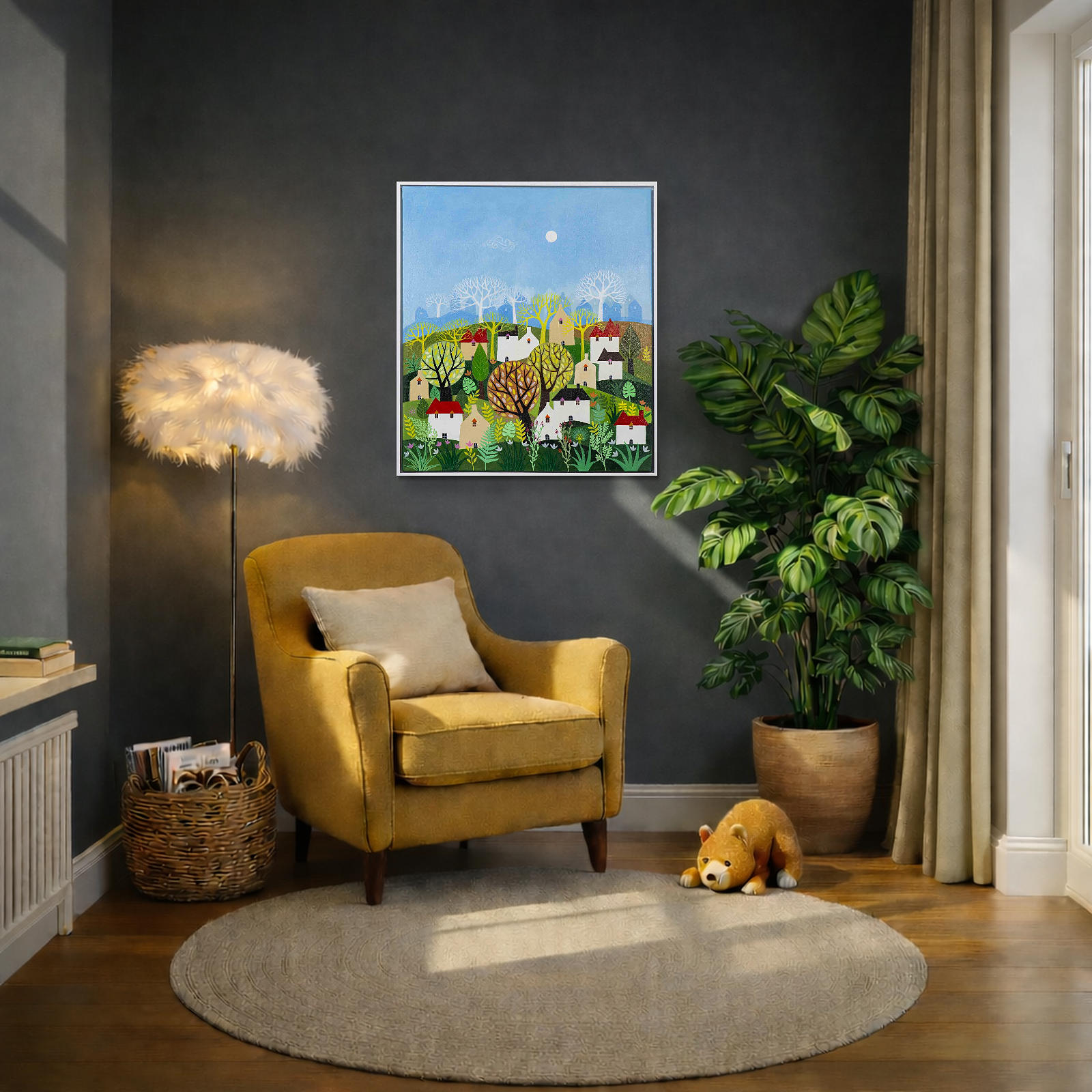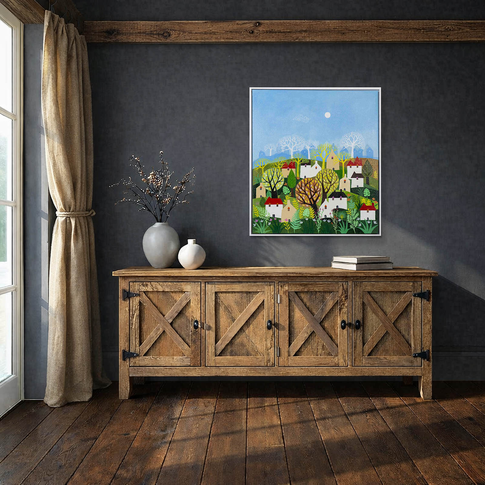 A colourful original painting by Indian born artist Sunita Khedekar. Sunita invites us to enjoy her magical world in this semi abstracted naïve style painting. Presented framed in contemporary white float frame and ready to hang.