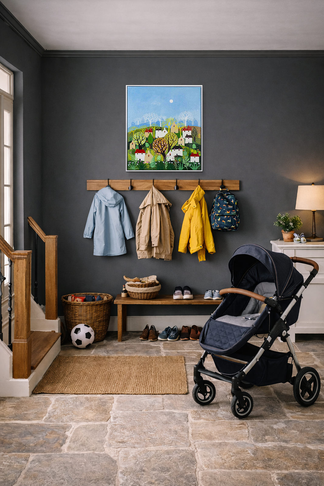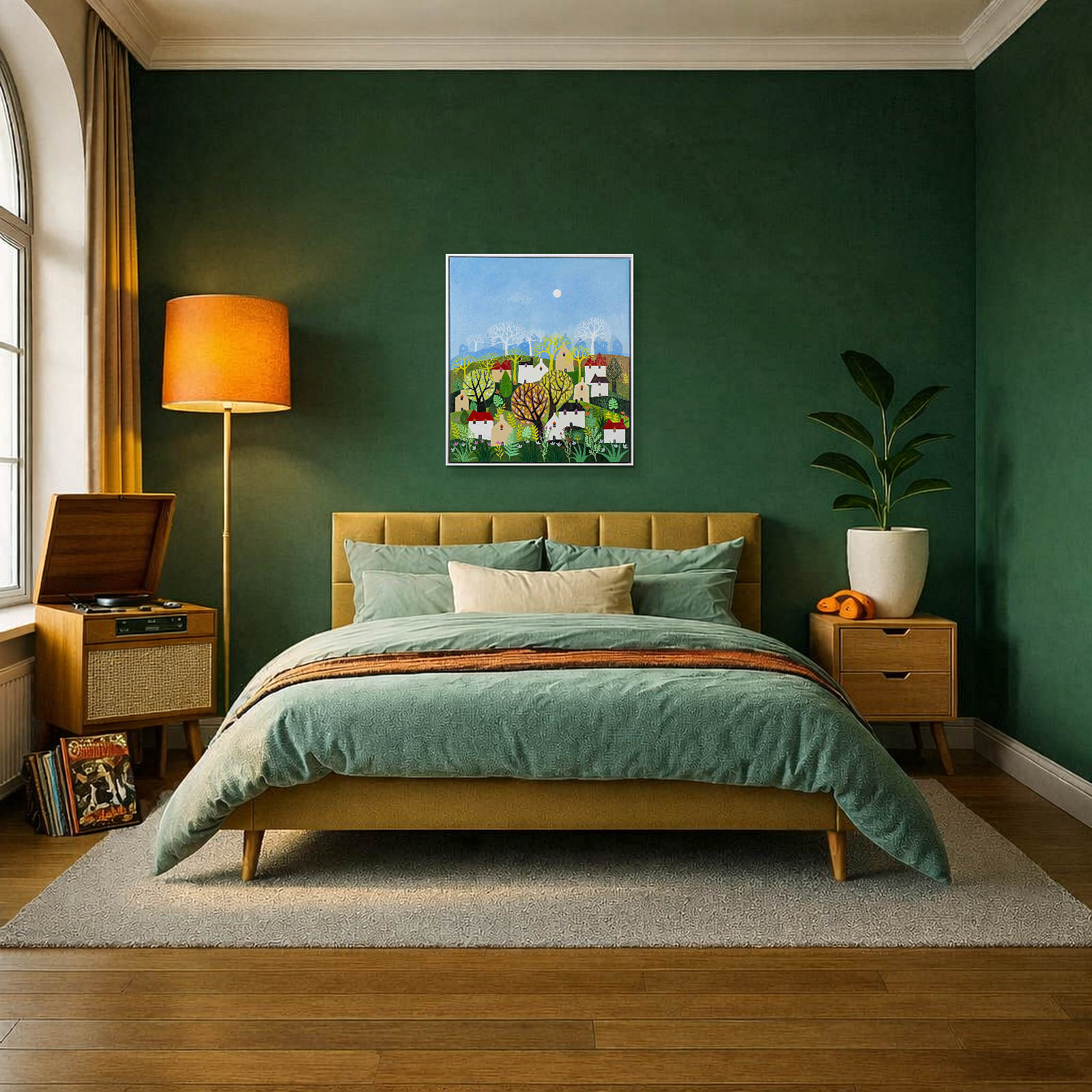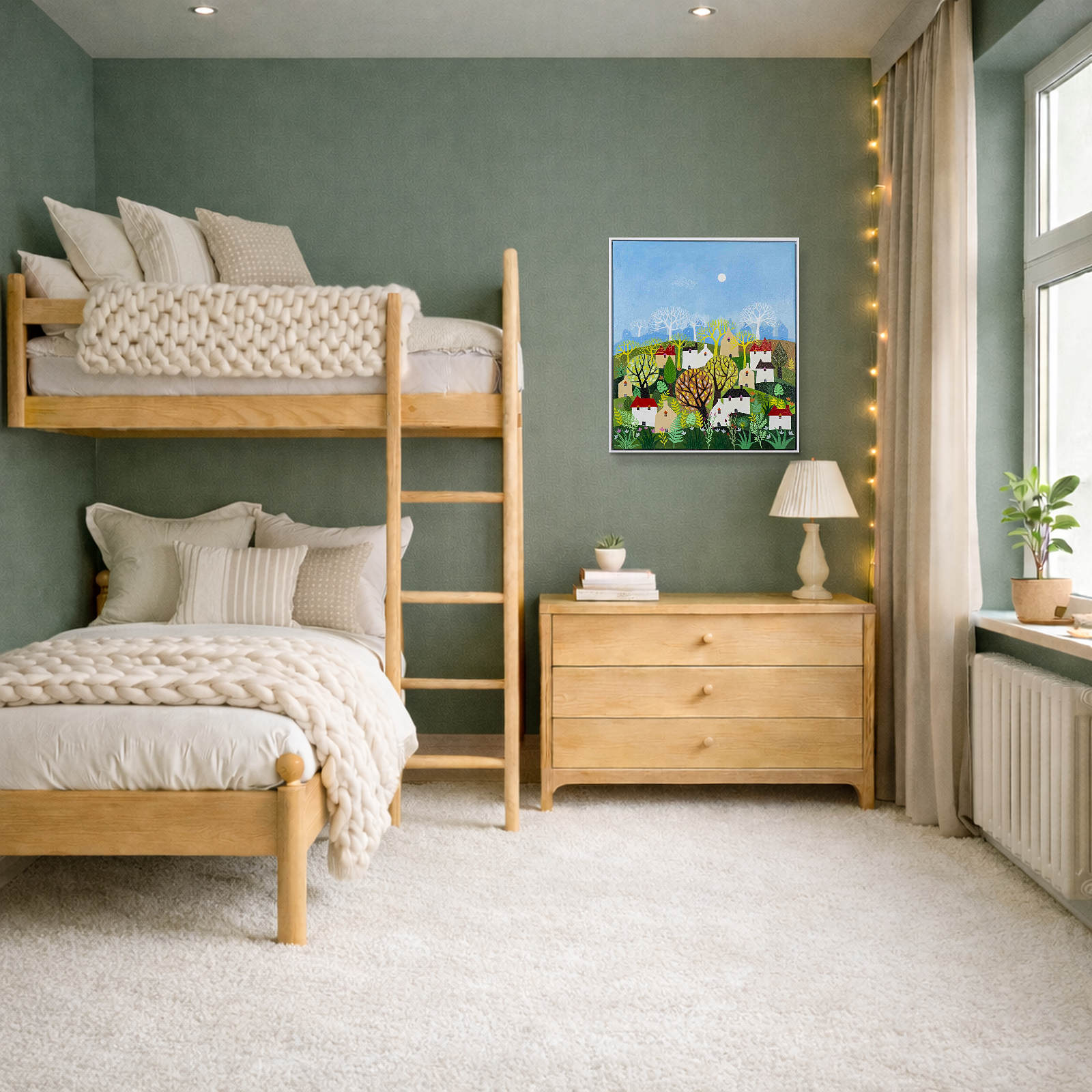 A colourful original painting by Indian born artist Sunita Khedekar. Sunita invites us to enjoy her magical world in this semi abstracted naïve style painting. Presented framed in contemporary white float frame and ready to hang.