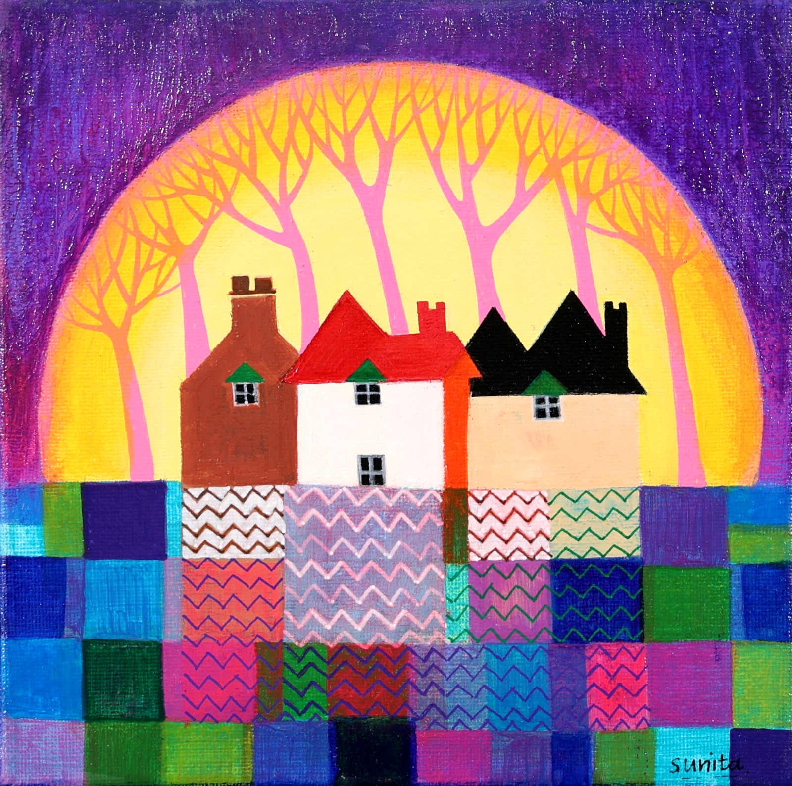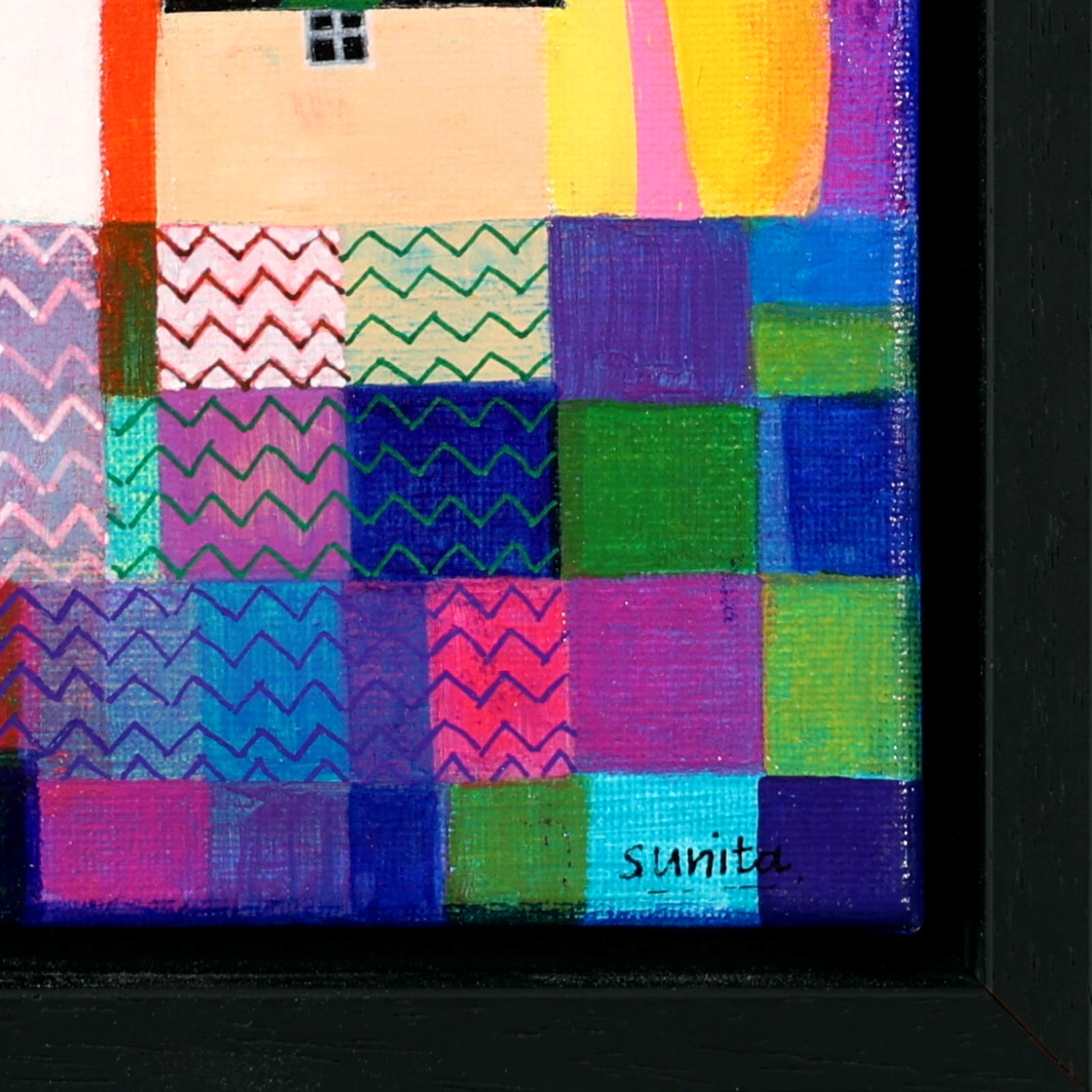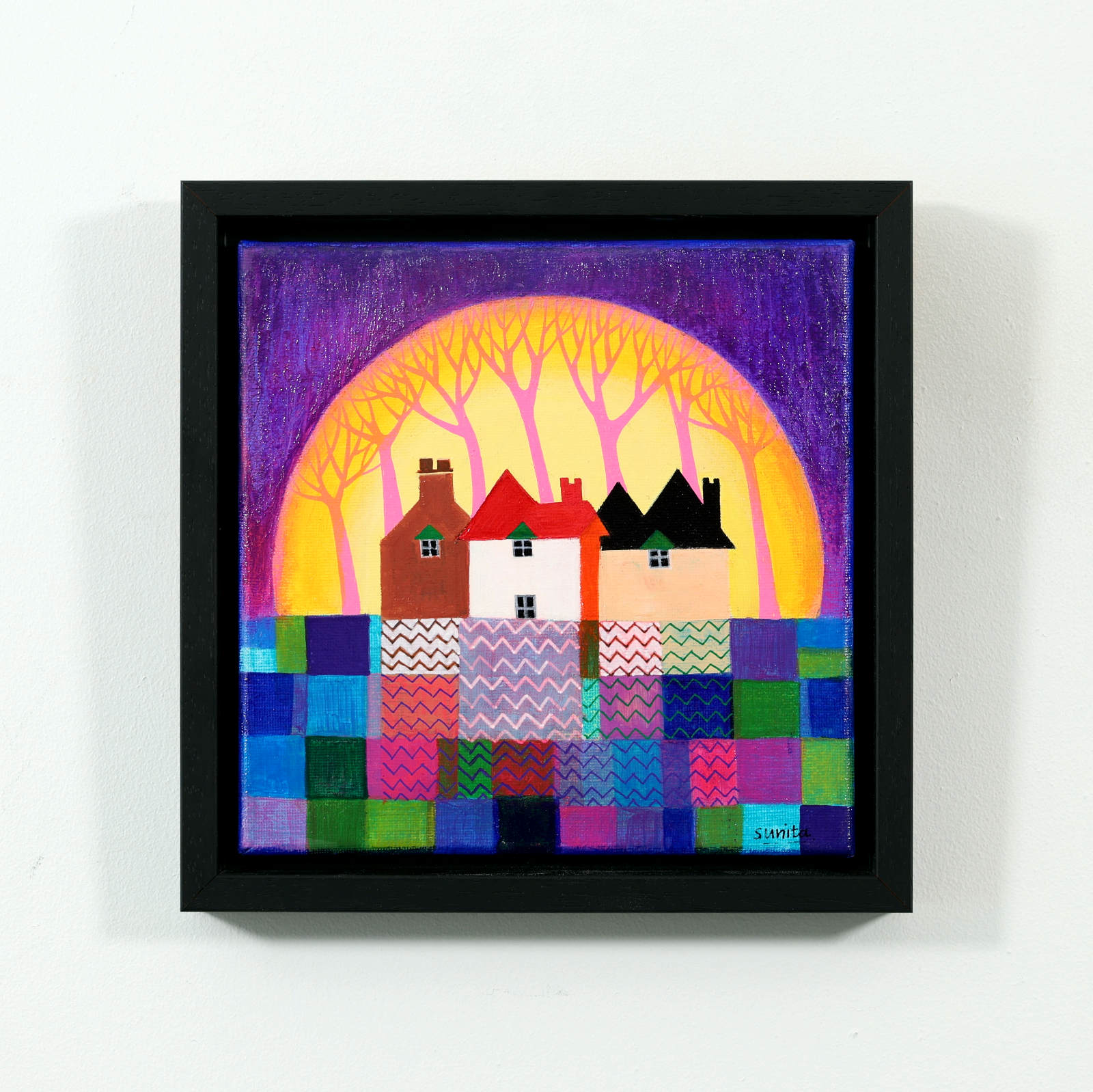 A cute and colourful original painting by Indian born artist Sunita Khedekar. Sunita invites us to enjoy her magical world in this naïve style painting. Presented framed in contemporary black tray frame and ready to hang.