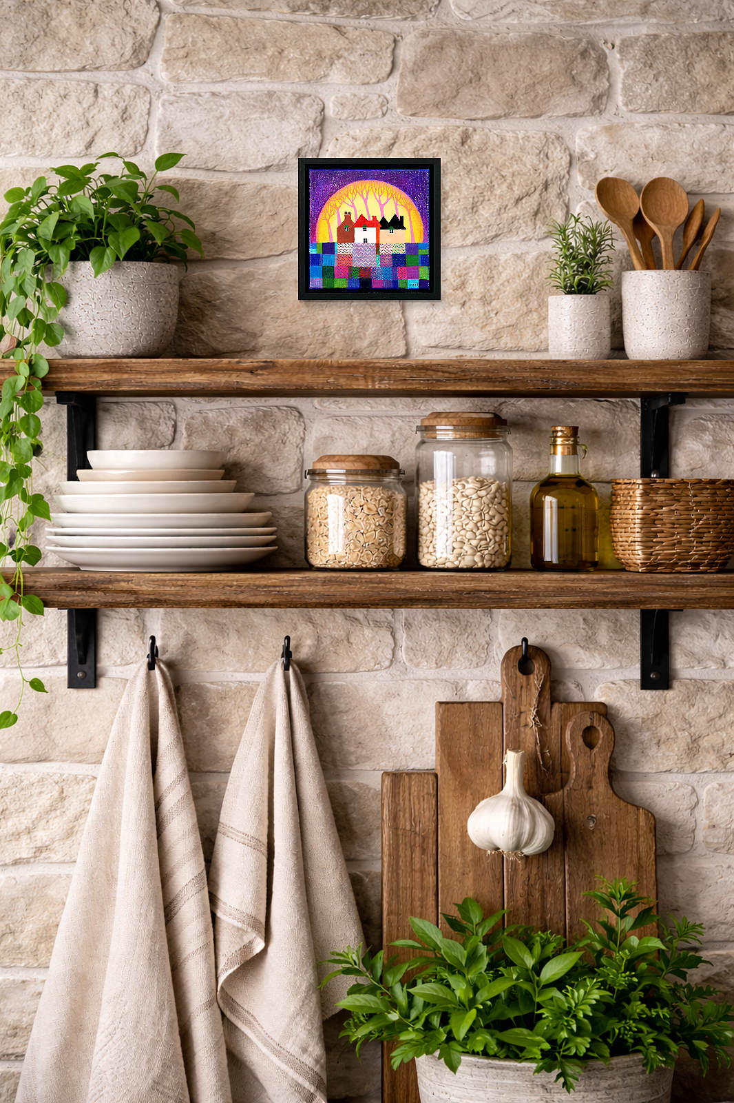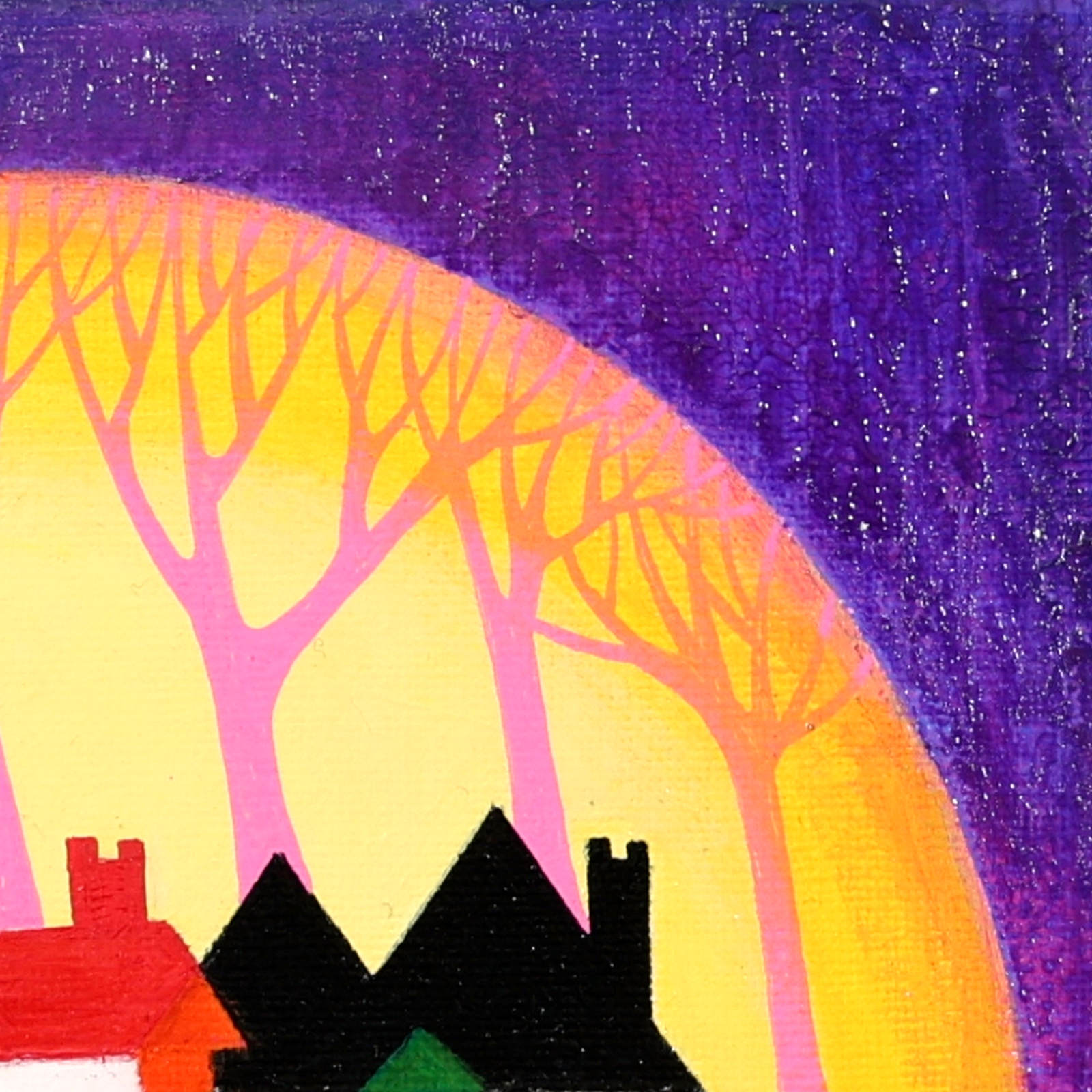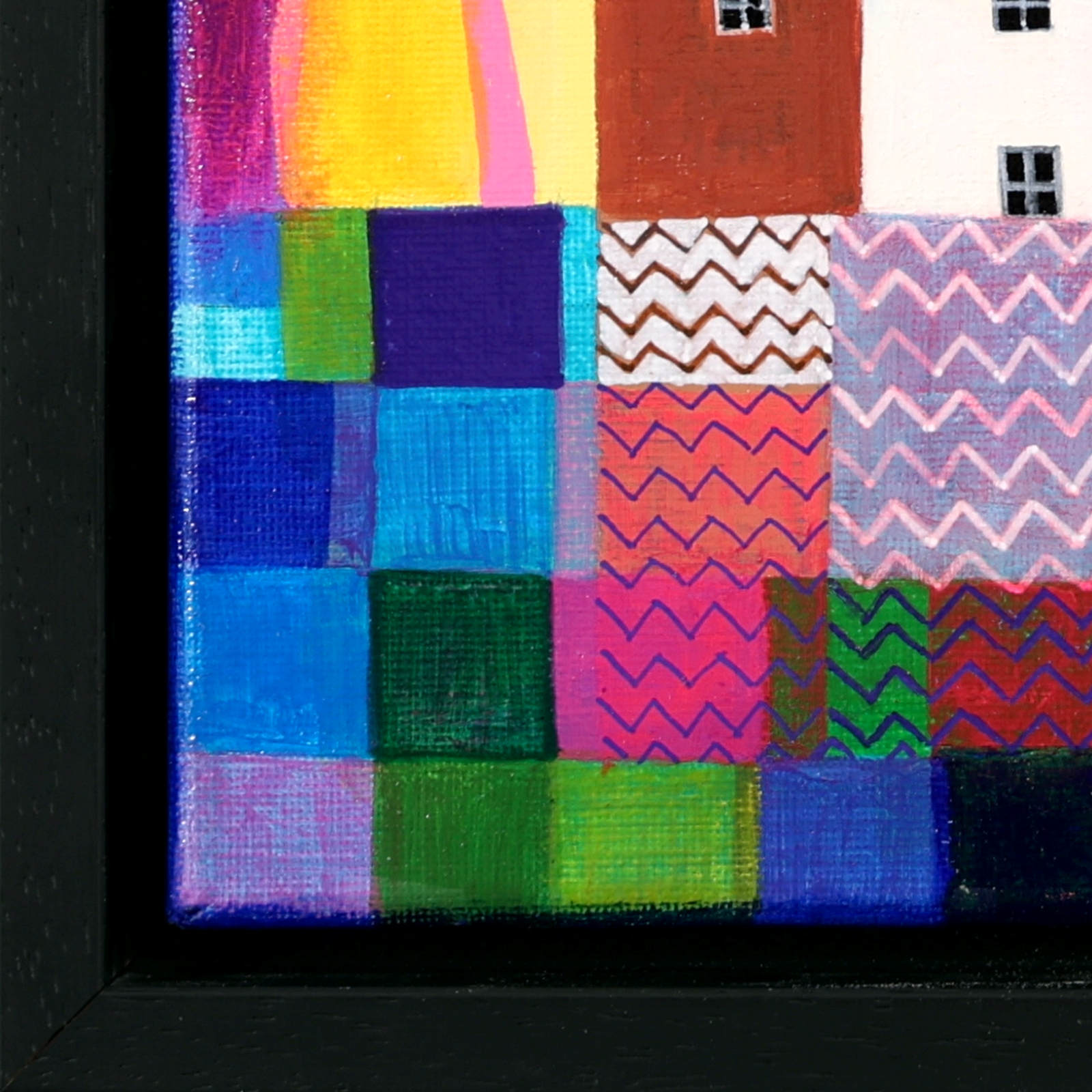 A cute and colourful original painting by Indian born artist Sunita Khedekar. Sunita invites us to enjoy her magical world in this naïve style painting. Presented framed in contemporary black tray frame and ready to hang.