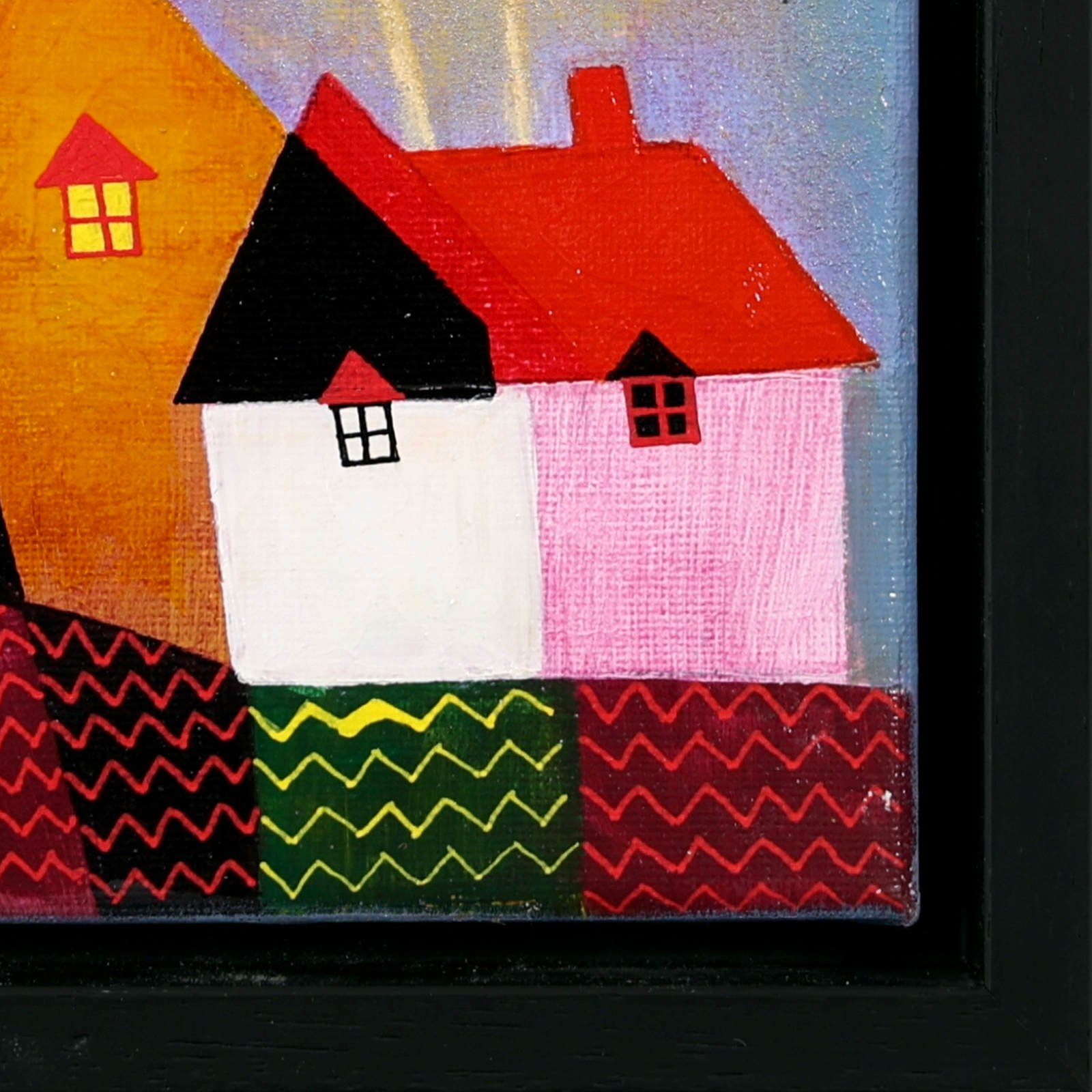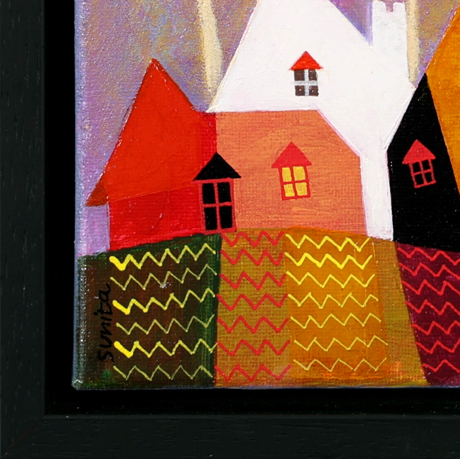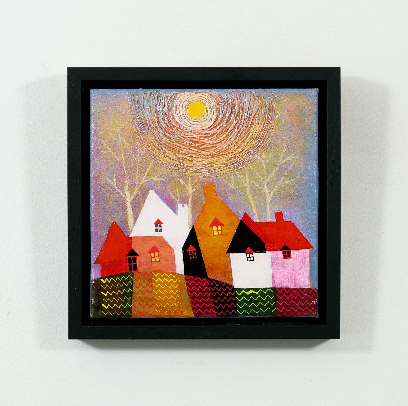 A cute and colourful original painting by Indian born artist Sunita Khedekar. Sunita invites us to enjoy her magical world in this naïve style painting. Presented framed in contemporary black tray frame and ready to hang.
