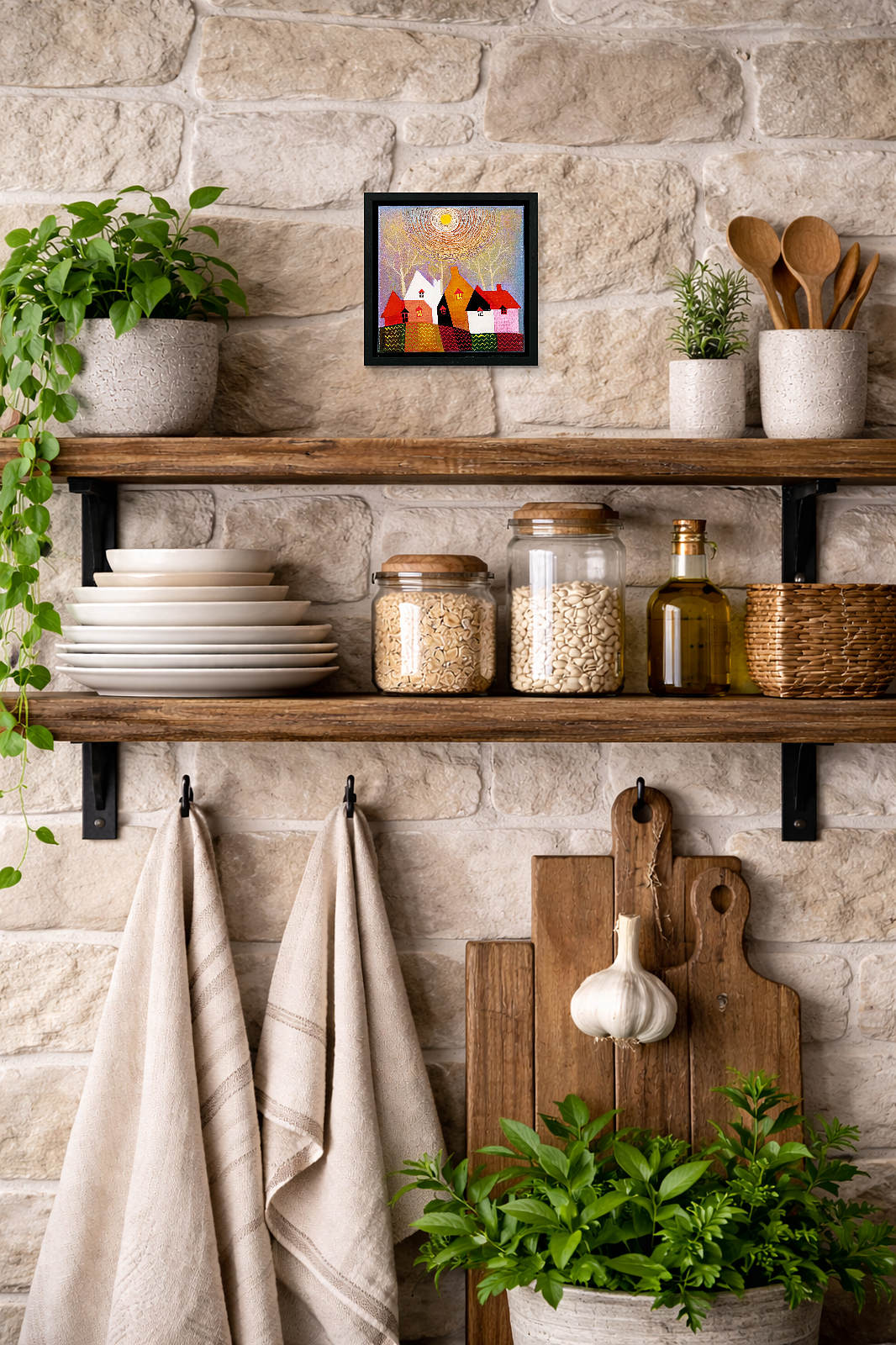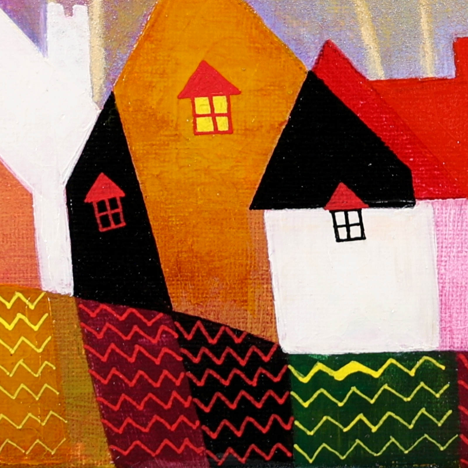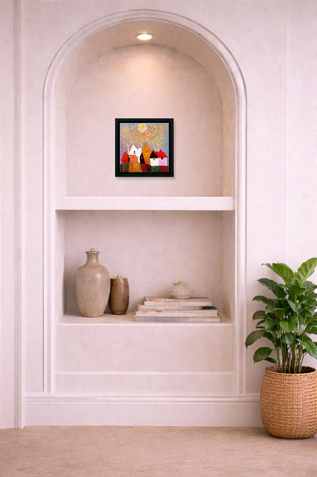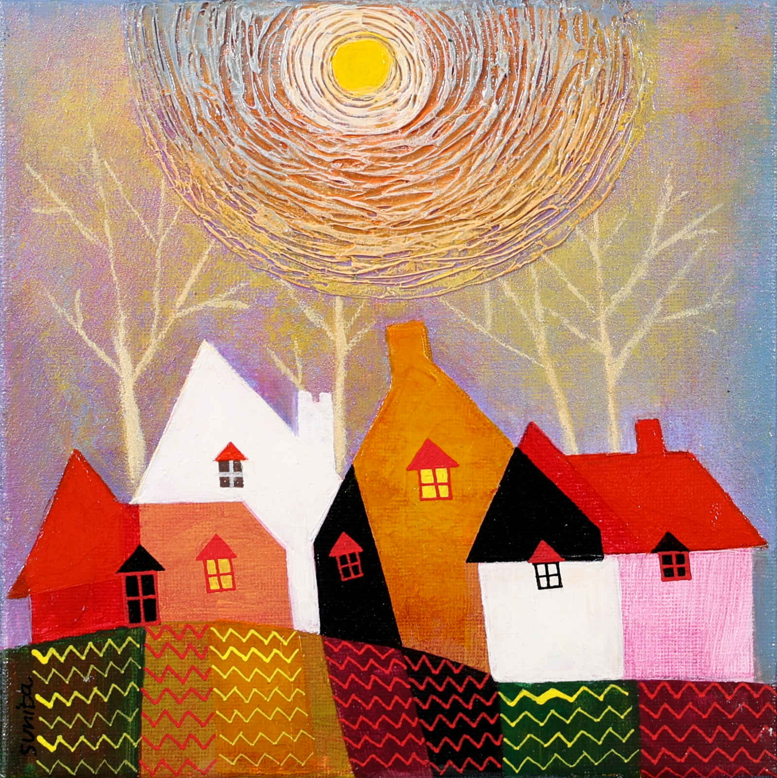A cute and colourful original painting by Indian born artist Sunita Khedekar. Sunita invites us to enjoy her magical world in this naïve style painting. Presented framed in contemporary black tray frame and ready to hang.