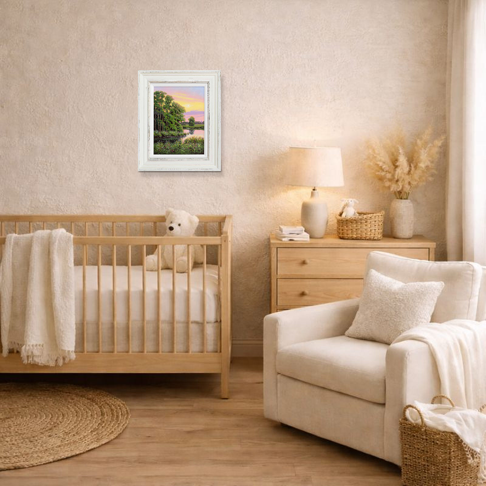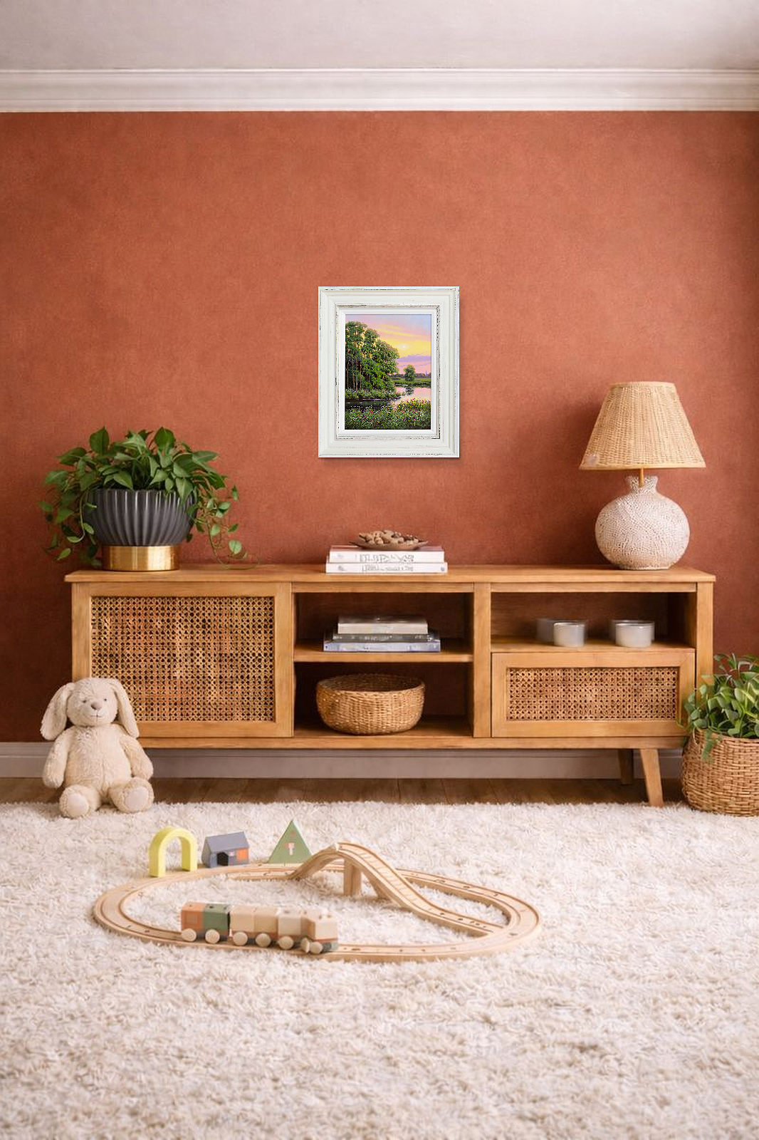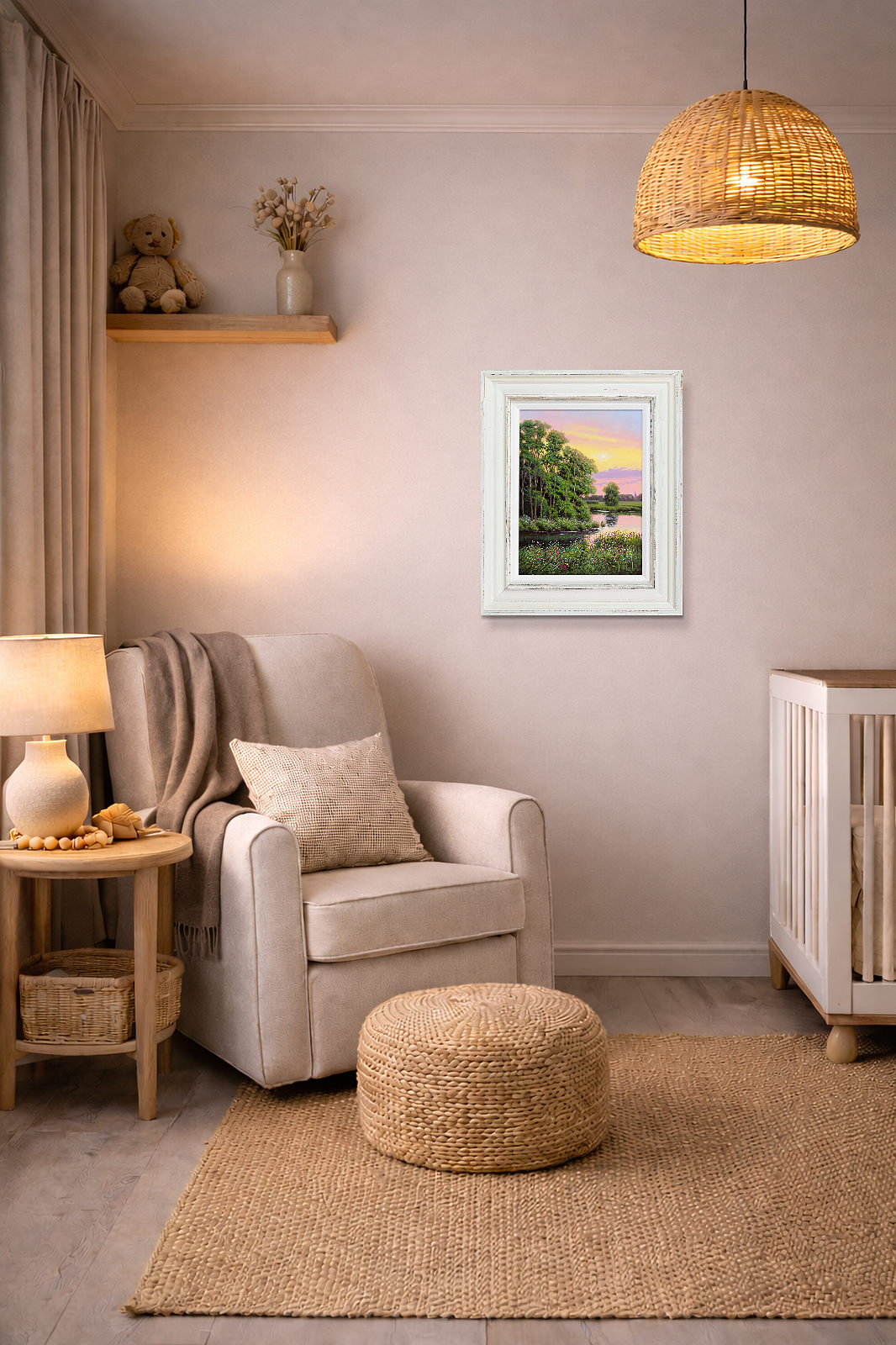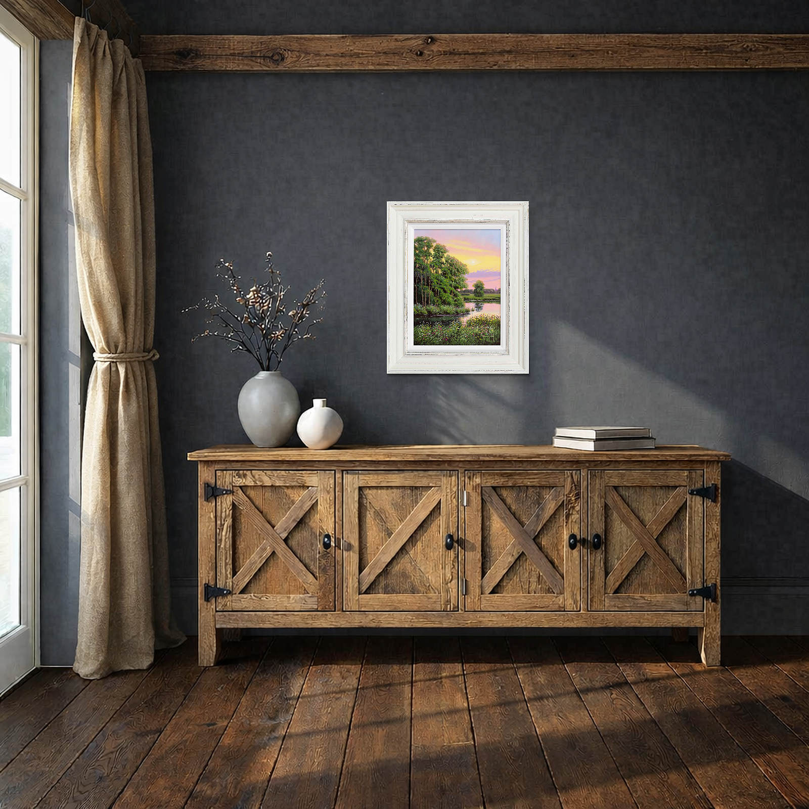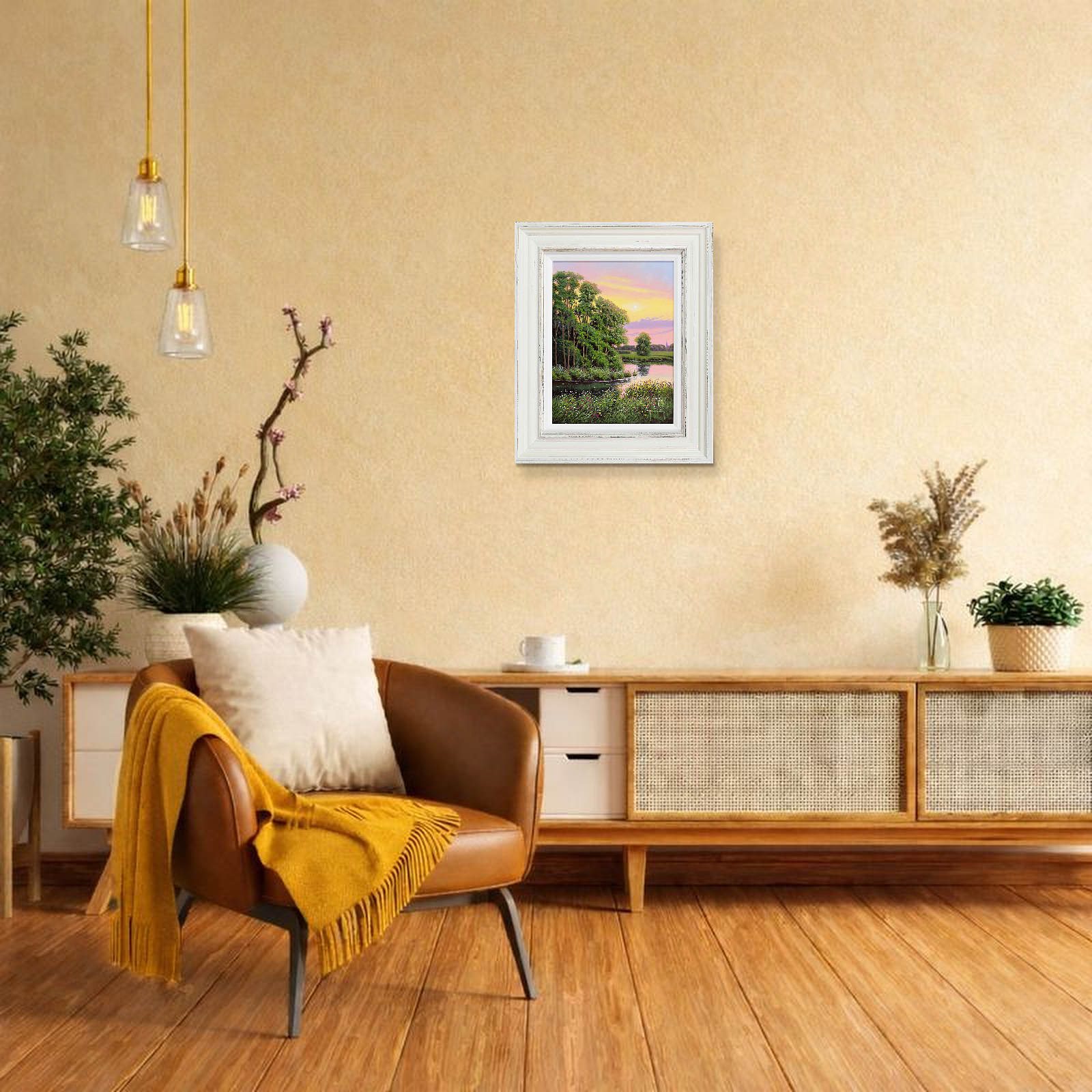 A tranquil lake scene at sunset painted by Terence Grundy. This original oil painting is presented in a bespoke rustic style frame and white slip as shown.