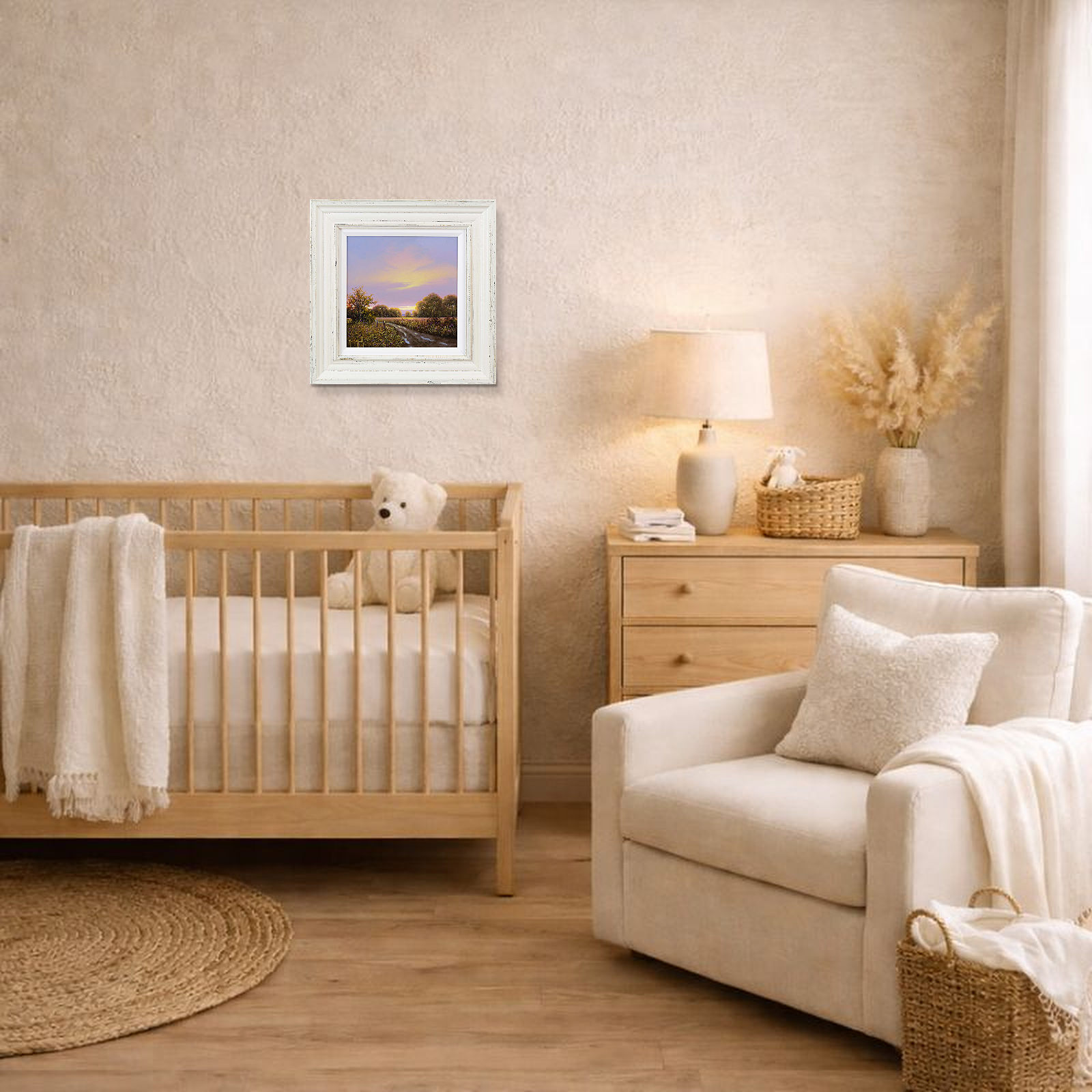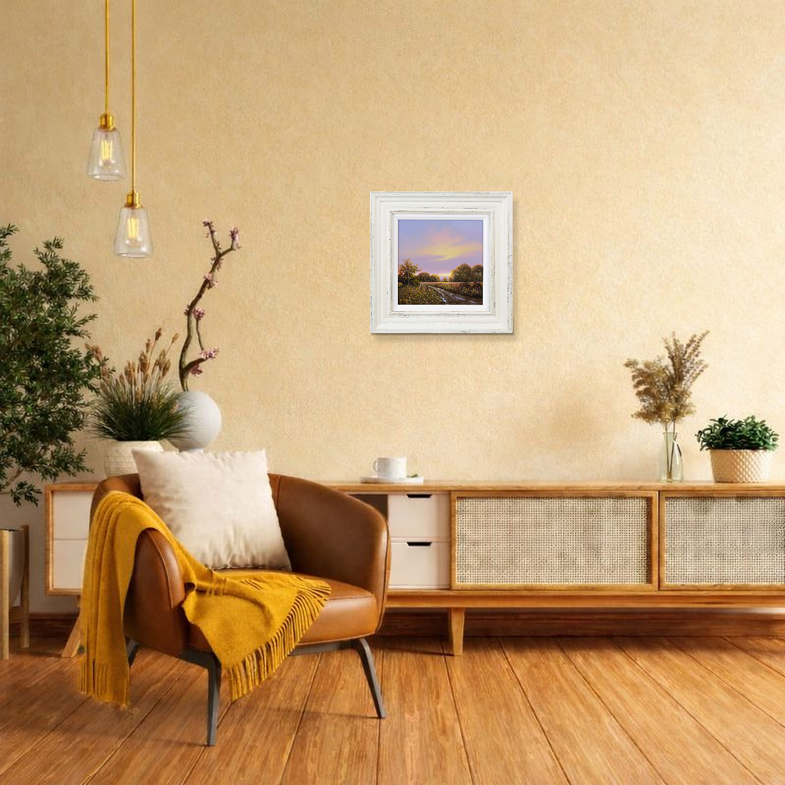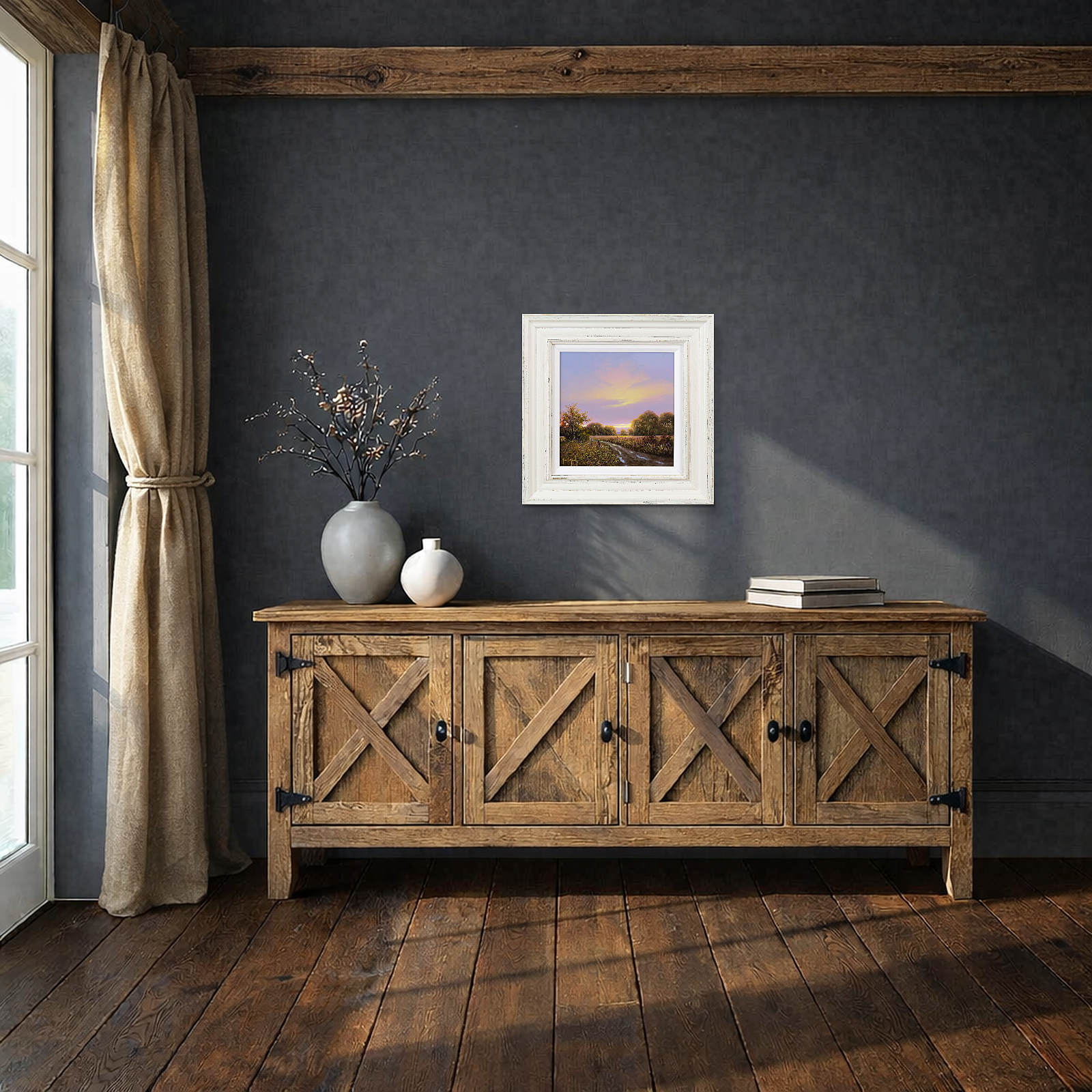 Quiet country track leads towards the setting sun in this original oil painting by Terence Grundy. Presented in a bespoke rustic edged frame and white slip as shown and ready to hang.