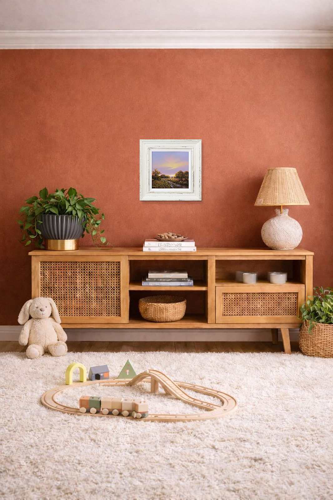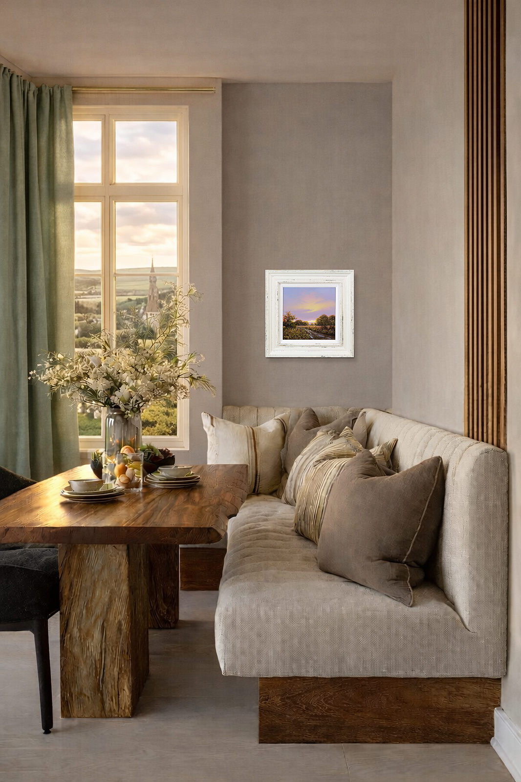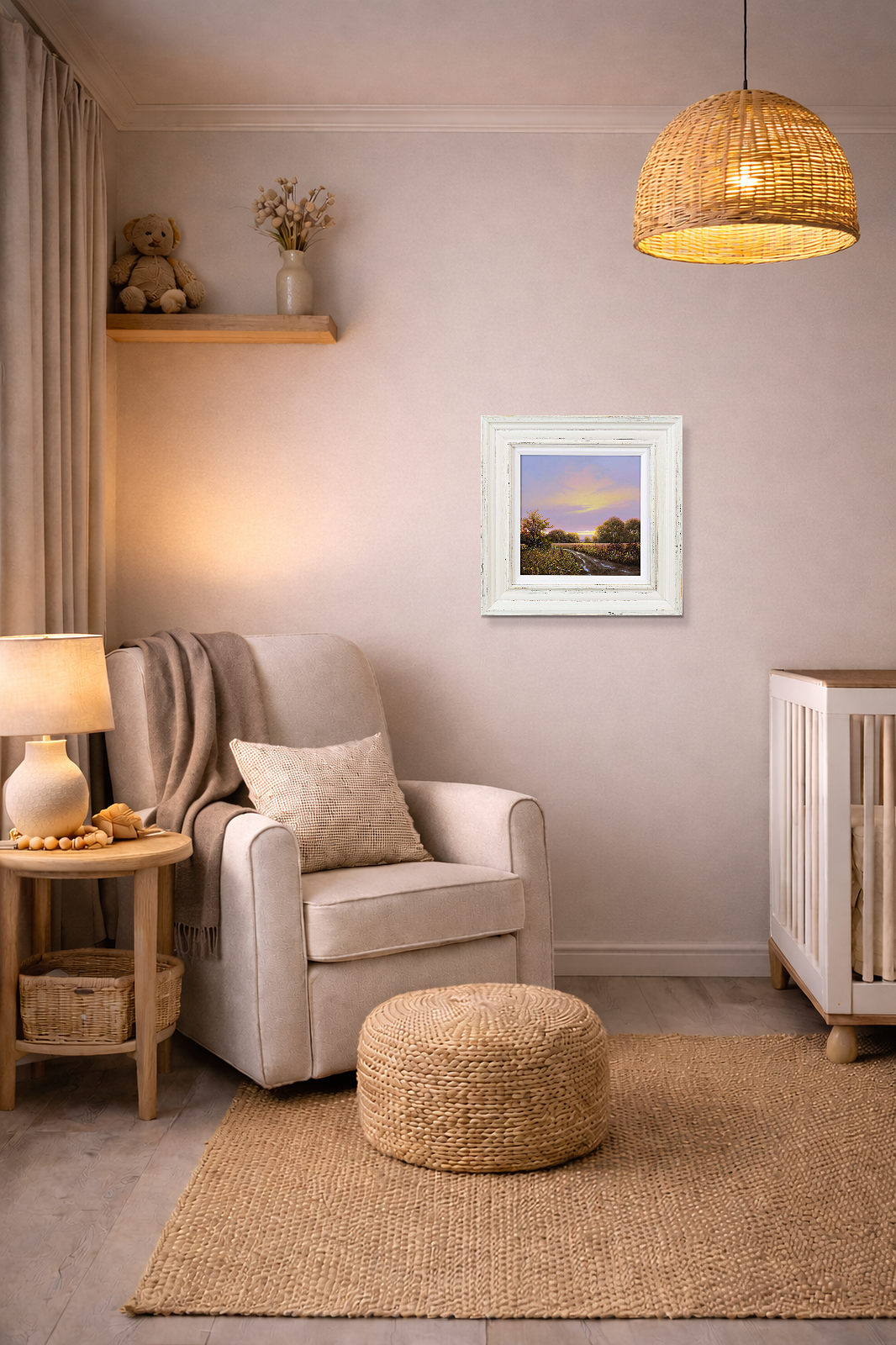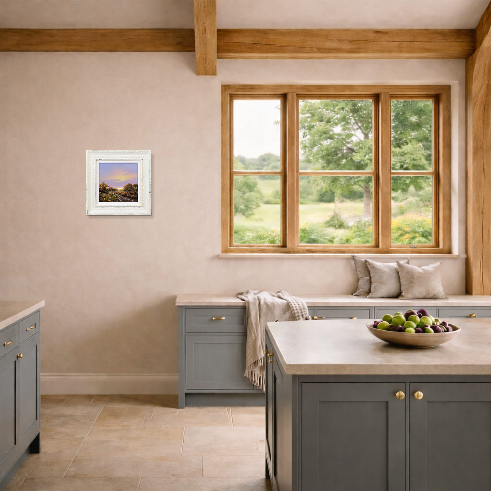 Quiet country track leads towards the setting sun in this original oil painting by Terence Grundy. Presented in a bespoke rustic edged frame and white slip as shown and ready to hang.