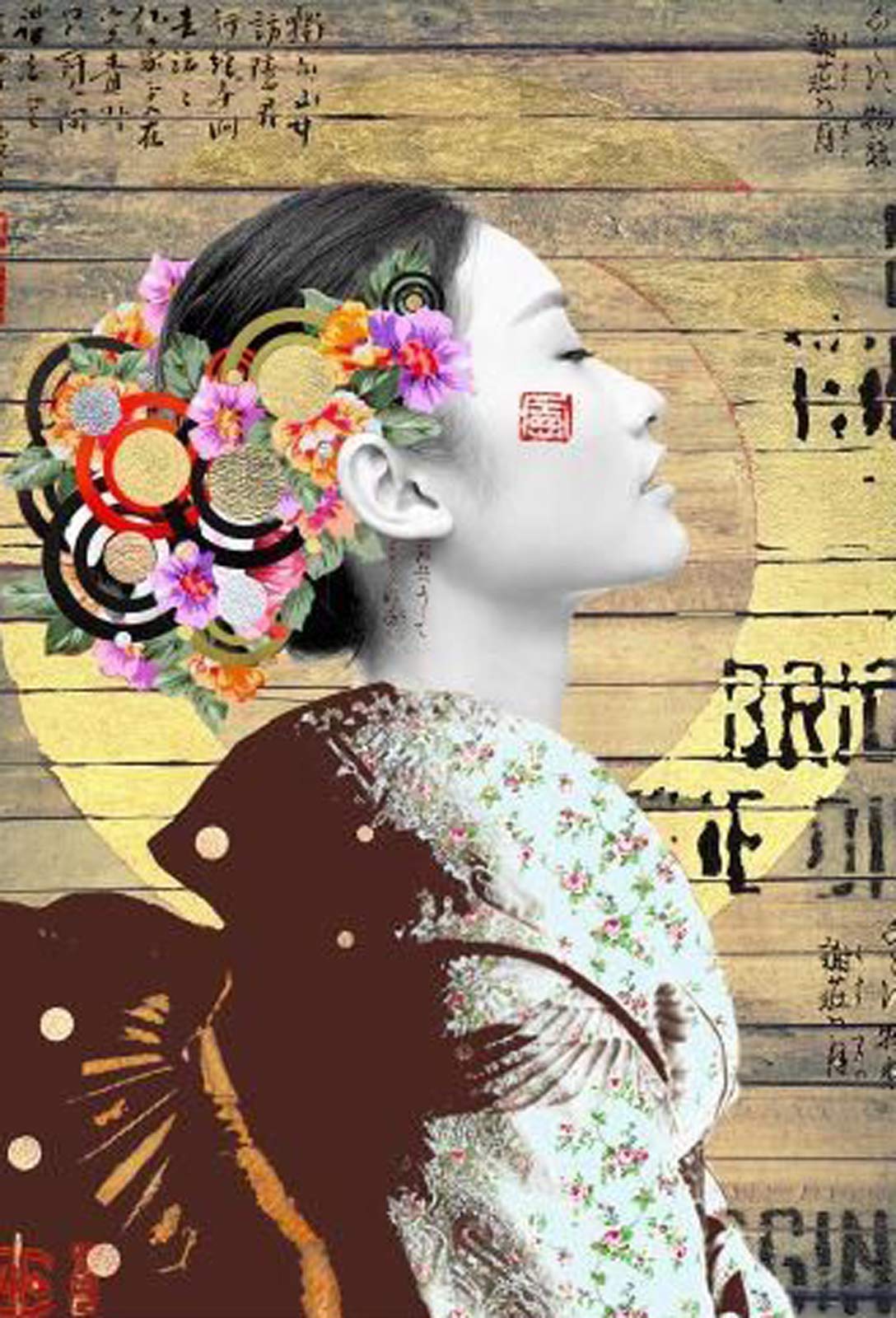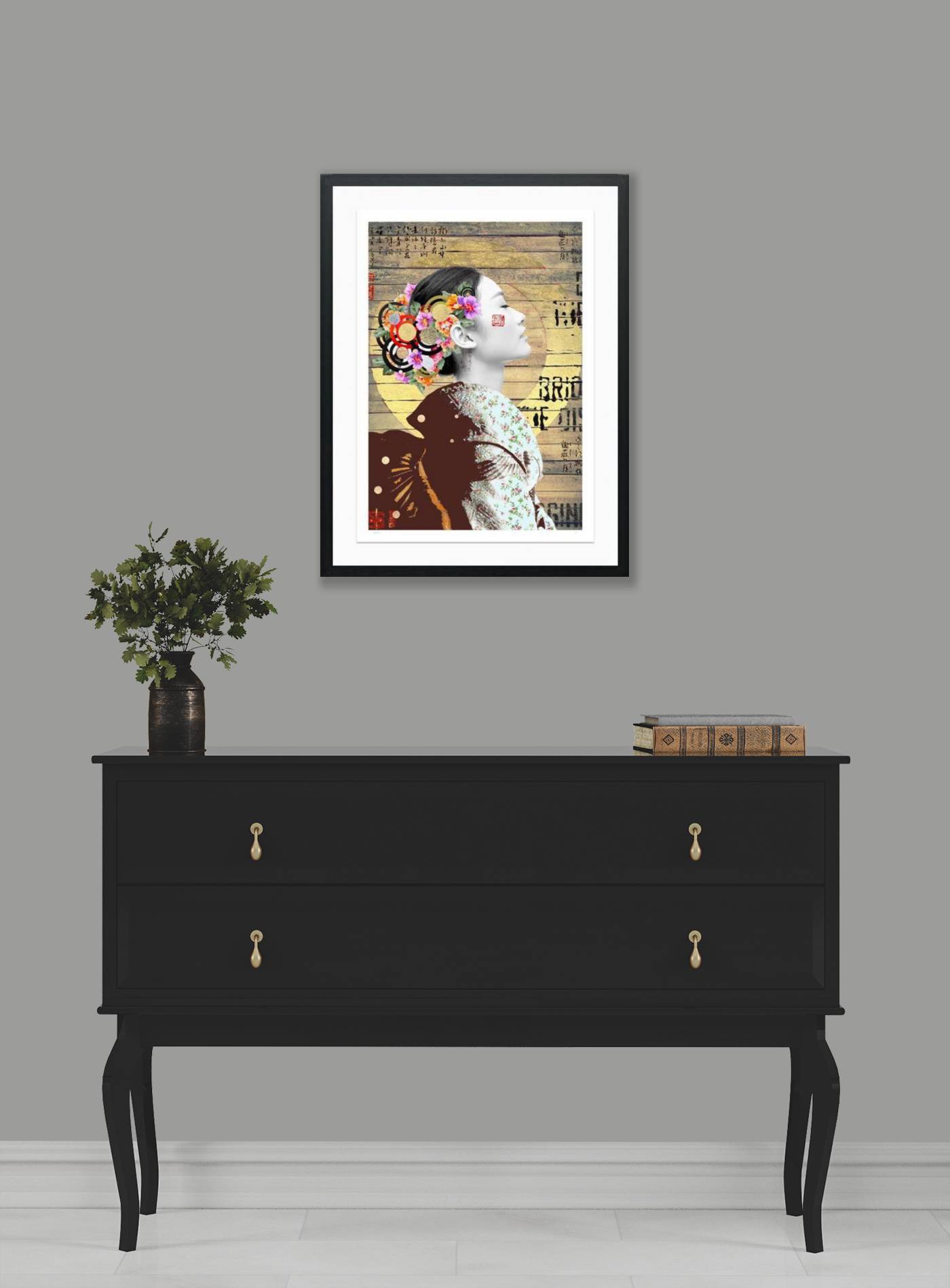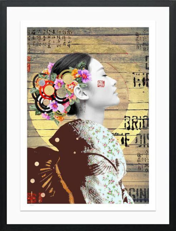 Gorgeous figurative artwork by Gareth Tristan Evans (The Trunk of Funk). This artwork is a limited edition on 315 gram Soft Textured Cotton fine art paper (edition of 75), presented framed as shown and ready to hang. Each artwork is finished with 24 carat gold leaf and vintage Japanese Hanko stamp.