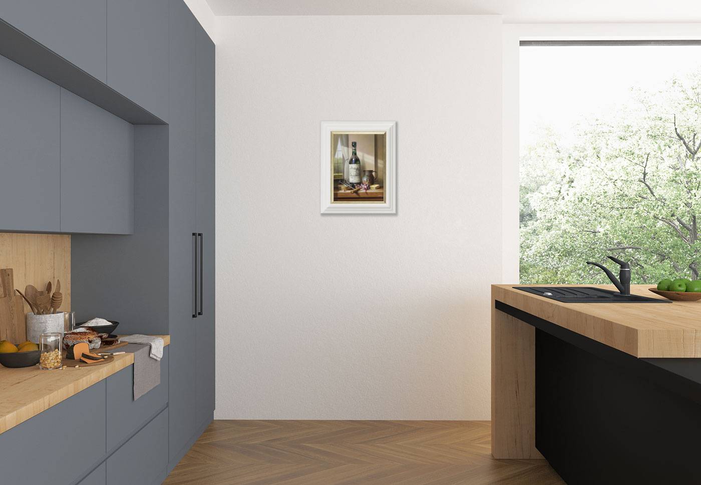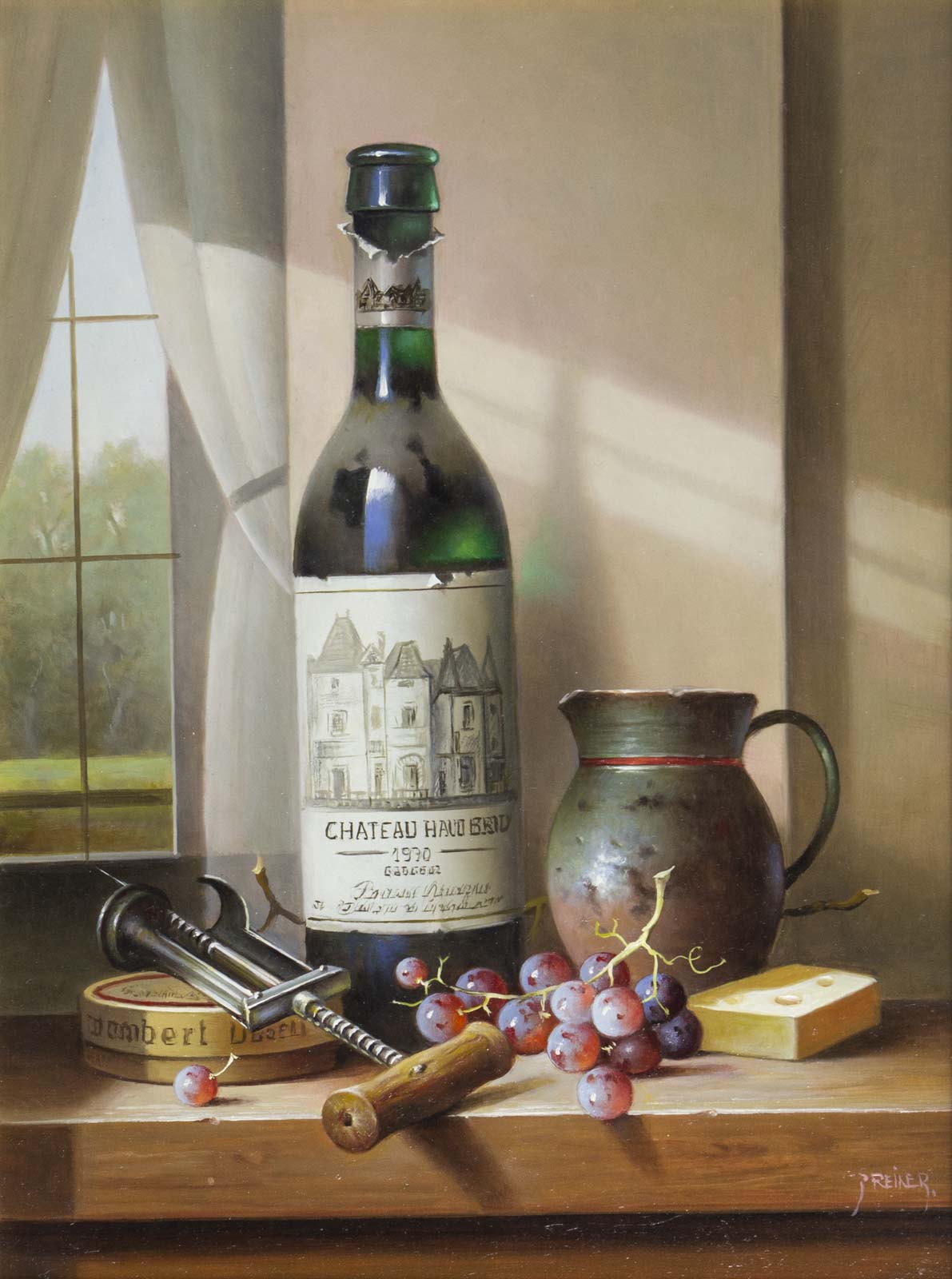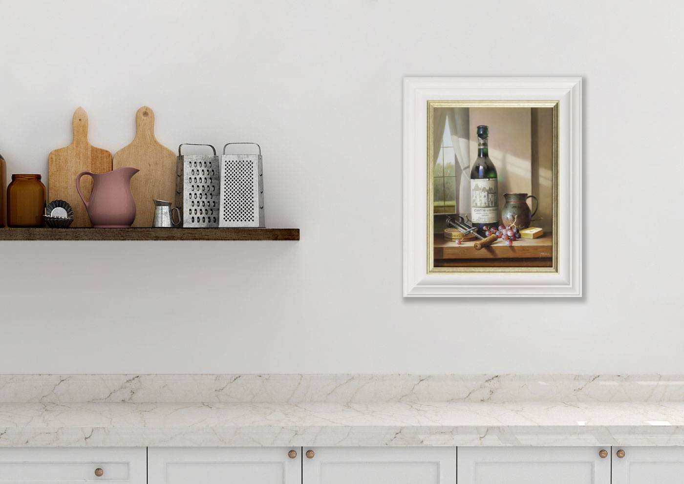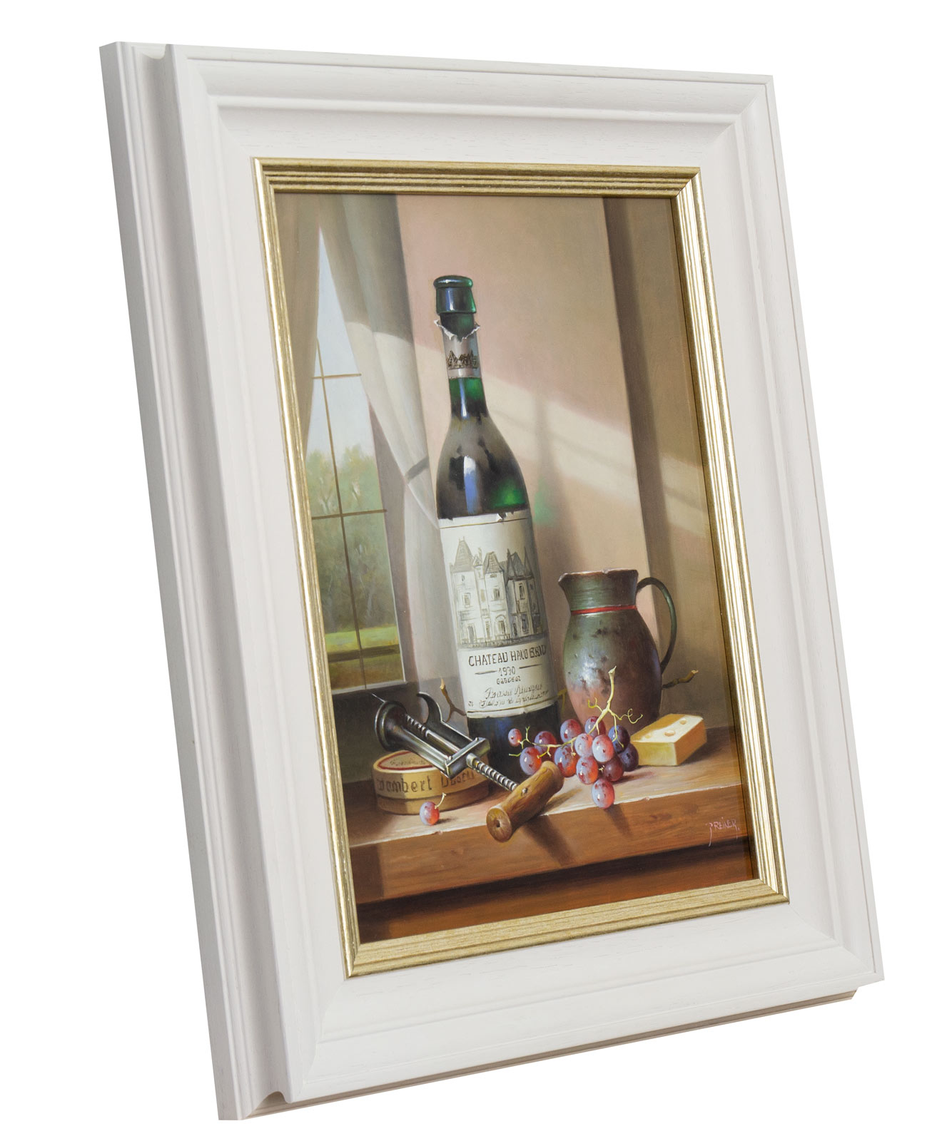 A wonderfully detailed still life painting of a bottle of Château Haut-Brion. Framed with a painted frame and golden trim as shown and ready to hang.
