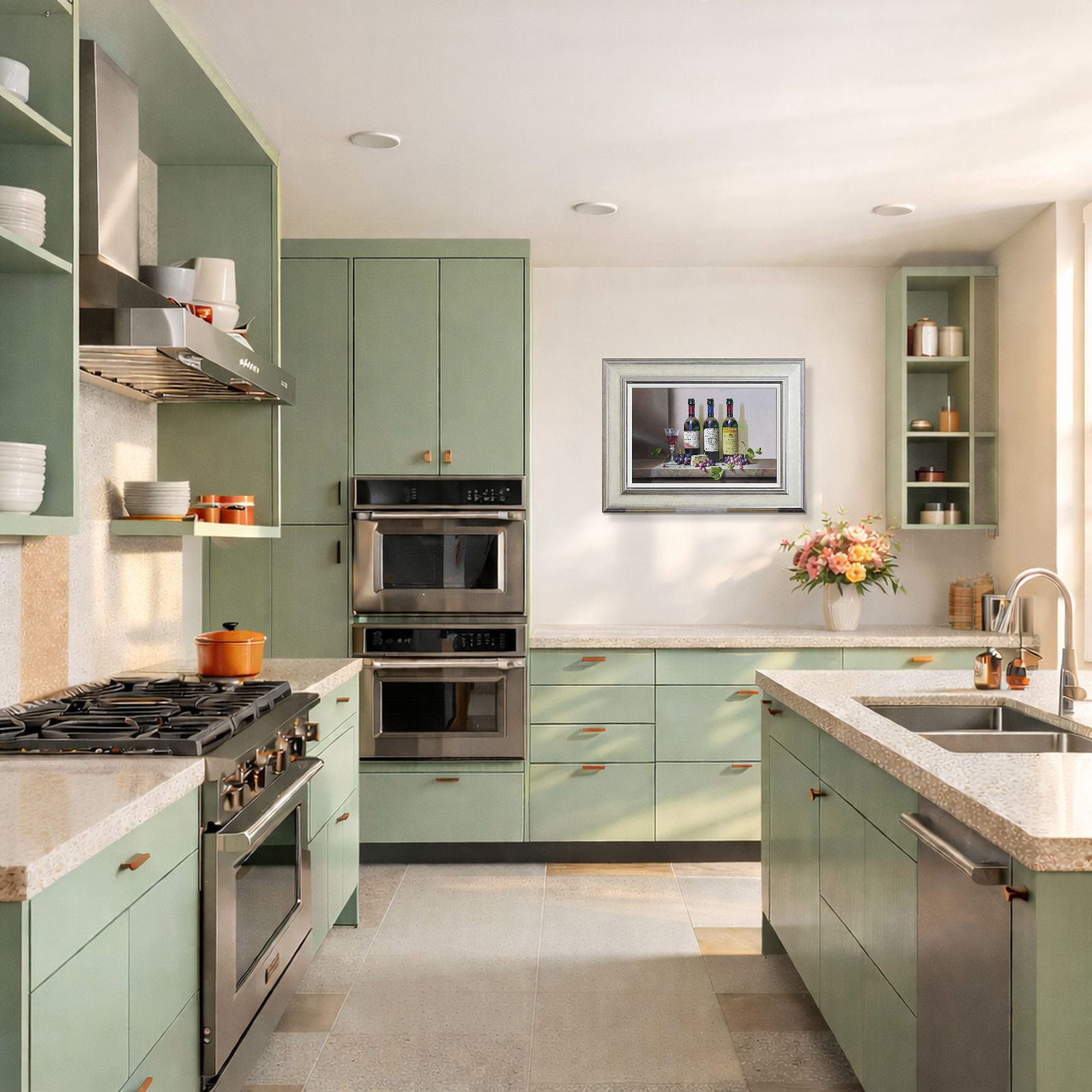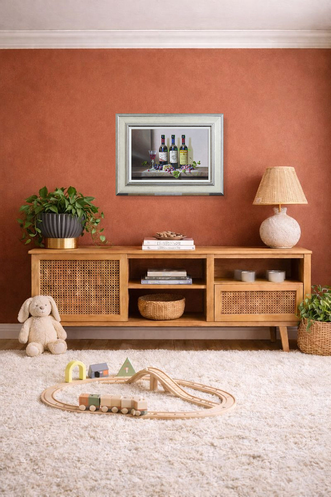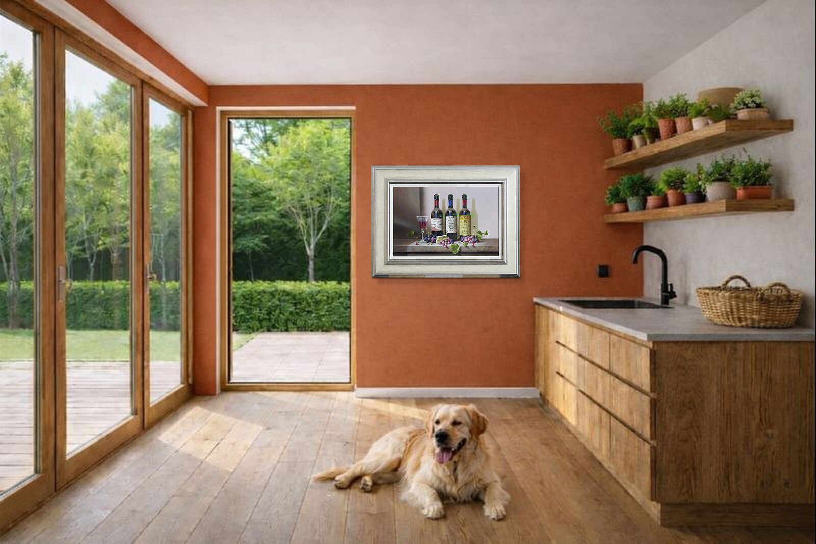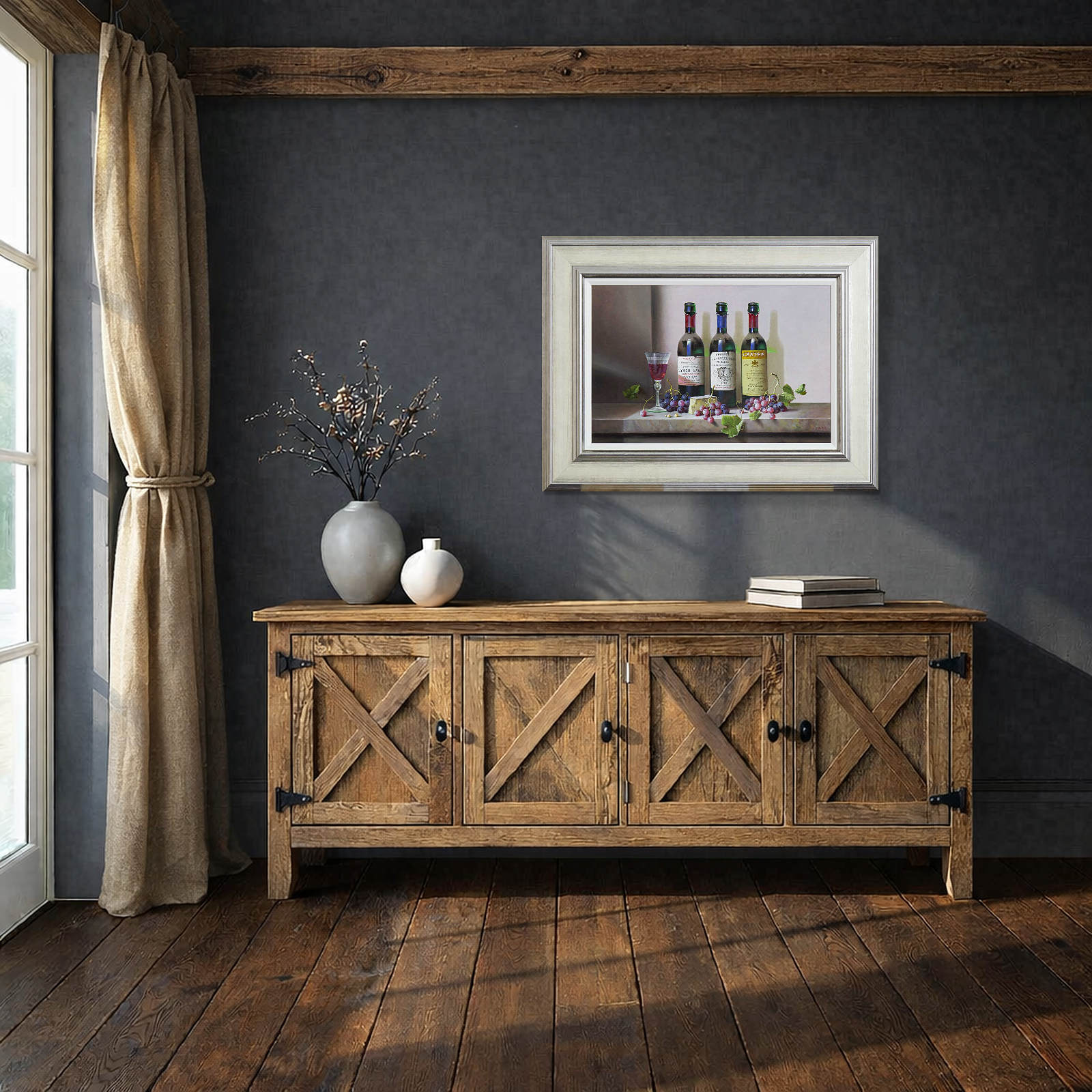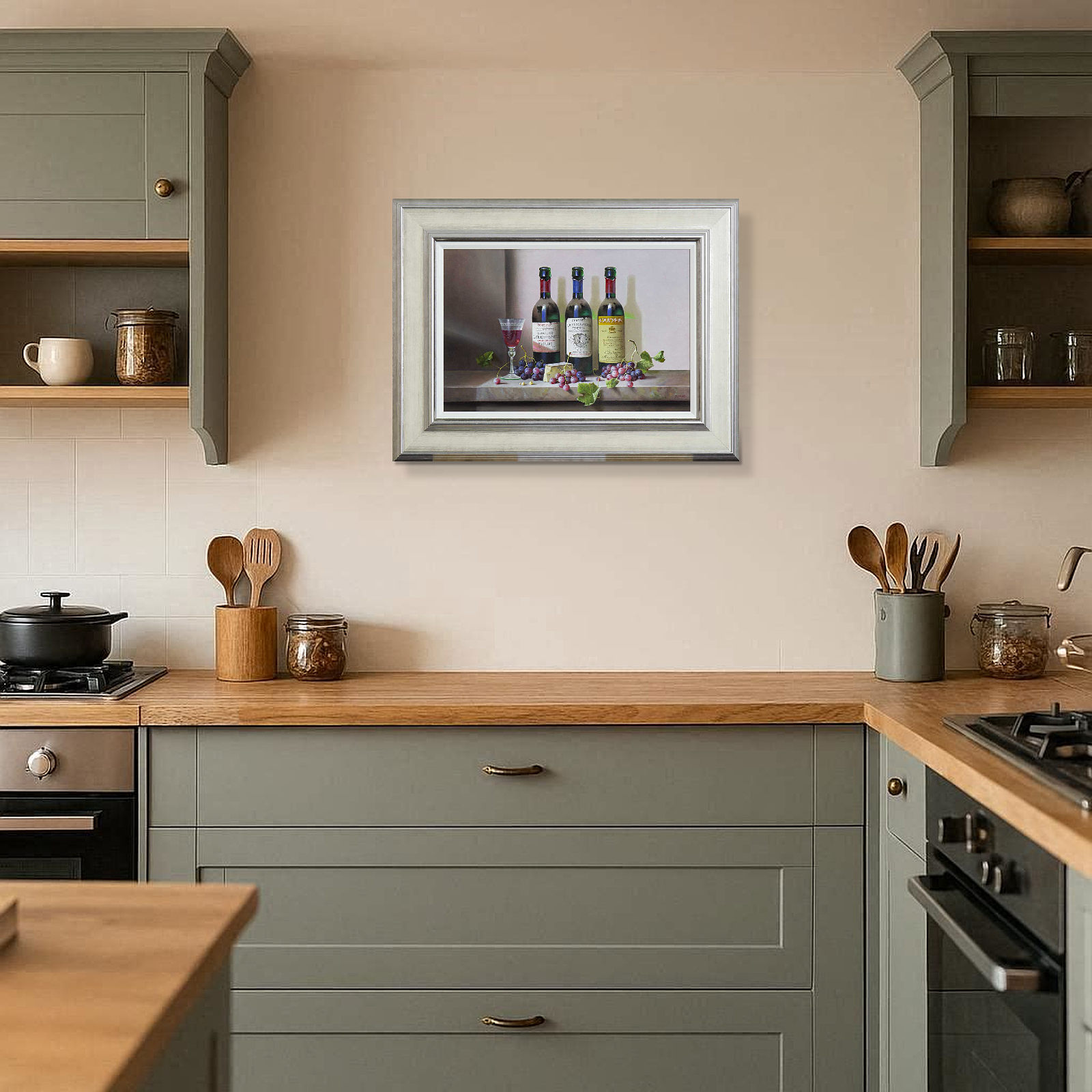 A trio of French wines feature in this detailed still life painting by Zoltan Preiner. Presented in silver frame and white slip as shown and ready to hang.