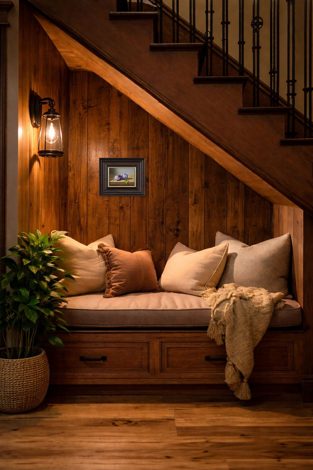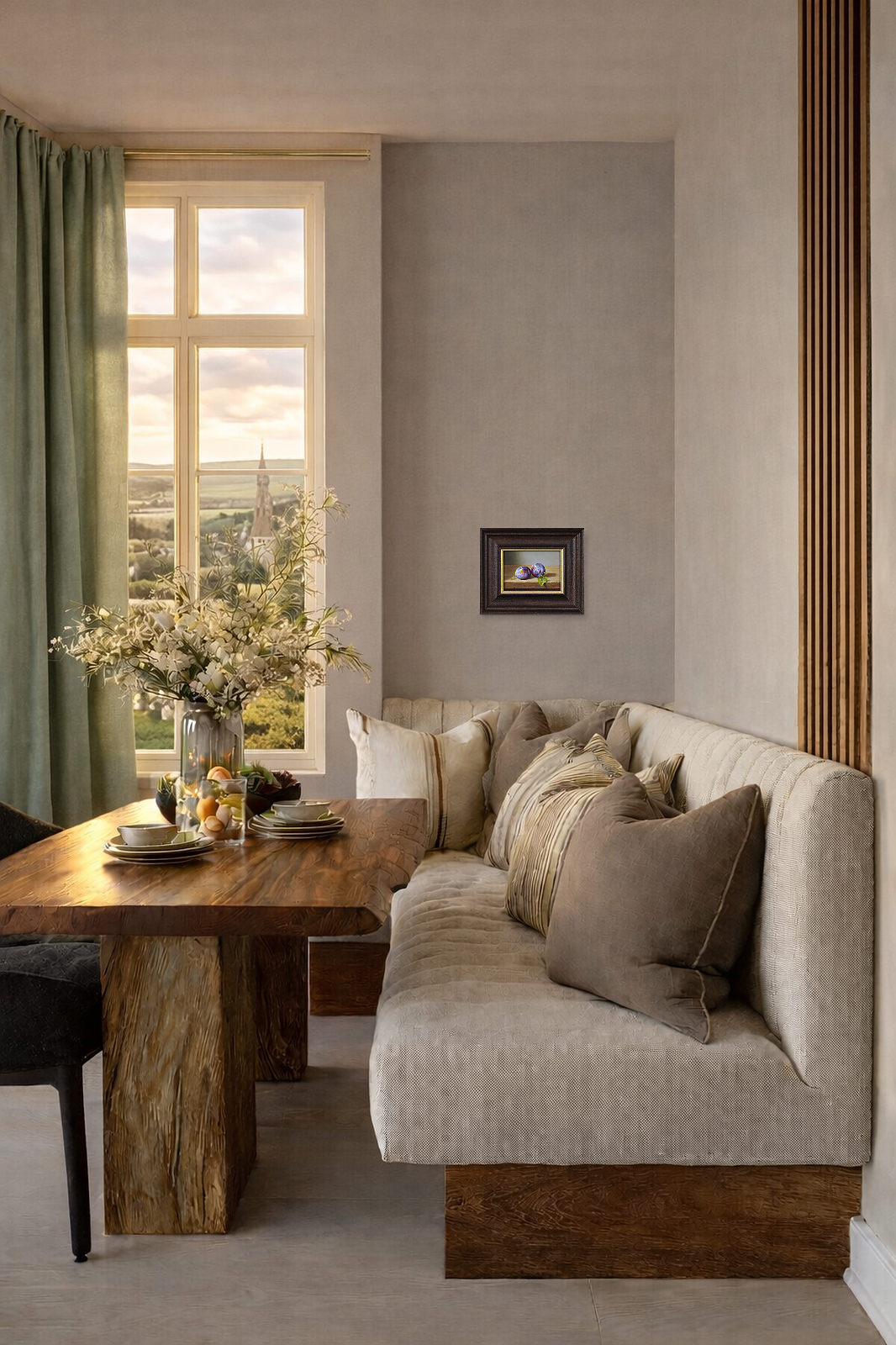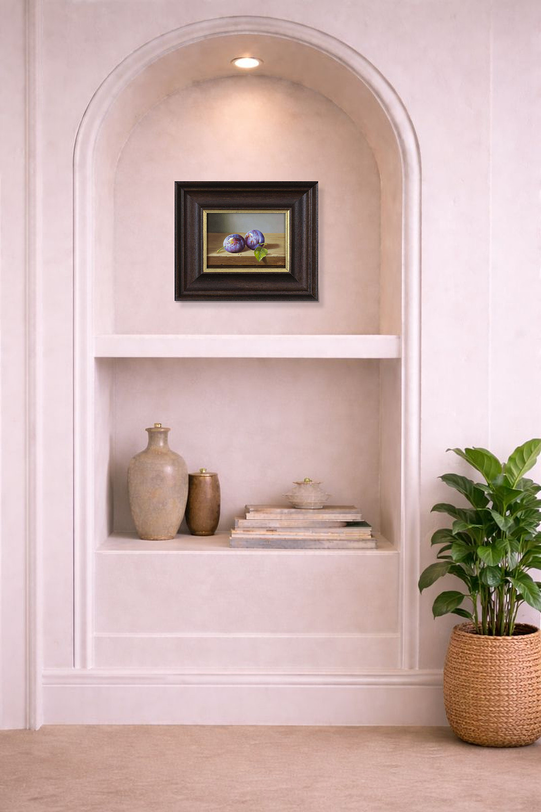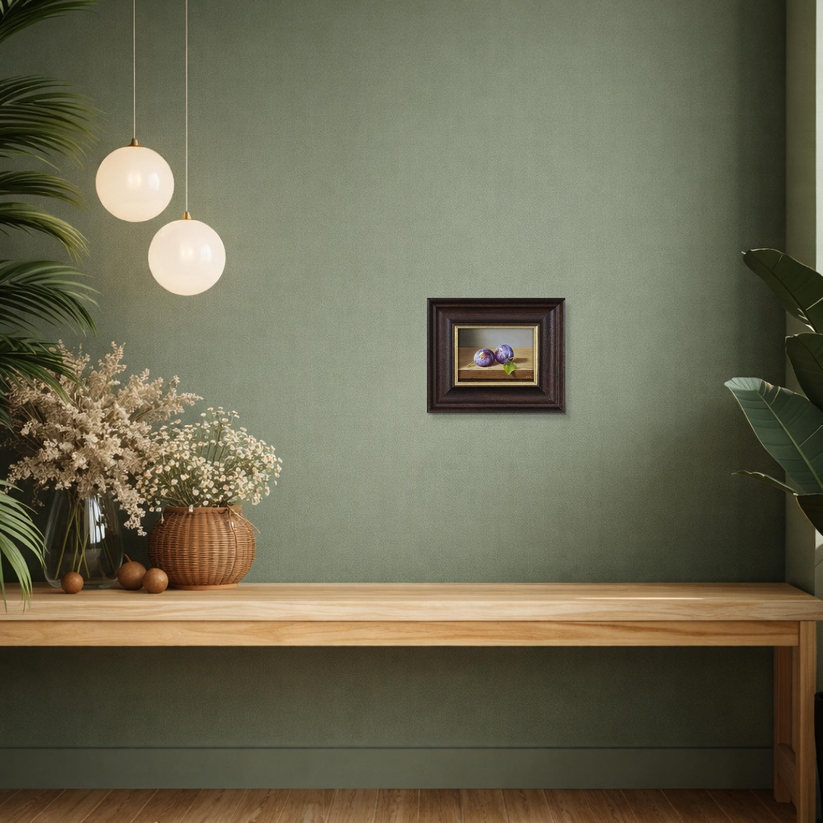 Original oil painting of a detailed still life scene featuring a pair of plums. Presented framed in a bespoke dark frame with gold edge as shown and ready to hang.