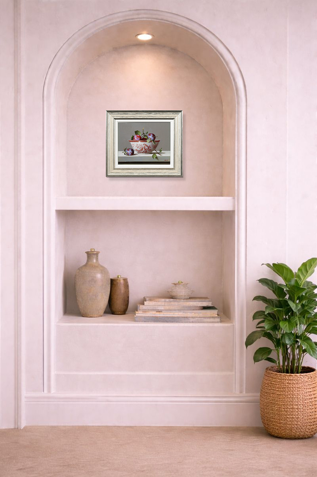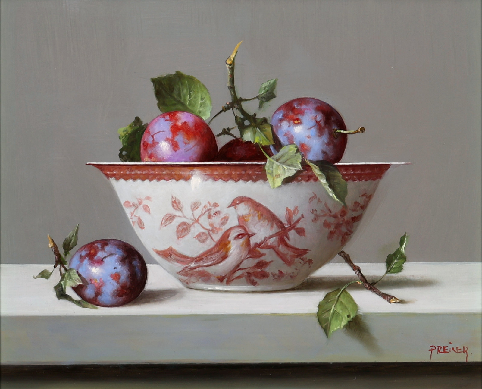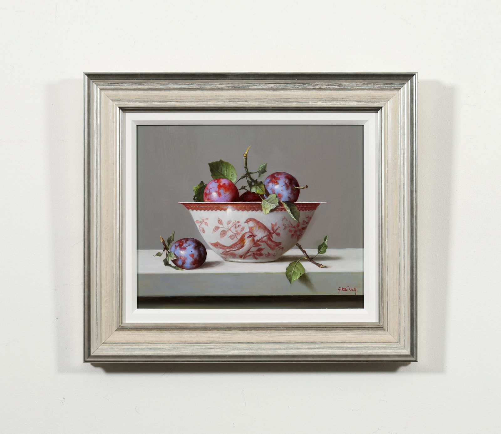 Beautiful original oil on panel by Zoltan Preiner featuring a finely observed plums in a porcelain bowl. Executed with exceptional realism and subtle tonal control, the composition highlights texture, light and natural form with quiet elegance. Presented in a silver frame with white slip as shown and ready to hang — perfect for that smaller space.